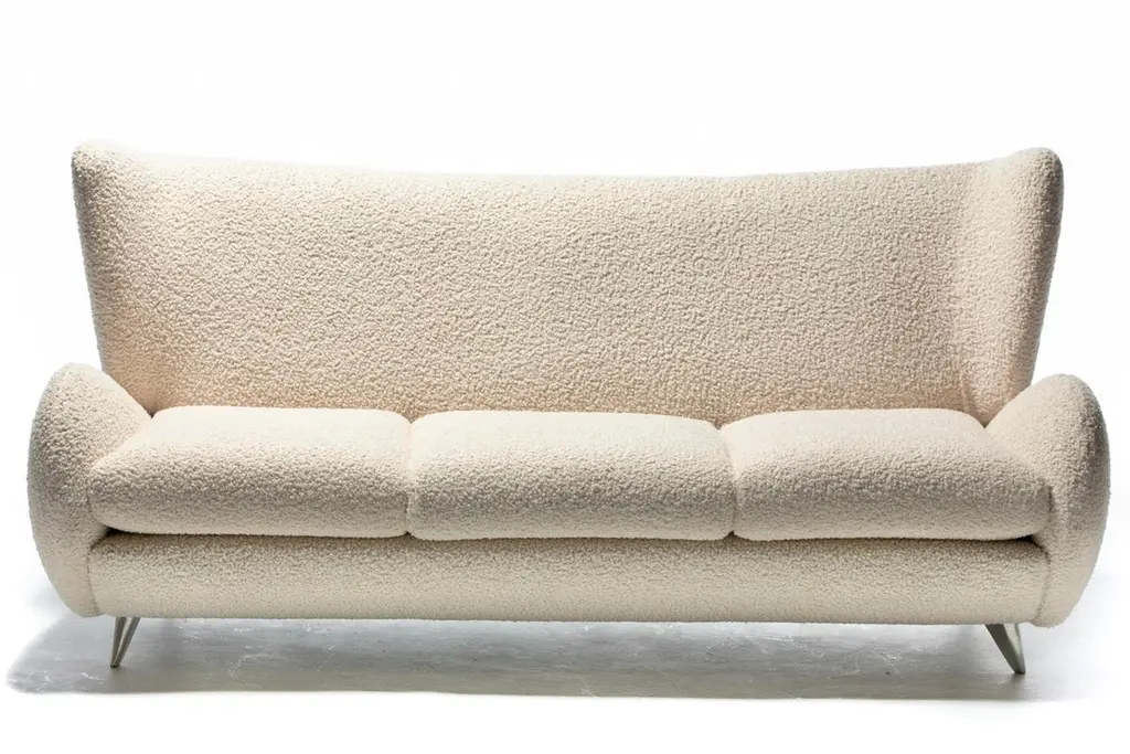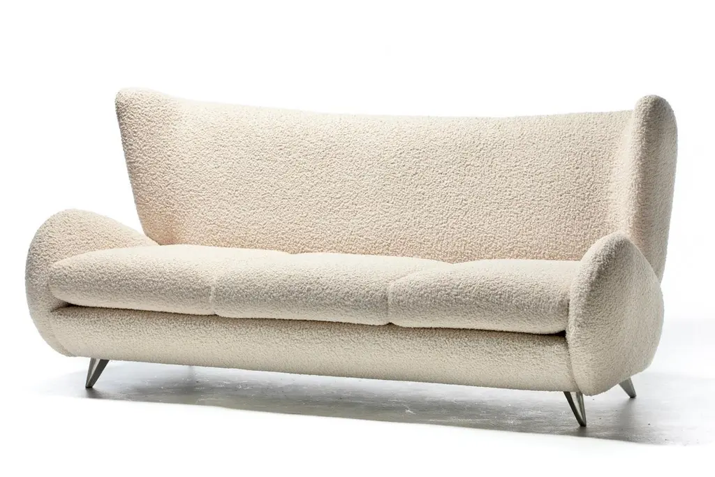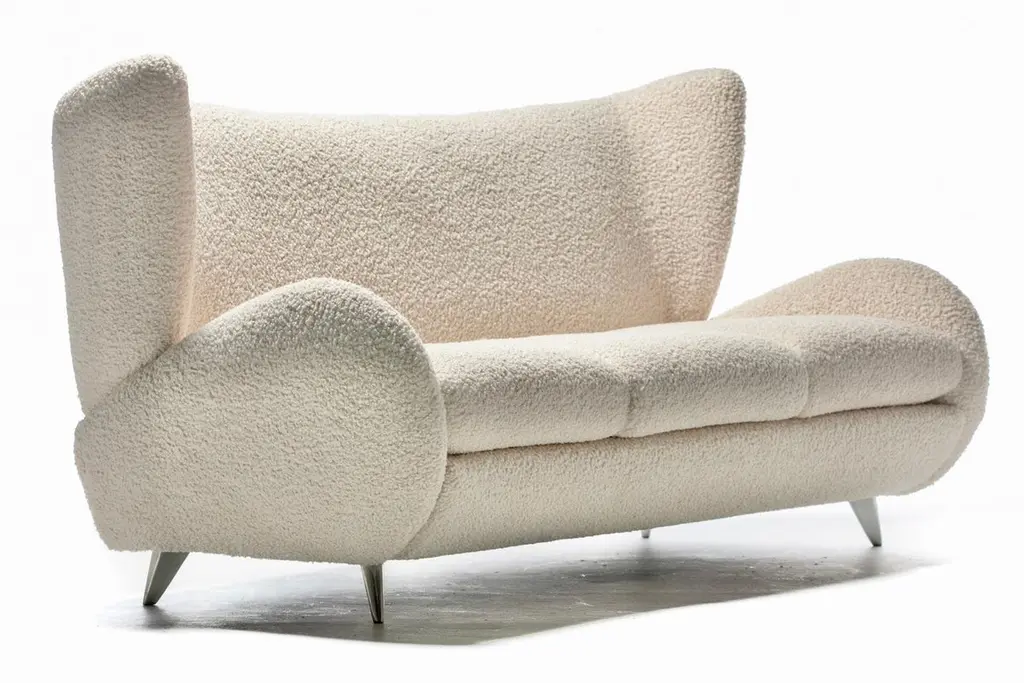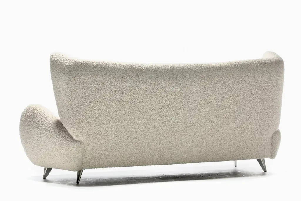 A love for his 1950s wingback design motivated Vladimir Kagan to circle back and produce a more contemporary version he later named the Fiftyish Sofa. Vladimir Kagan's tendency to over emphasize curves is evident in this sofa's design. It's fresh. Modern. But true to that classic 1950s wingback silhouette. With fuller exaggerated arms and seat back, Vladimir Kagan seems to say, "You love that 1950s wingback design. Here's that and more." Timelessly stylish. Seat back wings add a sense of privacy and its angle invite you to recline in surround comfort. The sofa's arms are comfortable and angled to compliment the seat back and create natural alignment. Stainless steel legs now replace traditional walnut legs. Without a doubt, Vladimir Kagan's Fiftyish sofa emphasizes the best features of his beloved 1950s Wingback design. This Fiftyish Sofa was newly professionally reupholstered in super soft ivory white bouclé rated highly durable. The fabric's texture ventilates well and is a great choice for both warm and cooler climates. This Vladimir Kagan Sofa mixes incredibly well with most styles of decor. Its sculptural look stands on its own and is classic. Its size makes it a perfect choice for adding high design into condominiums, apartments or smaller living spaces. Only one available, globally. Ready to ship. Pair Available. Want to see more beautiful things? Scroll down below and click "View All From Seller" or favorite our shop to get your 1stDibs on our new inventory.Photographed with and also currently available in our shop-Preview Tri-Leg Lounge Chairs in Ivory BoucléPost Modern Ottoman in Ivory BoucléCalifornia Redwood Live Edge Table on Lucite Base