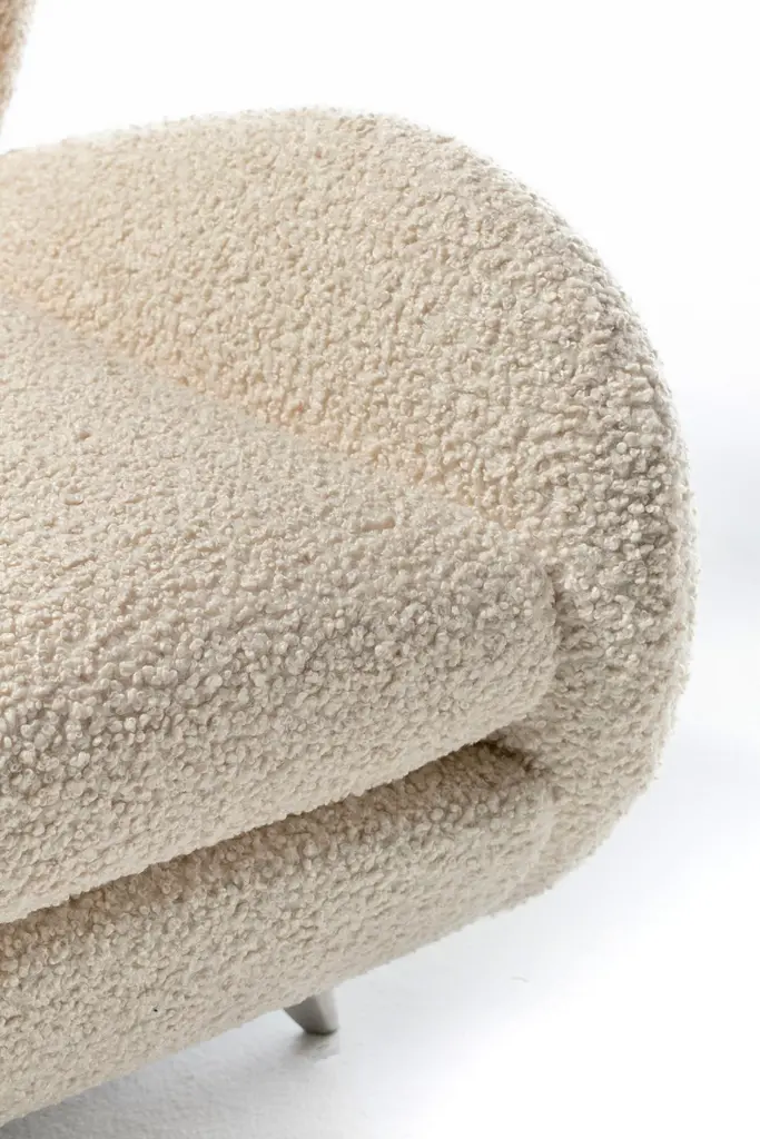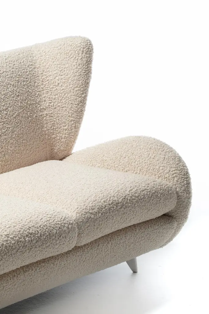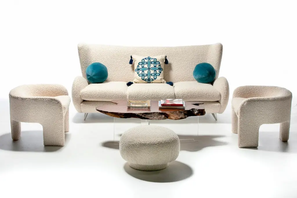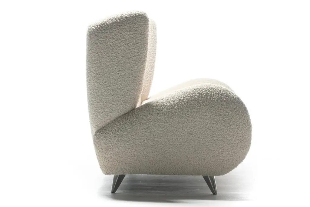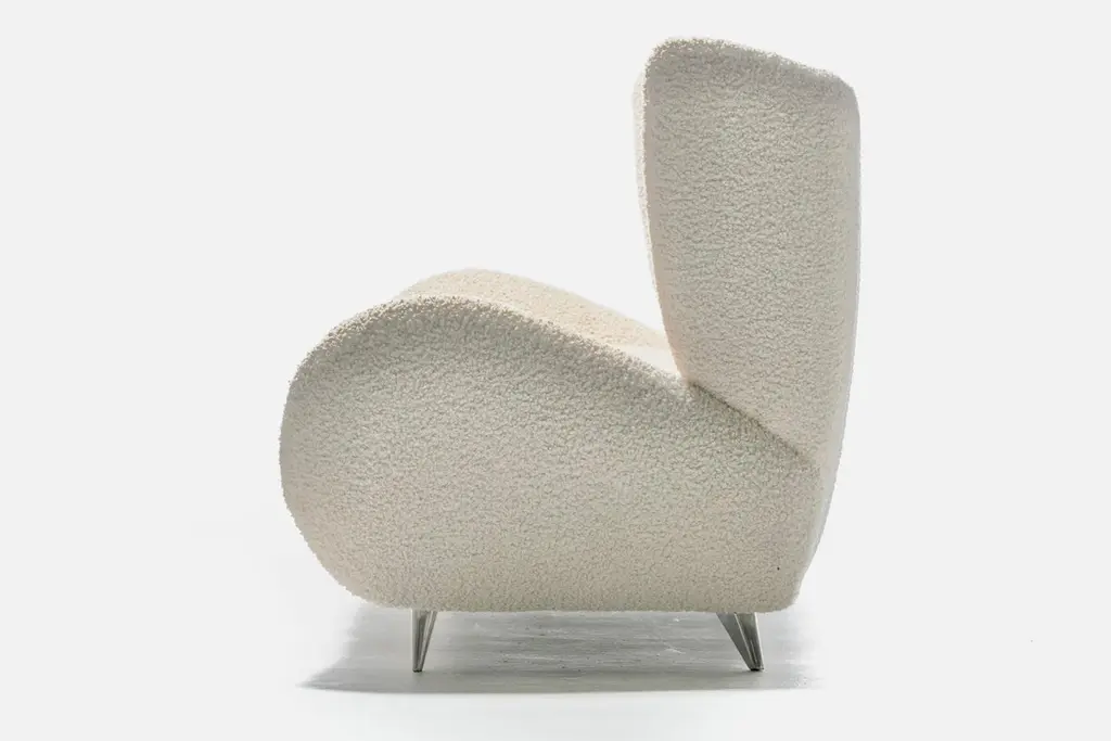 A love for his 1950s wingback design motivated Vladimir Kagan to circle back and produce a more contemporary version he later named the Fiftyish Sofa. Vladimir Kagan's tendency to over emphasize curves is evident in this sofa's design. It's fresh. Modern. But true to that classic 1950s wingback silhouette. With fuller exaggerated arms and seat back, Vladimir Kagan seems to say, "You love that 1950s wingback design. Here's that and more." Timelessly stylish. Seat back wings add a sense of privacy and its angle invite you to recline in surround comfort. The sofa's arms are comfortable and angled to compliment the seat back and create natural alignment. Stainless steel legs now replace traditional walnut legs. Without a doubt, Vladimir Kagan's Fiftyish sofa emphasizes the best features of his beloved 1950s Wingback design. This Fiftyish Sofa was newly professionally reupholstered in super soft ivory white bouclé rated highly durable. The fabric's texture ventilates well and is a great choice for both warm and cooler climates. This Vladimir Kagan Sofa mixes incredibly well with most styles of decor. Its sculptural look stands on its own and is classic. Its size makes it a perfect choice for adding high design into condominiums, apartments or smaller living spaces. Only one available, globally. Ready to ship. Pair Available. Want to see more beautiful things? Scroll down below and click "View All From Seller" or favorite our shop to get your 1stDibs on our new inventory.Photographed with and also currently available in our shop-Preview Tri-Leg Lounge Chairs in Ivory BoucléPost Modern Ottoman in Ivory BoucléCalifornia Redwood Live Edge Table on Lucite Base