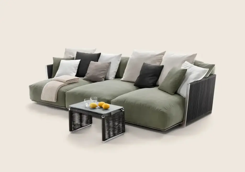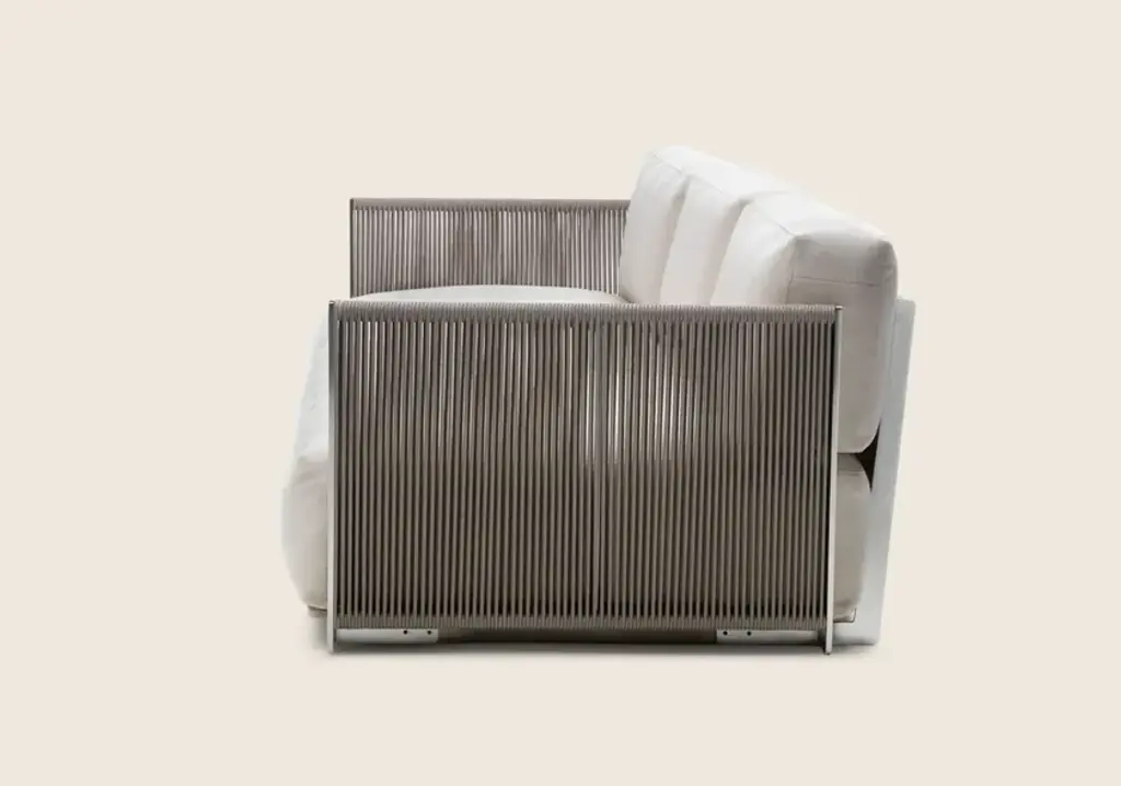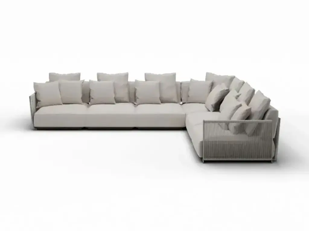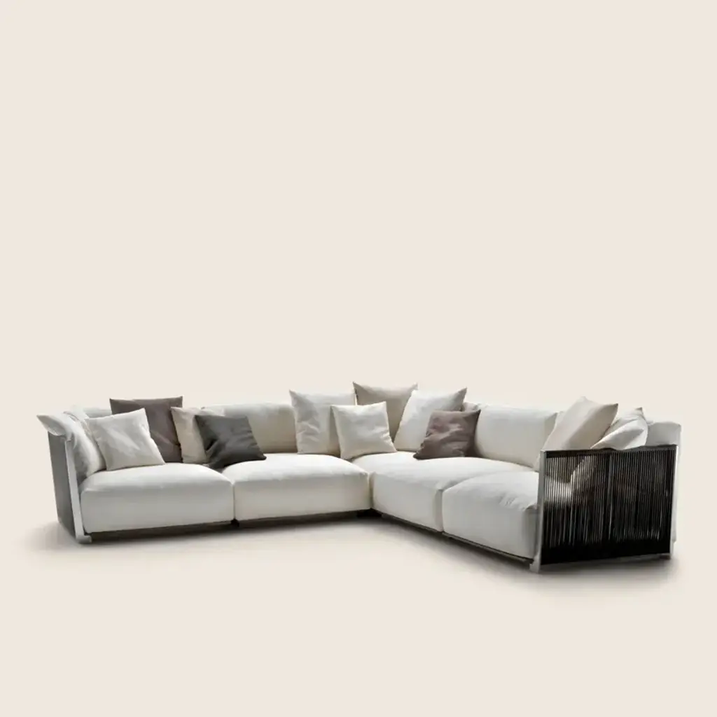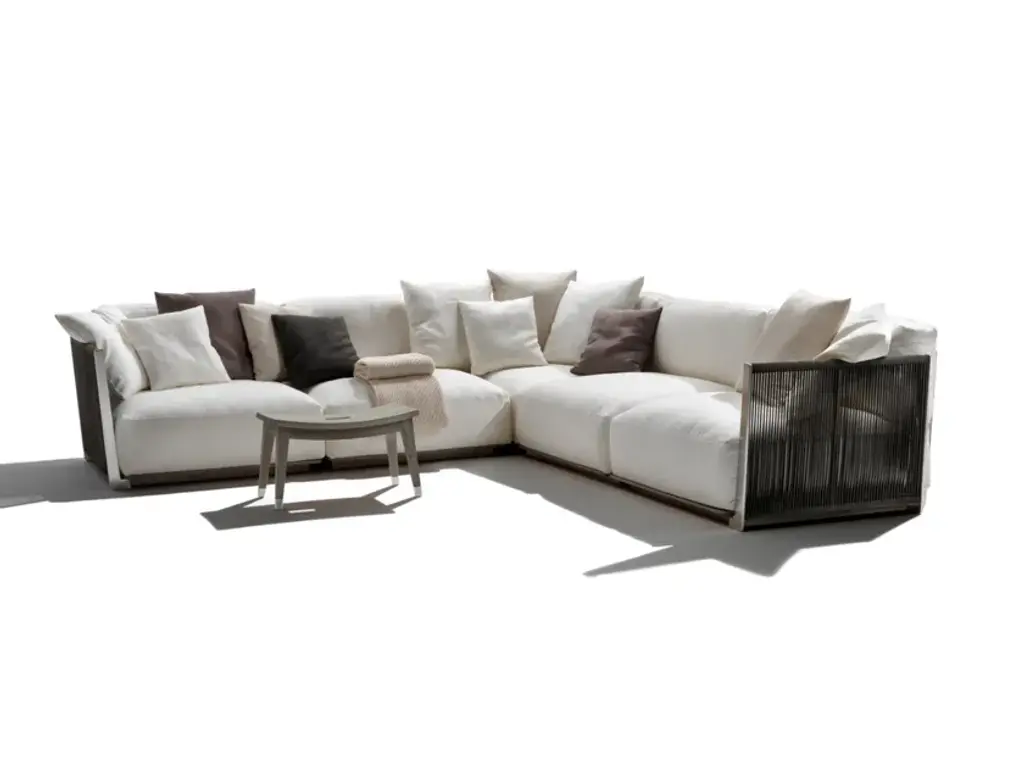 VULCANO OUTDOOR is a modular sofa, available in 4 different compositions.FeaturesBackrest and armrest: made of stainless steel 316 with electropolished or powder-coated finishes in white 100, wine red 405, khaki green 705, burnished, matte titanium 710, or with a lacquered finish in textured colors: white 300, sand 310, brick 320, sage green 330, terracotta 325, forest green 335, charcoal 350. The weaving is made of extruded PVC with a nylon core in colors: anthracite 7005, bordeaux 7002, white 7007, cream 7001, brown 7004, green 7006; with polypropylene cord in colors: sand 8001, anthracite 8005, bordeaux 8002, green 8006, white 8007, brown 8004; or in matte polypropylene in colors: natural 8102, straw 8101, ice 8103, anthracite 8105.Base: made of stainless steel 316 with powder-coated finishes and a panel in compact laminated laminate. Ground support on thermoplastic material glides.Seat cushion: made of expanded polyurethane covered with a protective fabric with a water-repellent backing.Backrest cushion: made of expanded polyurethane and polyester fiber covered with a protective fabric with a water-repellent backing.Optional cushions: made of polyester fiber with a water-repellent cover. Optional cushions are available upon request for an additional cost.Covering: removable fabric.Cover: made of waterproof material, available upon request for an additional cost.MaterialsFrame: extruded PVC - metal - polypropylene cord.Covering: flame-retardant - outdoor fabrics.Vulcano is a collection of sofas characterized by weaving, a theme that is particularly dear to Flexform.The core themes of flexibility in composition and a high degree of customization, combined with passionate research into materials that ensure high performance in outdoor environments, form the foundation of the Vulcano sofa design.The base of the sofa is made of marine plywood, while the armrests and backrest structure are crafted from 316 austenitic stainless steel, a superalloy that guarantees excellent outdoor performance. These elements are covered in a sophisticated weave made of polypropylene fiber or polyurethane rubber, available in a refined color palette.The sofa rests on a perimeter frame made of 316 austenitic steel and nylon feet.To ensure optimal performance in the open air, all the cushions are covered with special water-repellent, breathable fabric covers, while the extensive textile collection offers excellent resistance not only to weather conditions and UV rays but also to chlorine and saltwater.It is strongly recommended to use the appropriate covers to keep the sofas in good condition and preserve their original state as much as possible.