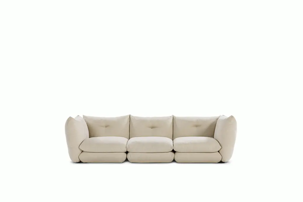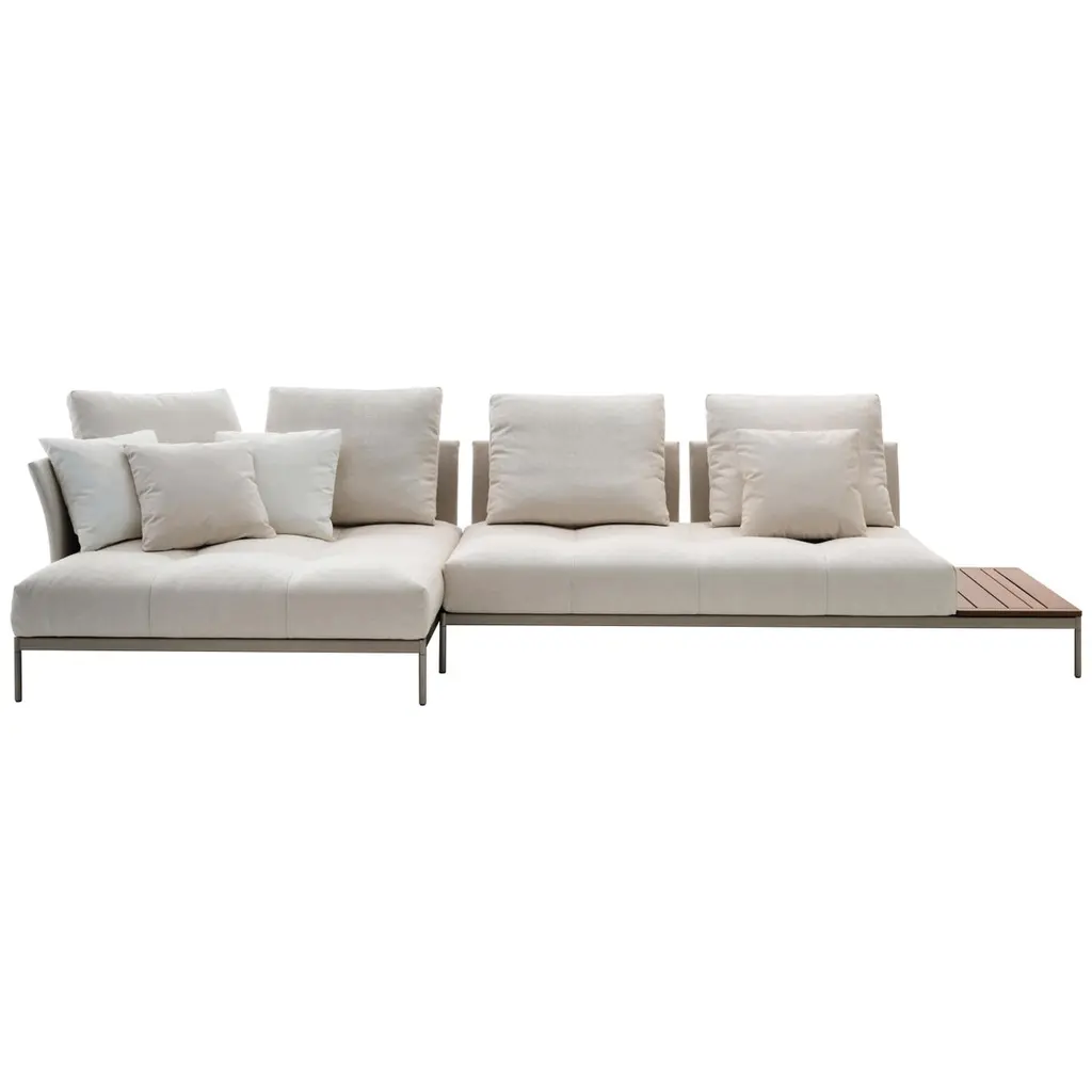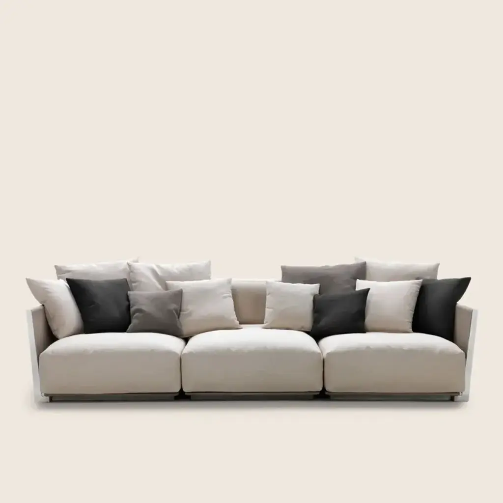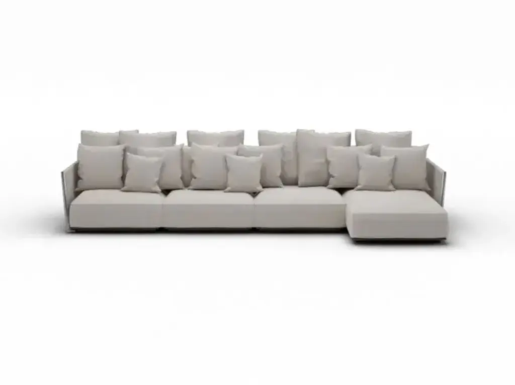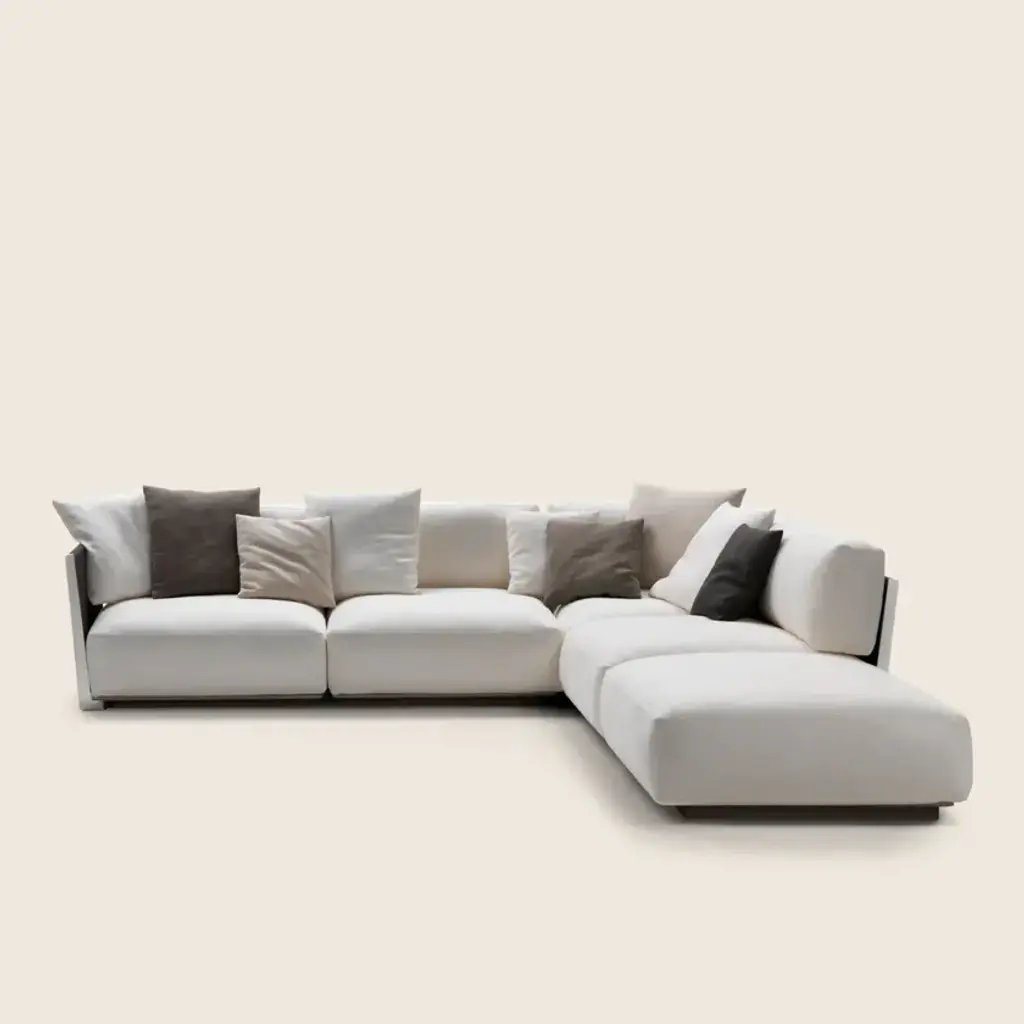 VULCANO OUTDOOR is a modular sofa, available in 4 different compositions.FeaturesBackrest and armrest: made of stainless steel 316 with electropolished or powder-coated finishes in white 100, wine red 405, khaki green 705, burnished, matte titanium 710, or with a lacquered finish in textured colors: white 300, sand 310, brick 320, sage green 330, terracotta 325, forest green 335, charcoal 350. The weaving is made of extruded PVC with a nylon core in colors: anthracite 7005, bordeaux 7002, white 7007, cream 7001, brown 7004, green 7006; with polypropylene cord in colors: sand 8001, anthracite 8005, bordeaux 8002, green 8006, white 8007, brown 8004; or in matte polypropylene in colors: natural 8102, straw 8101, ice 8103, anthracite 8105.Base: made of stainless steel 316 with powder-coated finishes and a panel in compact laminated laminate. Ground support on thermoplastic material glides.Seat cushion: made of expanded polyurethane covered with a protective fabric with a water-repellent backing.Backrest cushion: made of expanded polyurethane and polyester fiber covered with a protective fabric with a water-repellent backing.Optional cushions: made of polyester fiber with a water-repellent cover. Optional cushions are available upon request for an additional cost.Covering: removable fabric.Cover: made of waterproof material, available upon request for an additional cost.MaterialsFrame: extruded PVC - metal - polypropylene cord.Covering: flame-retardant - outdoor fabrics.Vulcano is a collection of sofas characterized by weaving, a theme that is particularly dear to Flexform.The core themes of flexibility in composition and a high degree of customization, combined with passionate research into materials that ensure high performance in outdoor environments, form the foundation of the Vulcano sofa design.The base of the sofa is made of marine plywood, while the armrests and backrest structure are crafted from 316 austenitic stainless steel, a superalloy that guarantees excellent outdoor performance. These elements are covered in a sophisticated weave made of polypropylene fiber or polyurethane rubber, available in a refined color palette.The sofa rests on a perimeter frame made of 316 austenitic steel and nylon feet.To ensure optimal performance in the open air, all the cushions are covered with special water-repellent, breathable fabric covers, while the extensive textile collection offers excellent resistance not only to weather conditions and UV rays but also to chlorine and saltwater.It is strongly recommended to use the appropriate covers to keep the sofas in good condition and preserve their original state as much as possible.