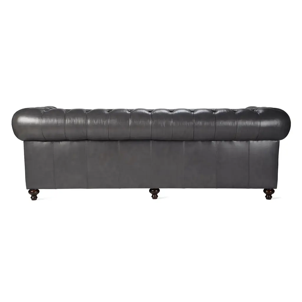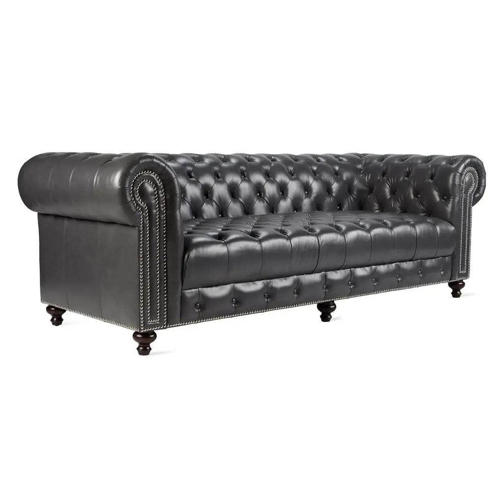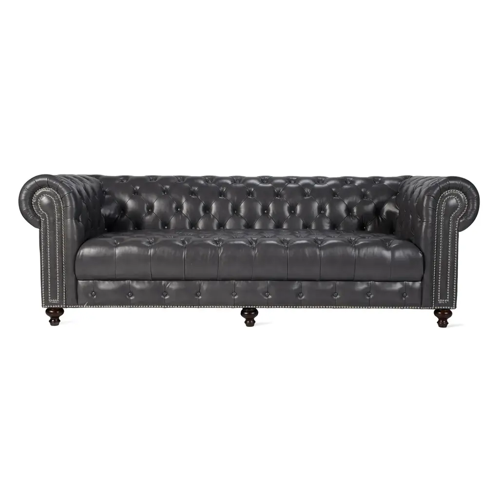 Z Gallerie’s exclusive Wakefield Leather sofa displays distinctive style, with oversized rolled arms embellished with a double row of nailhead trim, button tufted seat and interior arms and back, and turned legs finished in an Espresso stain. Each piece is constructed by a team of expert artisans to ensure ultimate quality and durability. Shown in Cortina Leather Charcoal.Exclusive to Z Gallerie.Custom Orders: Custom Furniture is manufactured especially for you, which is why we do not accept cancellations, exchanges, or returns.