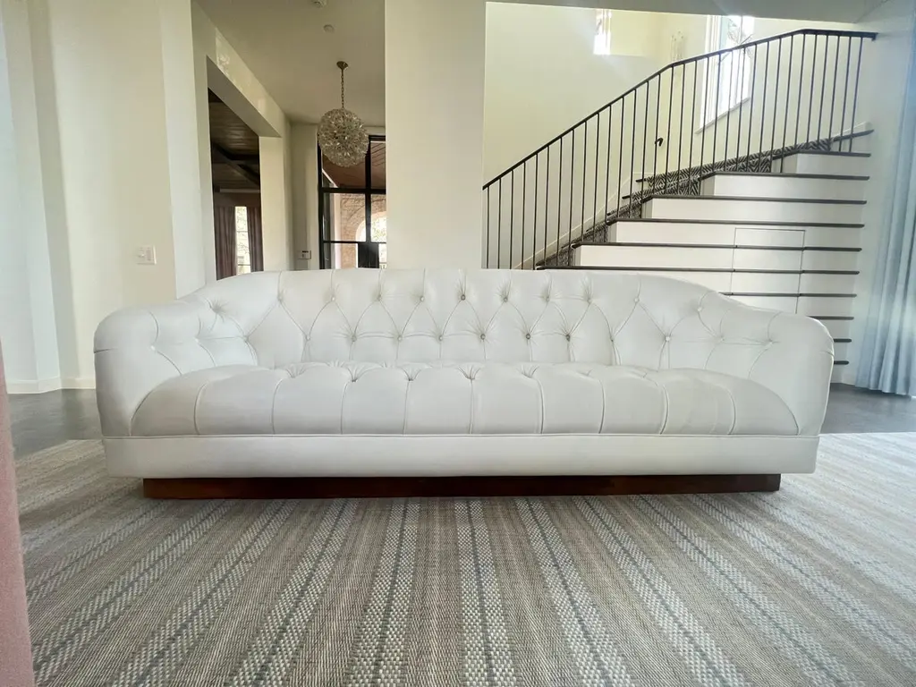Stunning 7ft Ward Bennett tufted sofa on walnut plinth base.Ward Bennett created everything from interiors and furniture to textiles and flatware. The unsung New York City-born modernist designer drew on the work of Le Corbusier and Auguste Rodin, studied art with the likes of Abstract Expressionist painter Hans Hofmann and counted legendary American luxury house Tiffany & Co. among his clients. For decades, Bennett created and filled spaces that were elegant, minimalist and deeply appealed to everyone who laid eyes on themRare restored Ward Bennett sofa in a rich white leather, by GARRETT leather Co. Button tufted on a walnut plinth base.2 availableMeasures: Height: 30.5 in. Width: 84.25 in. Depth: 29.