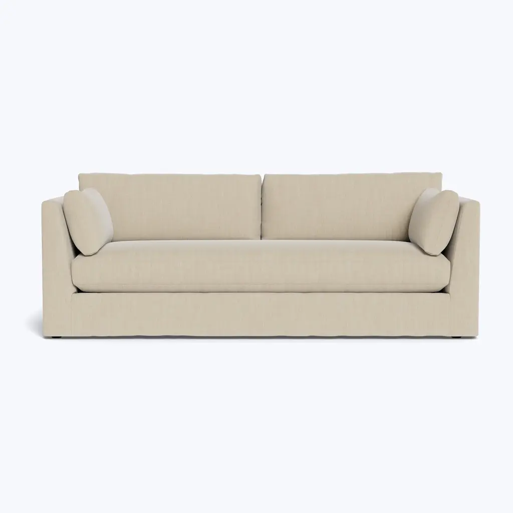 Sink into cozy comfort with the Watermill Slipped Bench Seat Sofa, an exclusive offering from abc carpet & home. With its modern, clean-lined design and a choice of over 35 slipcover options, this sofa offers divine relaxation fit for any space. Designed with smaller living rooms, studios, and compact professional spaces in mind, the Watermill Sofa boasts a shape that perfectly suits apartment living while still providing ample room to lounge comfortably. Whether you're hosting guests or simply unwinding after a long day, this sofa ensures a cozy retreat in any setting. At the heart of the Watermill Collection lies its blend-down cushions, crafted from a mix of dense foam and feather down that's washed to meet hypoallergenic regulations. The result is a perfect combination of support and softness, inviting you to sink in and relax. Crafted with a sustainably sourced Goodwood frame, this exclusive slipcover sofa reflects Cobble Hill's commitment to eco-consciousness and quality craftsmanship. Measuring 74 inches in width, 38 inches in depth, and 33 inches in height, with a seat height of 17 inches and a seat depth of 24 inches, the Watermill Sofa offers generous proportions for lounging and relaxing. Its back and arm height of 30 inches ensures optimal support and comfort. Proudly made in the USA, each piece in the Cobble Hill collection reflects a commitment to quality craftsmanship and ethical manufacturing practices. To preserve its pristine condition, spot clean with mild detergent and opt for professional cleaning as needed. Regular vacuuming helps maintain its plush appearance, ensuring lasting beauty for years to come. Transform your living space into a cozy retreat and create memories that will last a lifetime with the Watermill Slipped Bench Seat Sofa from Cobble Hill.