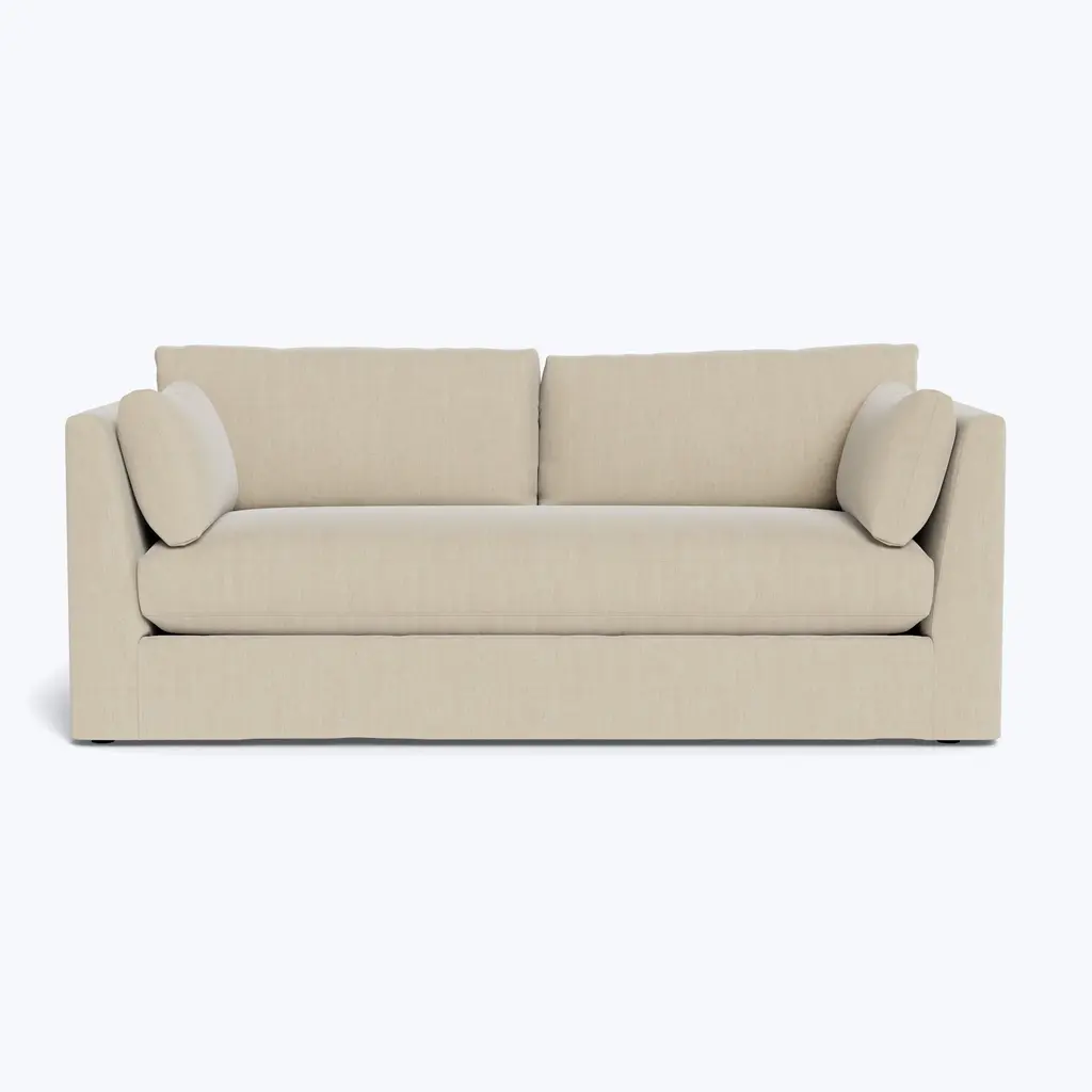 Sink into cozy comfort with the Watermill Slipped Bench Seat Sofa, an exclusive offering from abc carpet & home. With its modern, clean-lined design and a choice of over 35 slipcover options, this sofa offers divine relaxation fit for any space. Designed with smaller living rooms, studios, and compact professional spaces in mind, the Watermill Sofa boasts a shape that perfectly suits apartment living while still providing ample room to lounge comfortably. Whether you're hosting guests or simply unwinding after a long day, this sofa ensures a cozy retreat in any setting. At the heart of the Watermill Collection lies its blend-down cushions, crafted from a mix of dense foam and feather down that's washed to meet hypoallergenic regulations. The result is a perfect combination of support and softness, inviting you to sink in and relax. Crafted with a sustainably sourced Goodwood frame, this exclusive slipcover sofa reflects Cobble Hill's commitment to eco-consciousness and quality craftsmanship. Measuring 74 inches in width, 38 inches in depth, and 33 inches in height, with a seat height of 17 inches and a seat depth of 24 inches, the Watermill Sofa offers generous proportions for lounging and relaxing. Its back and arm height of 30 inches ensures optimal support and comfort. Proudly made in the USA, each piece in the Cobble Hill collection reflects a commitment to quality craftsmanship and ethical manufacturing practices. To preserve its pristine condition, spot clean with mild detergent and opt for professional cleaning as needed. Regular vacuuming helps maintain its plush appearance, ensuring lasting beauty for years to come. Transform your living space into a cozy retreat and create memories that will last a lifetime with the Watermill Slipped Bench Seat Sofa from Cobble Hill.