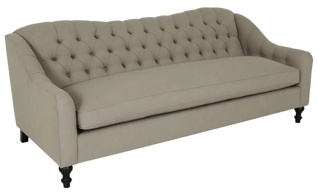 Available online exclusively at One Kings Lane: Combining a reverse camelback, deep button tufting, and sculpted alder legs, this transitional sofa delivers timeless elegance. And because it's upholstered in Crypton--an eco-friendly, high-performance fabric--it repels stains, spills, bacteria, and mold. Handcrafted in the USA.