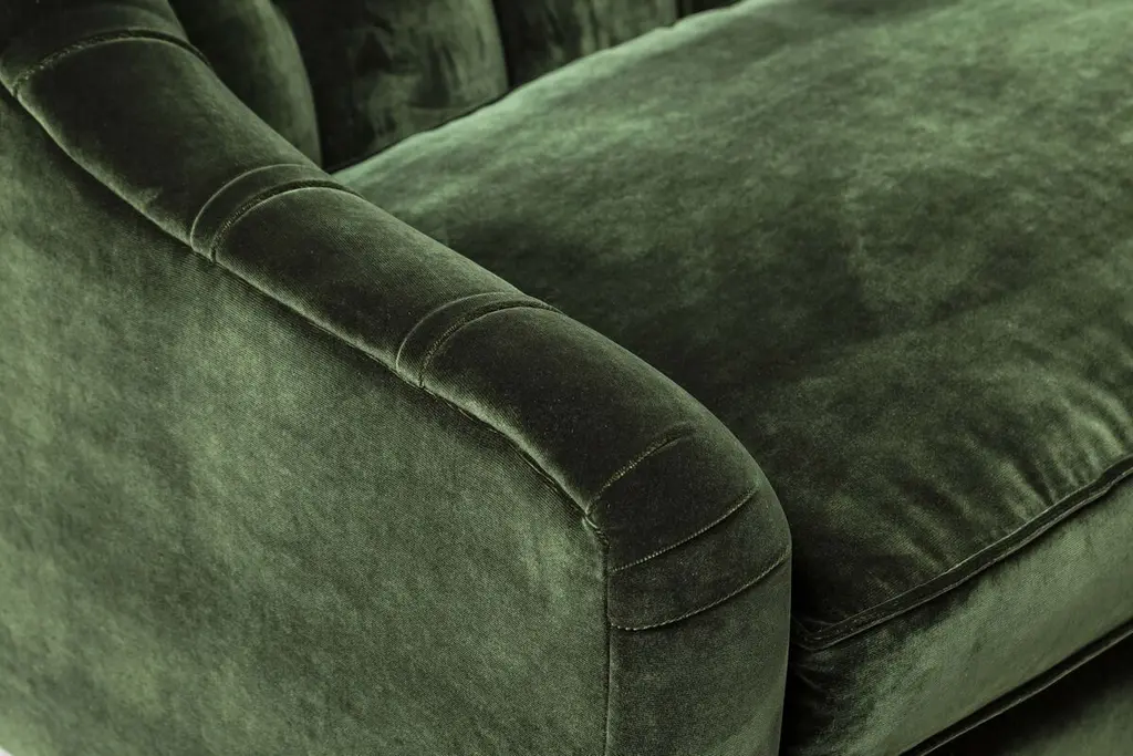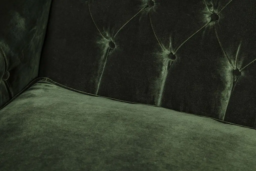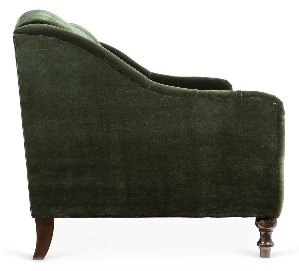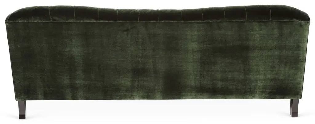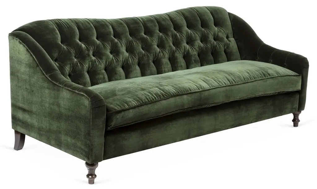 Available online exclusively at One Kings Lane: Timelessly elegant, this plush velvet sofa is tailored with a reverse camel back, deep button tufting, and sculpted alder legs. A foam fill wrapped in a down-and-feather envelope welcomes guests with soft, sturdy support. Handcrafted in Southern California.