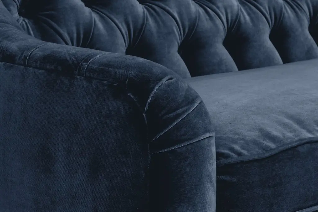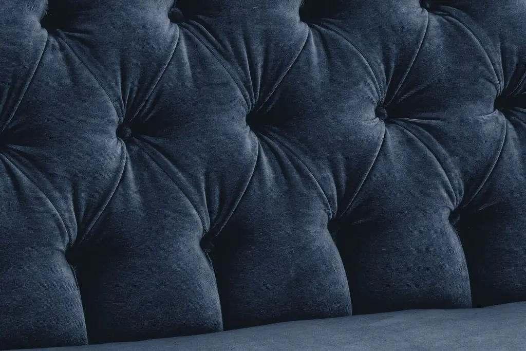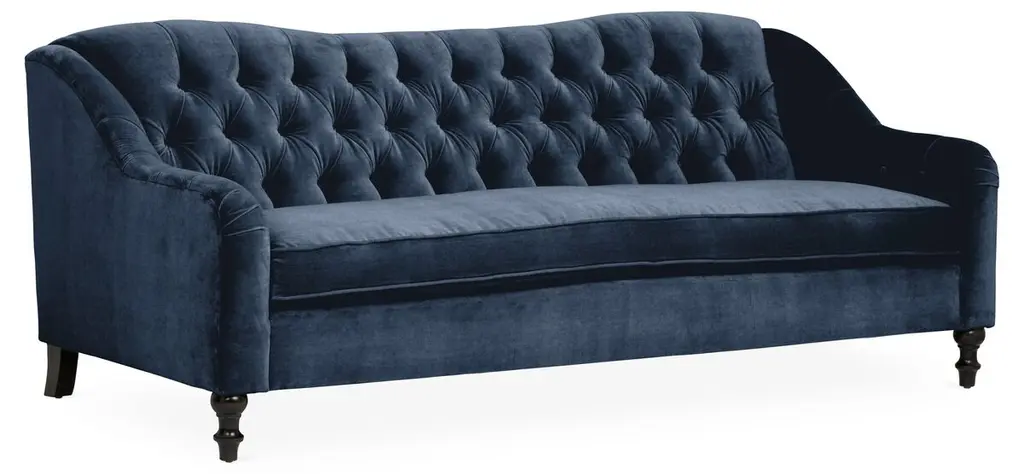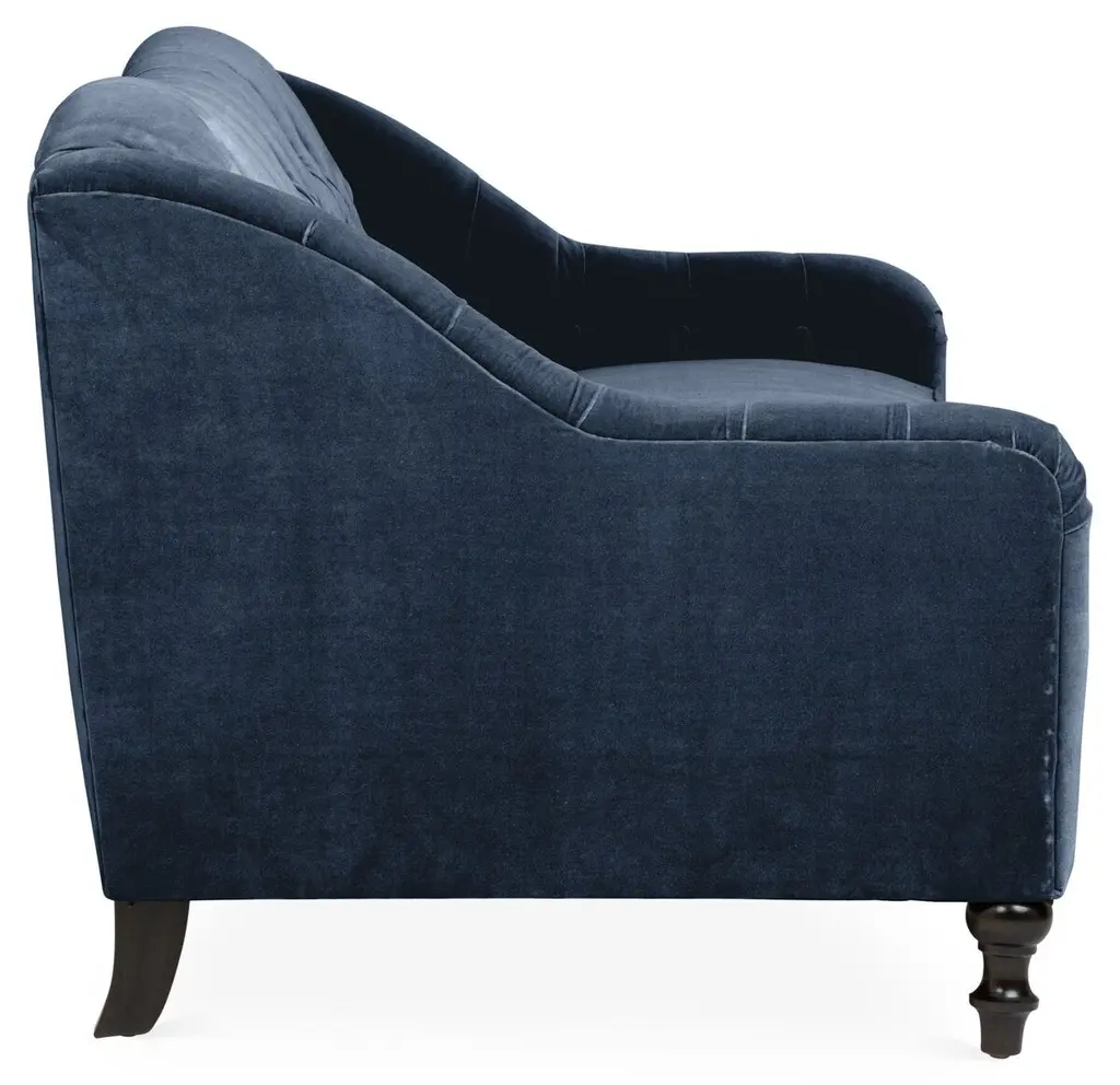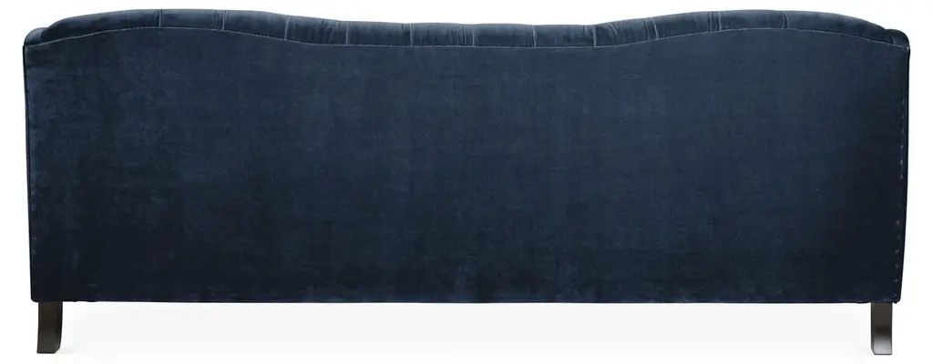 Available online exclusively at One Kings Lane: Timelessly elegant, this plush velvet sofa is tailored with a reverse camel back, deep button tufting, and sculpted alder legs. A foam fill wrapped in a down-and-feather envelope welcomes guests with soft, sturdy support. Handcrafted in Southern California.
