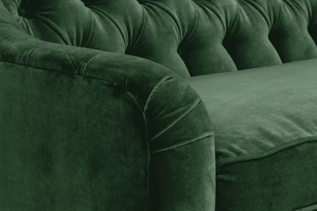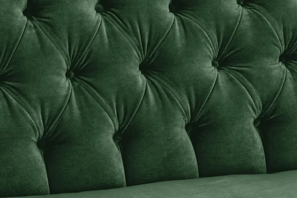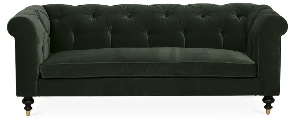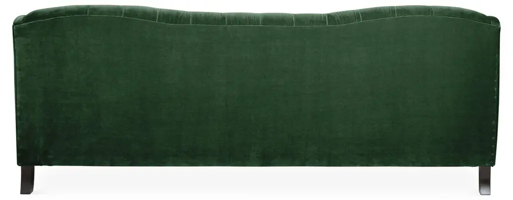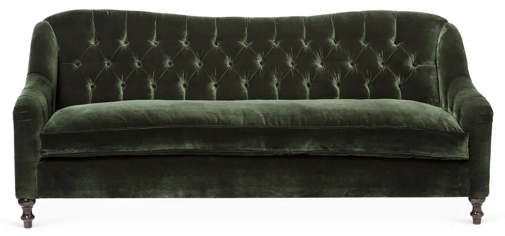 Available online exclusively at One Kings Lane: Timelessly elegant, this plush velvet sofa is tailored with a reverse camel back, deep button tufting, and sculpted alder legs. A foam fill wrapped in a down-and-feather envelope welcomes guests with soft, sturdy support. Handcrafted in Southern California.
