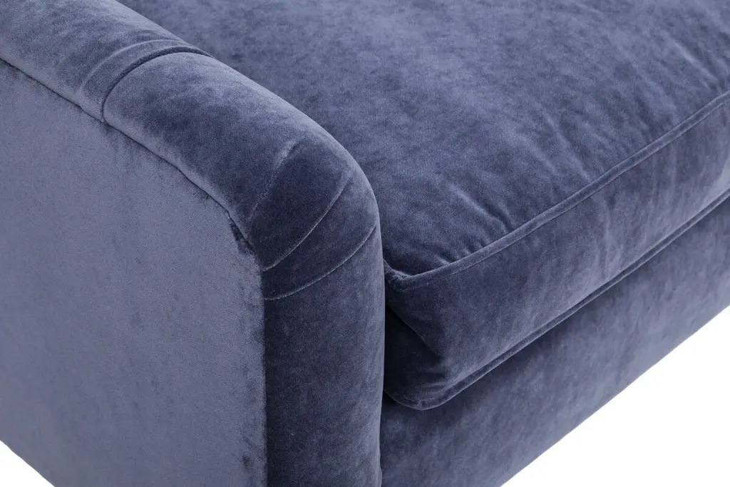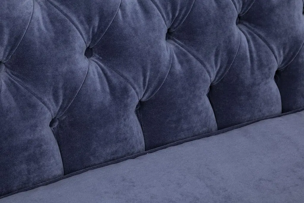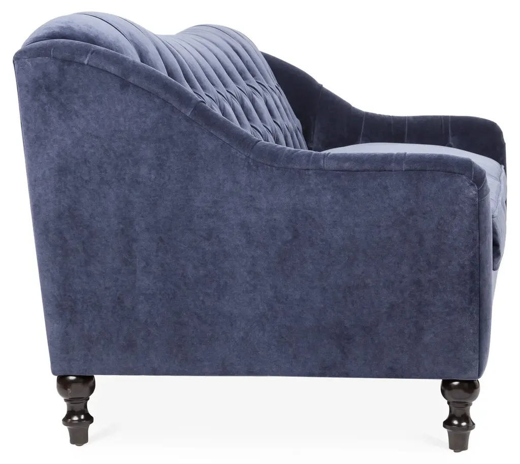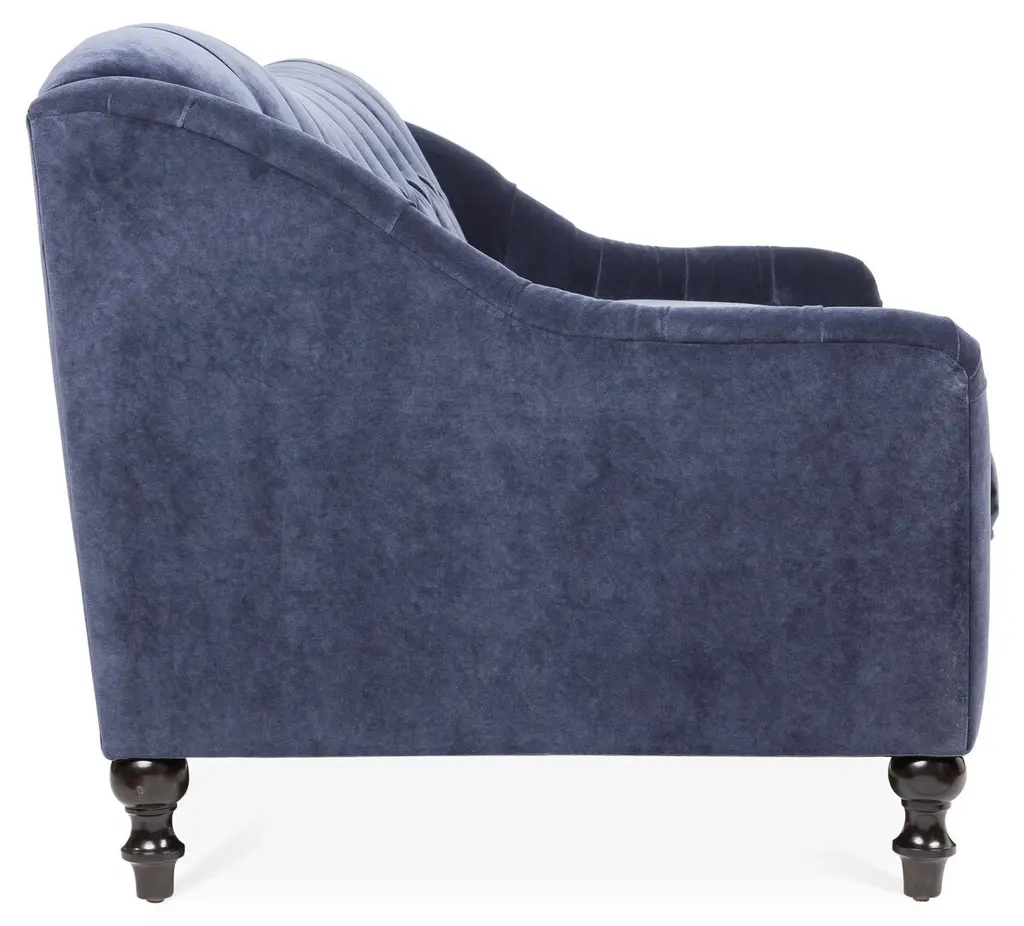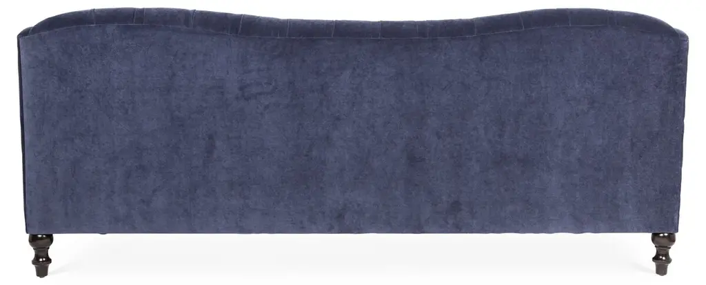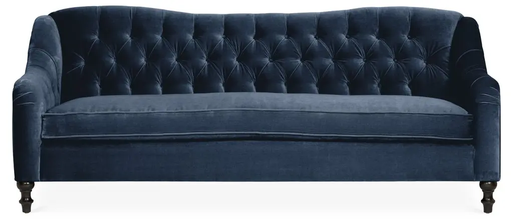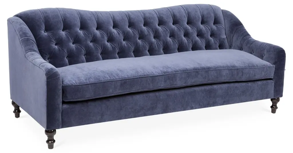 Available online exclusively at One Kings Lane: Timelessly elegant, this plush velvet sofa is tailored with a reverse camel back, deep button tufting, and sculpted alder legs. A foam fill wrapped in a down-and-feather envelope welcomes guests with soft, sturdy support. Handcrafted in Southern California.
