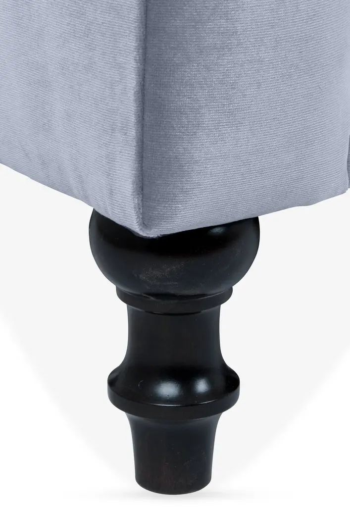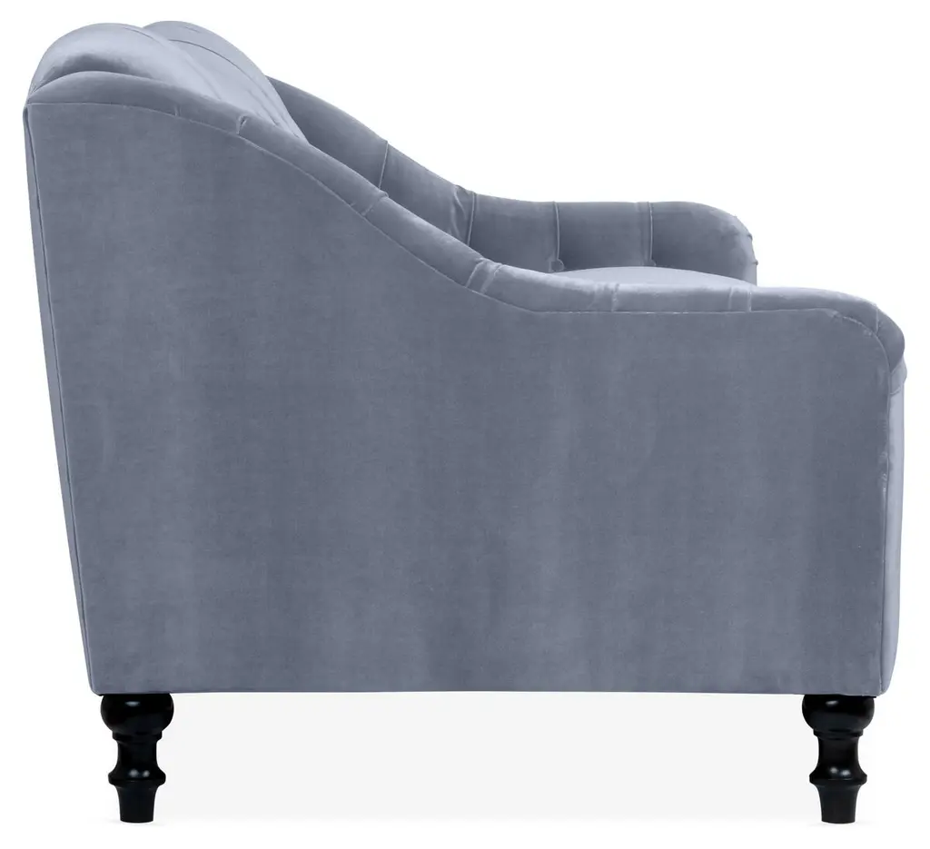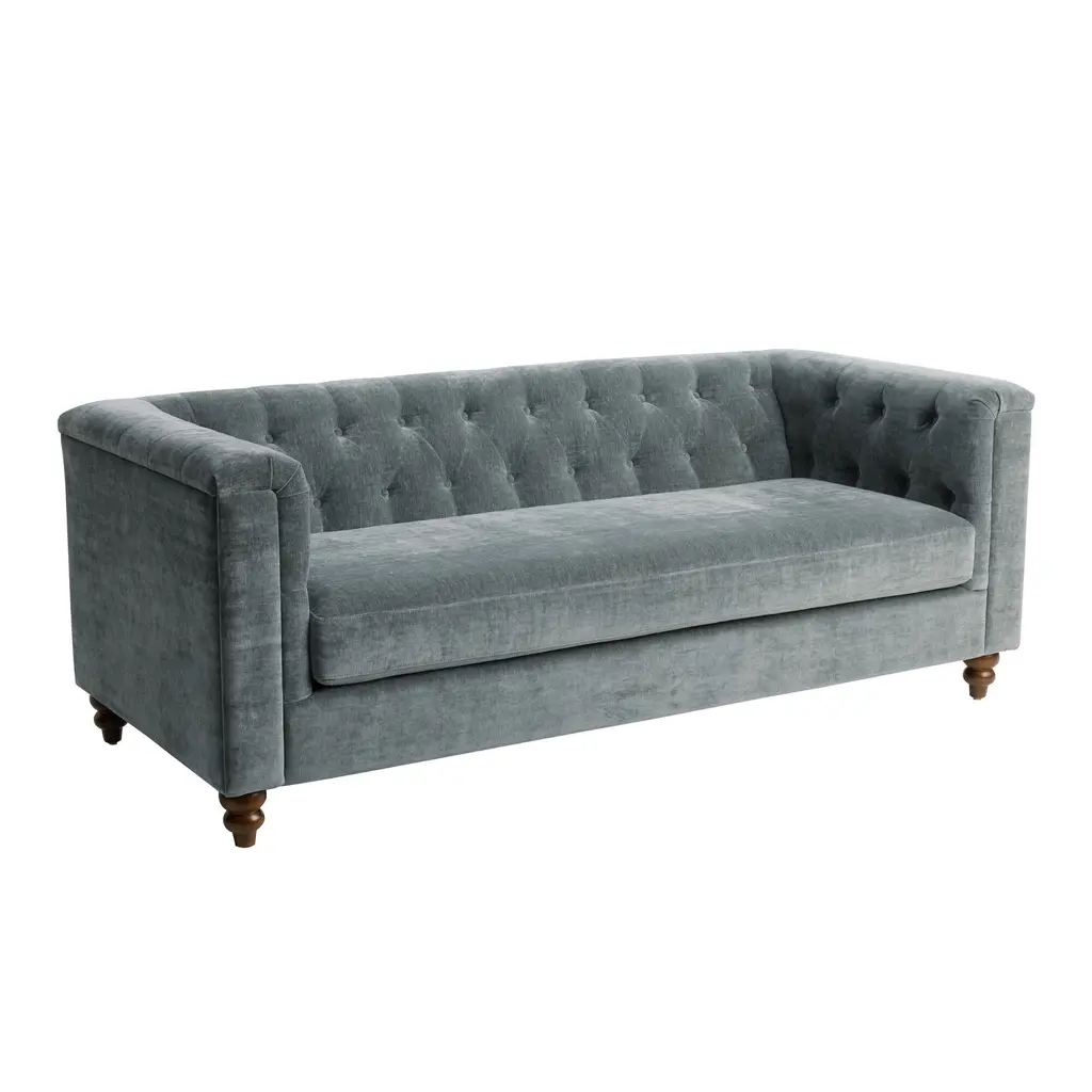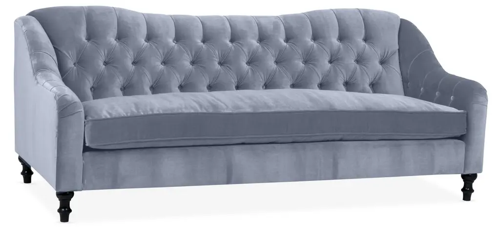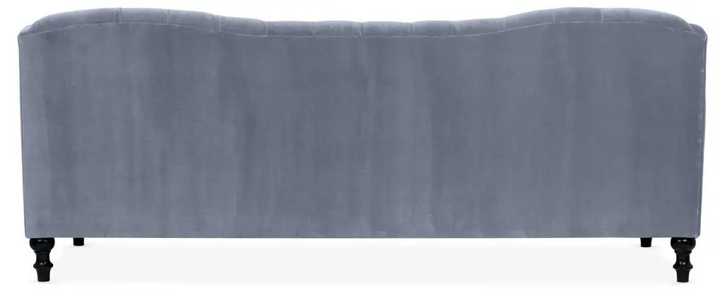 Available online exclusively at One Kings Lane: Timelessly elegant, this plush velvet sofa is tailored with a reverse camel back, deep button tufting, and sculpted alder legs. A foam fill wrapped in a down-and-feather envelope welcomes guests with soft, sturdy support. Handcrafted in Southern California.
