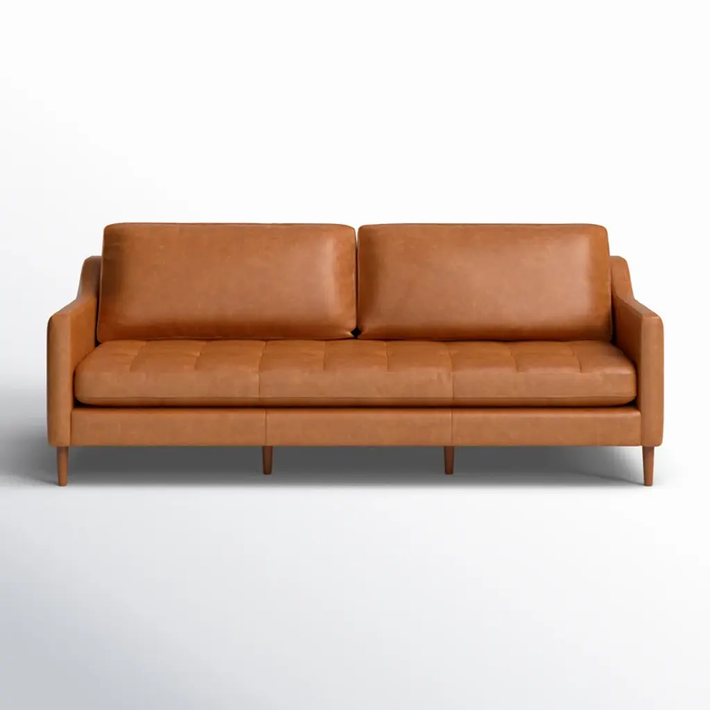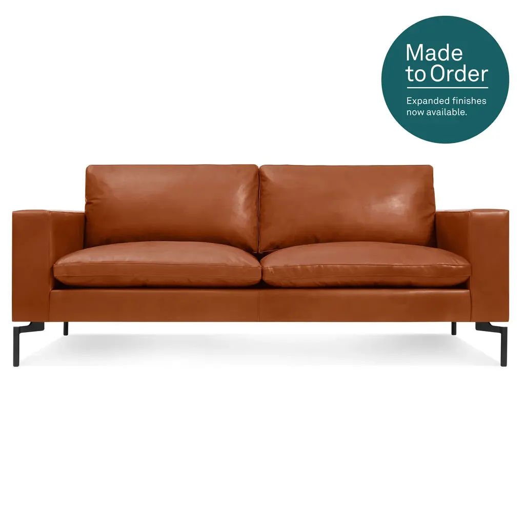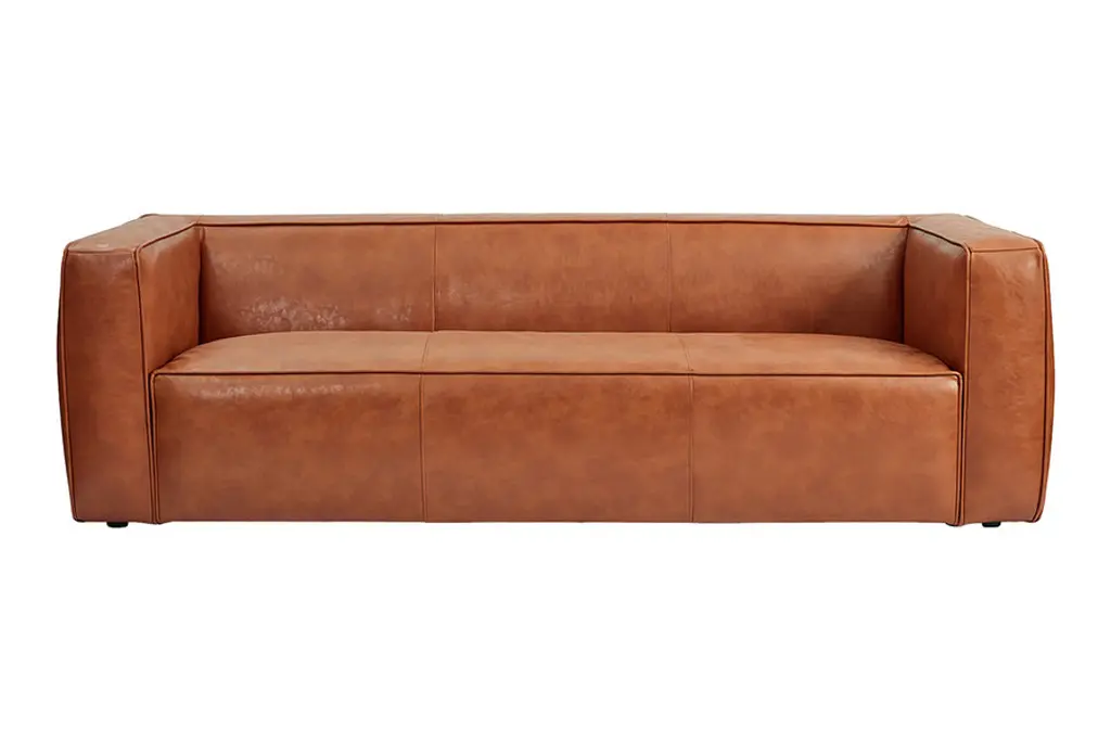 Inspired by vintage '70s seating and plush duvet toppers, this structured, supportive sofa is covered in a subtly distressed thick-cut leather. Ships In 10-14 Business Days Top grain leather This image is for illustrative purposes only. The colors shown are accurate within the constraints of lighting, photography, and the color accuracy of your screen.