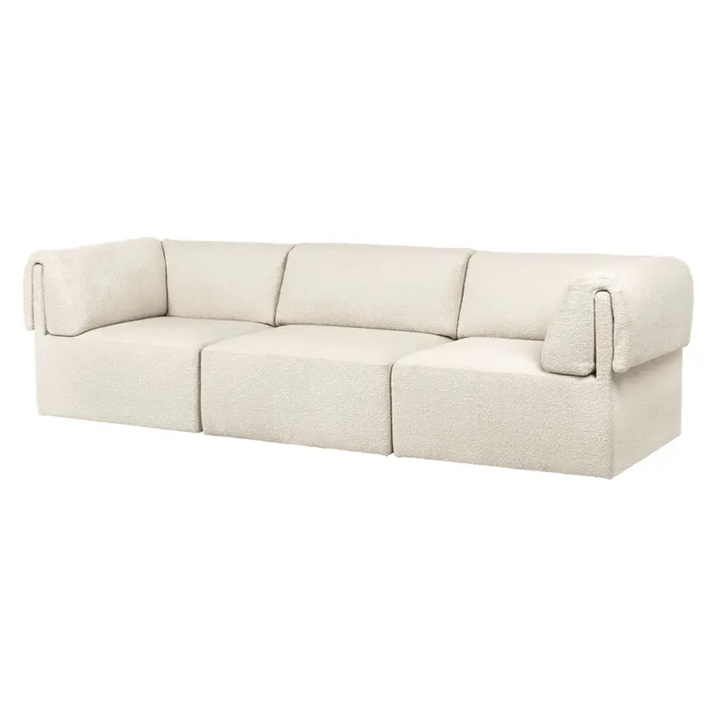 The Wonder Sofa is a contemporary reinterpretation of 1970s lounge furniture by Space Copenhagen for GUBI. Its designers have updated the informal, generous and playful nature of the original modular sofa with an elegant and simple frame. The Wonder Sofa brings the relaxed and approachable feel of home to a hotel or lobby, or a touch of sophistication to a private residence. Endless combinations of the Wonder Sofa’s 3 modules enable it to adapt to users’ changing needs. As a freestanding piece, in groups, back-to-back, side-to-back or in rows, the Wonder Sofa’s distinctive design enchants from every angle. The Wonder Sofa’s plump cushions are softly folded over the clean, square lines of the backrest and attached with the ingenious feature of hidden magnets. This softens the relationship between front and back and creates a sense of relaxed sophistication and comfort in which playful exuberance meets measured simplicity. Features
