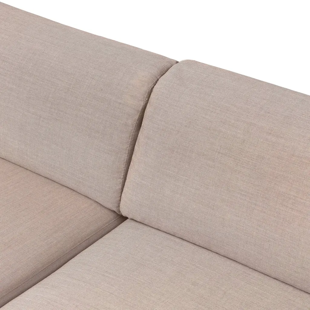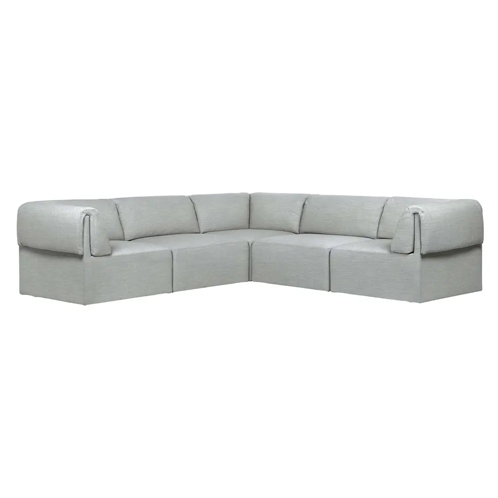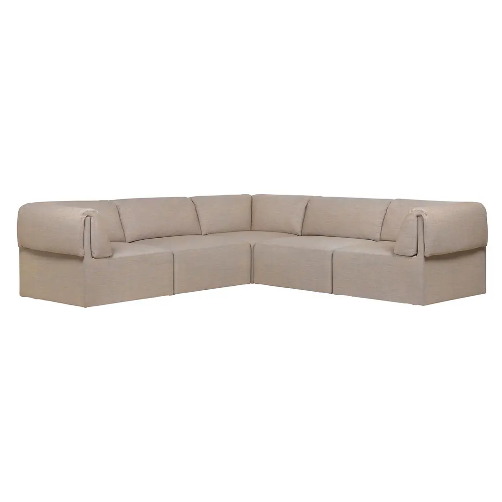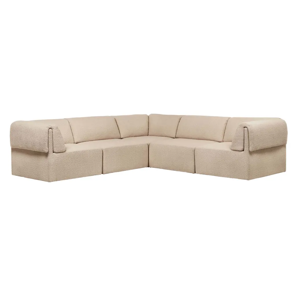 Anchored against a wall or as a freestanding piece, this corner composition of modular sofa elements provides a marvelously comfortable group hangout. A timely reinterpretation of 1970s lounge furniture by Space Copenhagen for Gubi, the seating features distinctive folded cushioning with a rounded padding of duck feathers and foam particle that is ingeniously secured with magnets over the ergonomic structure of the backrest. The expanded proportions offer plenty of room to sit and sprawl for hours of contentment. And the range of select upholstery options as well as a choice of seam detailing offer a sense of relaxed sophistication to suit a range of interiors.