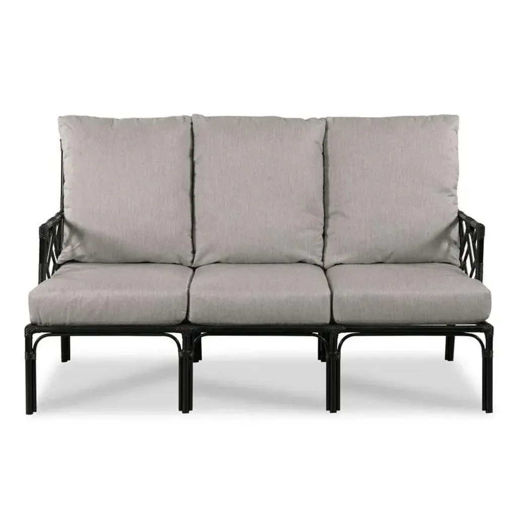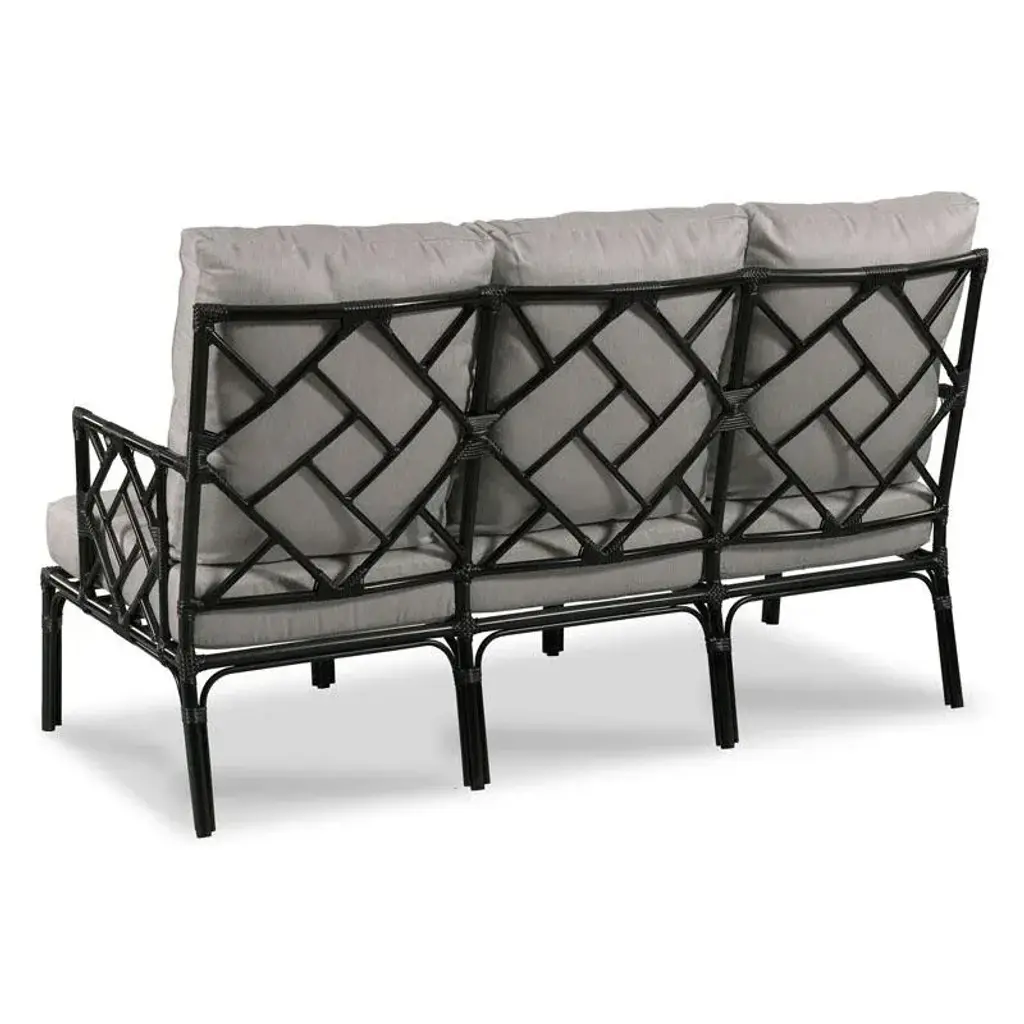 A lovely sofa styled in the spirit of Chippendale originals of the 18th century. An interesting fretwork back is joined by matching fretwork arms that flank an upholstered seat cushion. The poles are fashioned in the look of rattan poles over a powder-coated aluminum base that is accented with bindings.