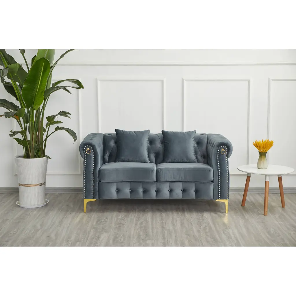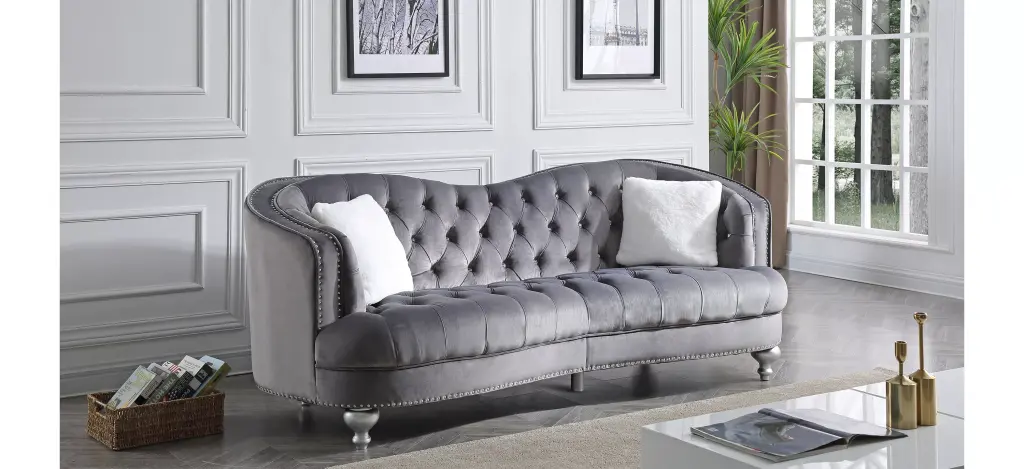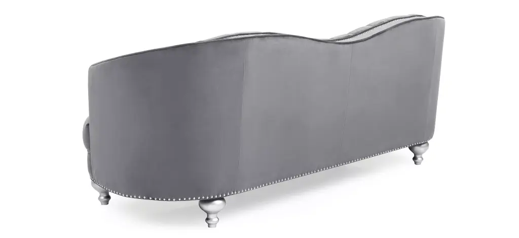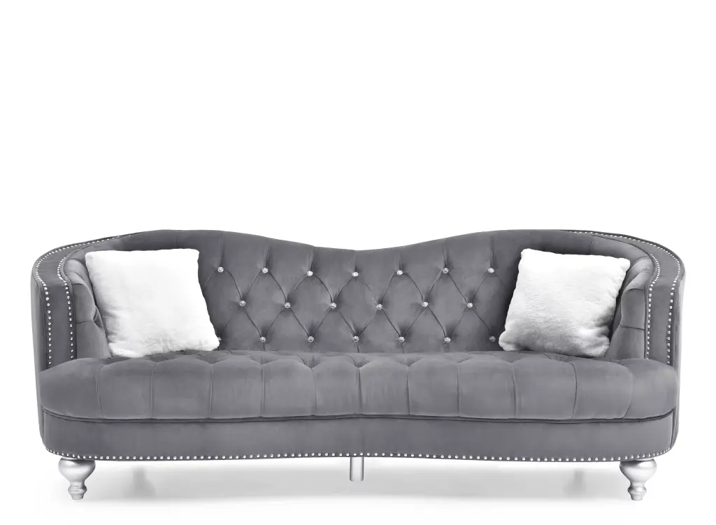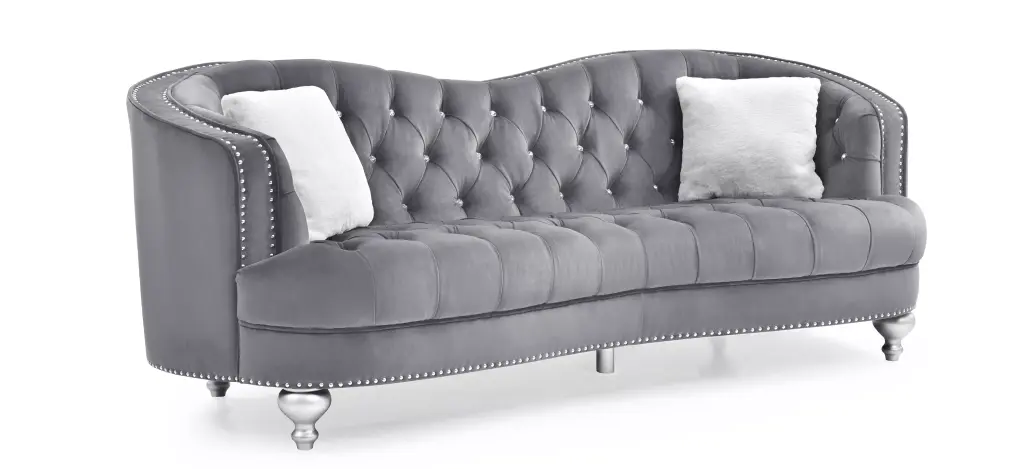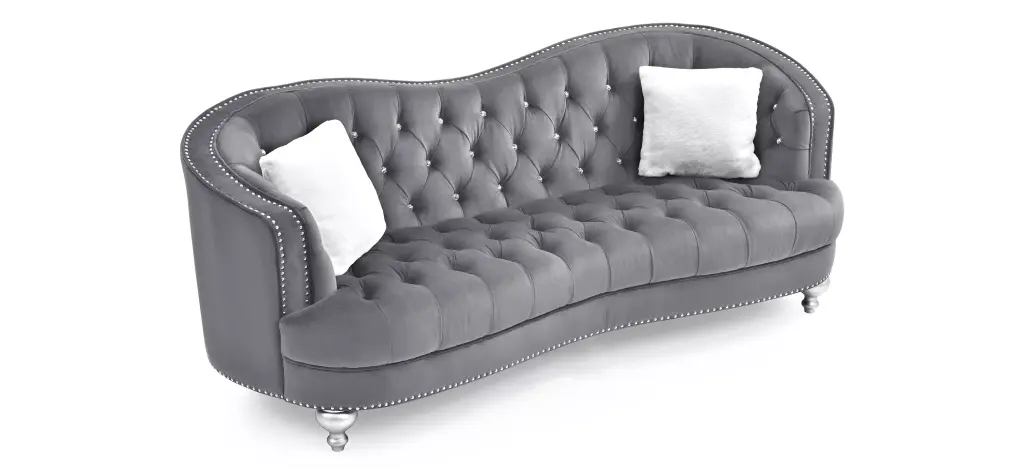 This Woodbridge sofa has everything- soft upholstery, curved swooping back, jeweled button tufting on seats and back. Curved front and painted wood legs finish off this stunning glam sofa!