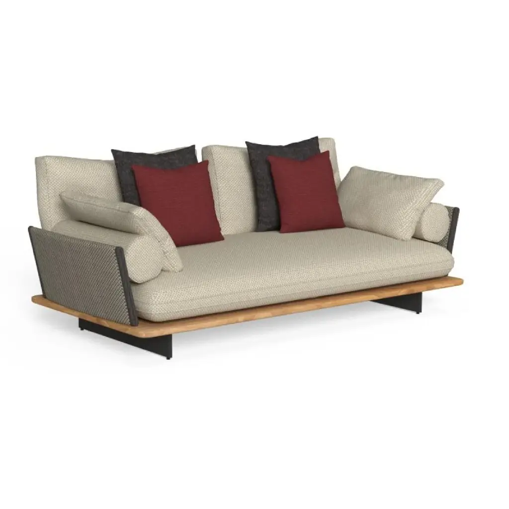 The Venice sofa expresses the charm and lightness of the homonymous city. The solid teak and accoya wood bases are designed to bring out the soft lines of the cushions and the elegant fabric covers of backs and armrests, which recall the classic nautical style. The large seats convey a feeling of comfort and make the outdoor living cozy. A perfect solution to have a relaxing area in the garden.