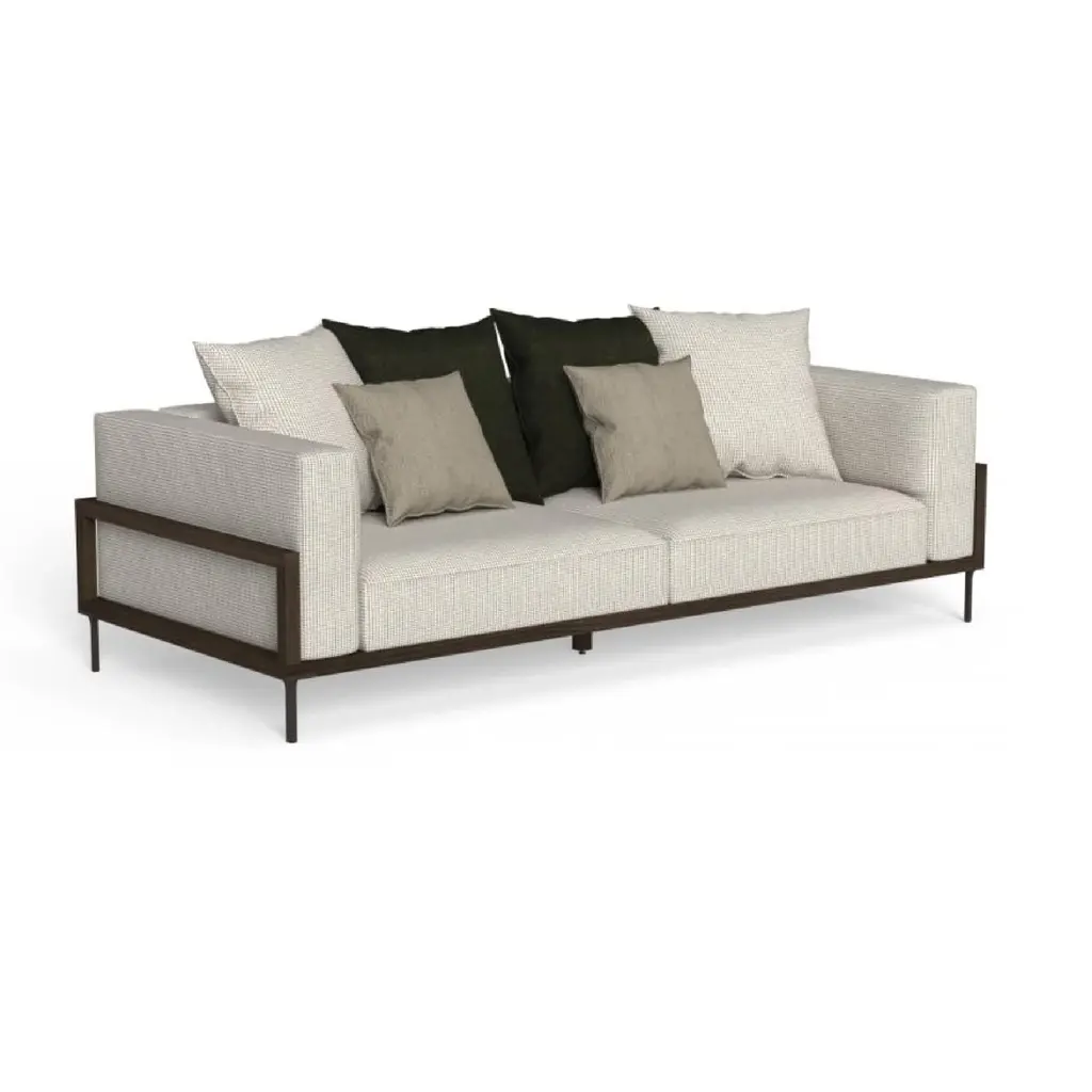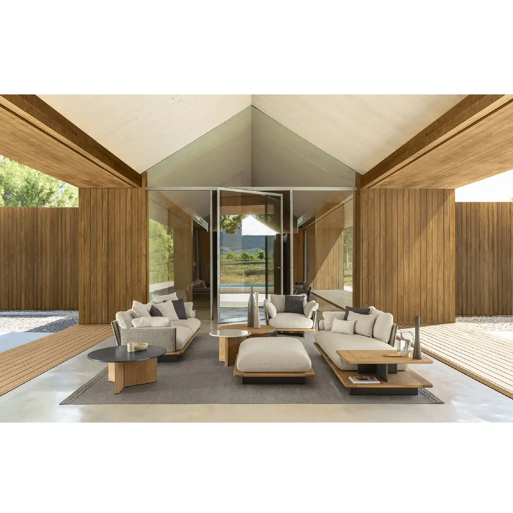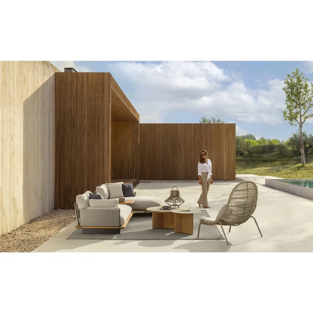 The Venice sofa expresses the charm and lightness of the homonymous city. The solid teak and accoya wood bases are designed to bring out the soft lines of the cushions and the elegant fabric covers of backs and armrests, which recall the classic nautical style. The large seats convey a feeling of comfort and make the outdoor living cozy. A perfect solution to have a relaxing area in the garden.