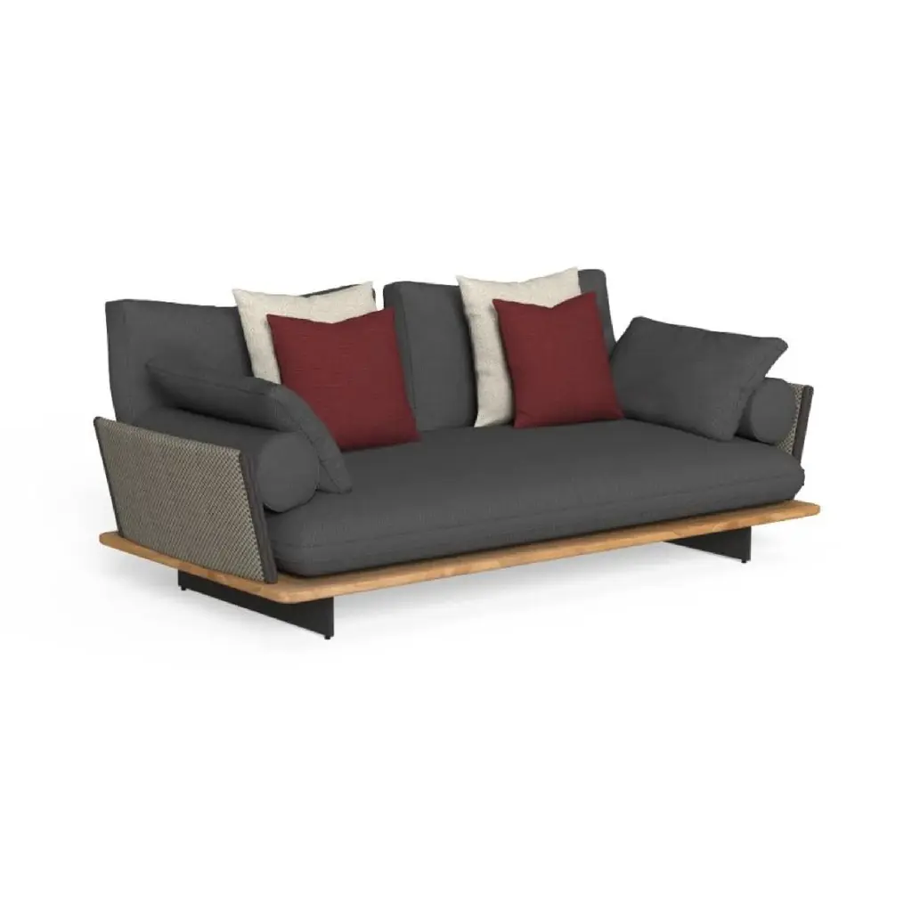 The Venice sofa expresses the charm and lightness of the homonymous city. The solid teak and accoya wood bases are designed to bring out the soft lines of the cushions and the elegant fabric covers of backs and armrests, which recall the classic nautical style. The large seats convey a feeling of comfort and make the outdoor living cozy. A perfect solution to have a relaxing area in the garden.