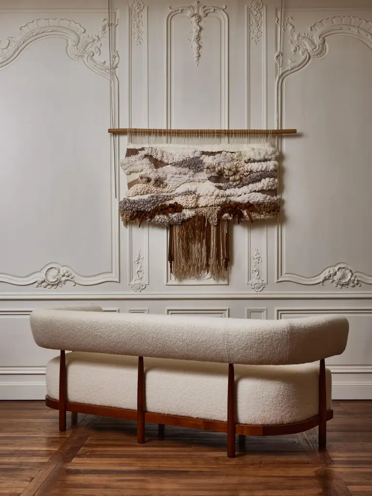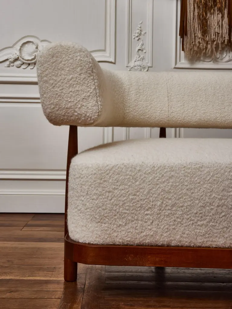 Wooden sofa with curved backrest, upholstered with a bouclette fabric.Creation Studio Glustin.