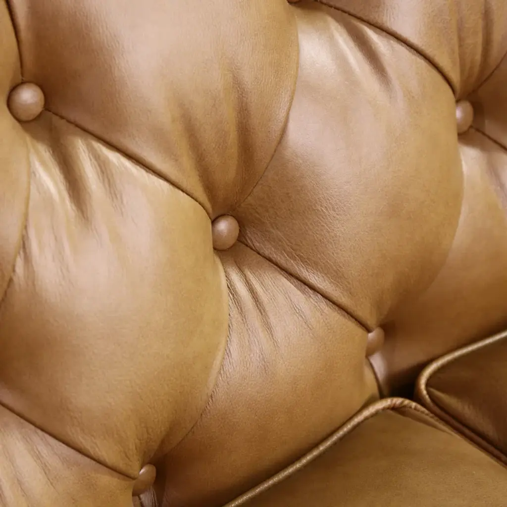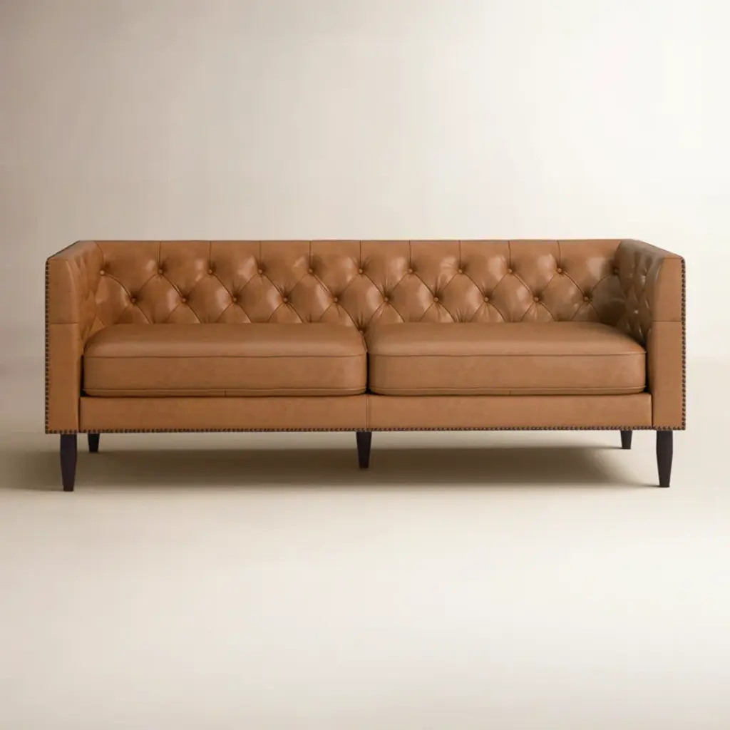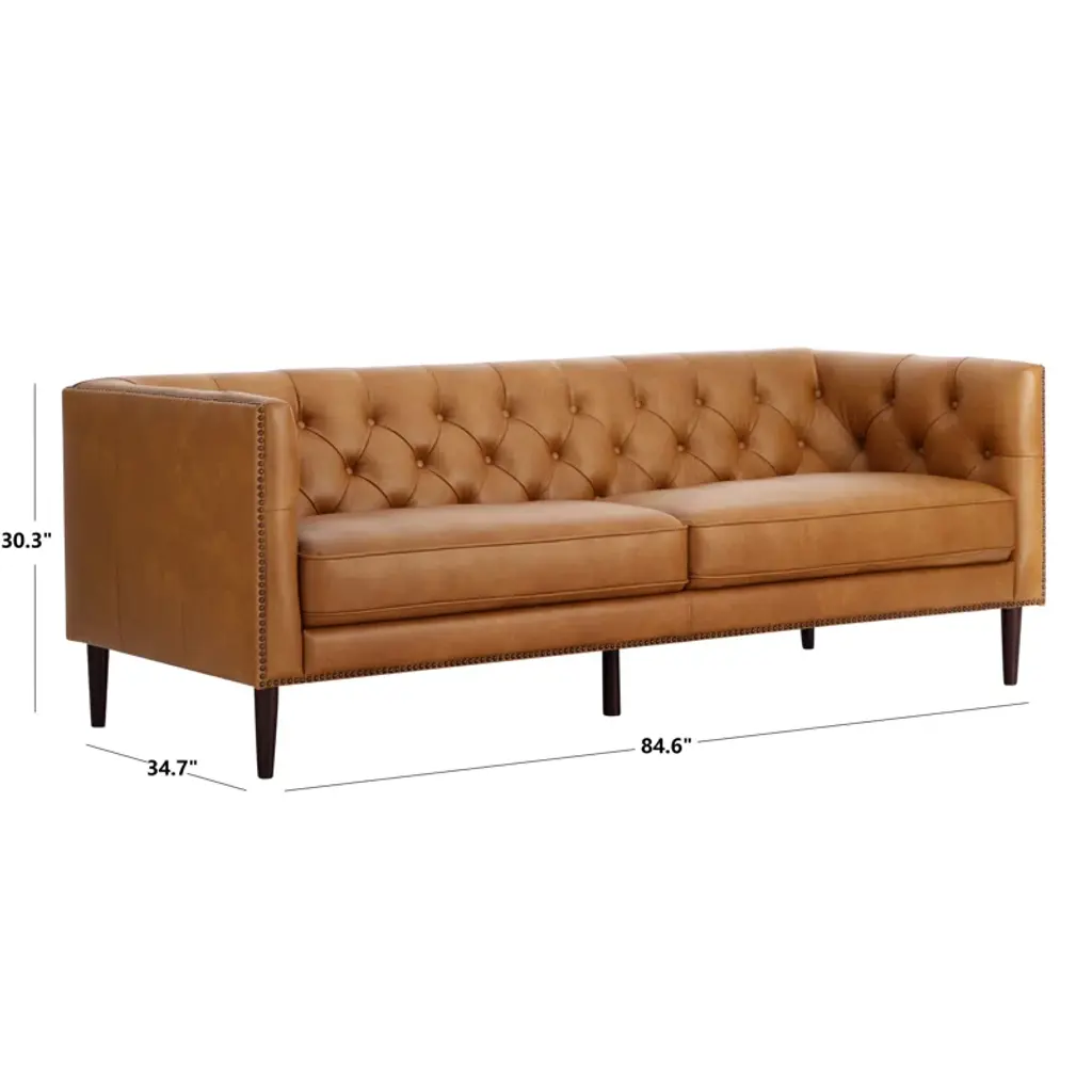 This sofa shows off timeless style, with its tuxedo arms and chesterfield silhouette. The sturdy wooden frame rests on black metal corner legs, and it’s wrapped in buttery genuine leather with button tufting and nailhead trim that both lean heavily into its traditional aesthetic. Drape a cozy throw over the back for an even more inviting look.