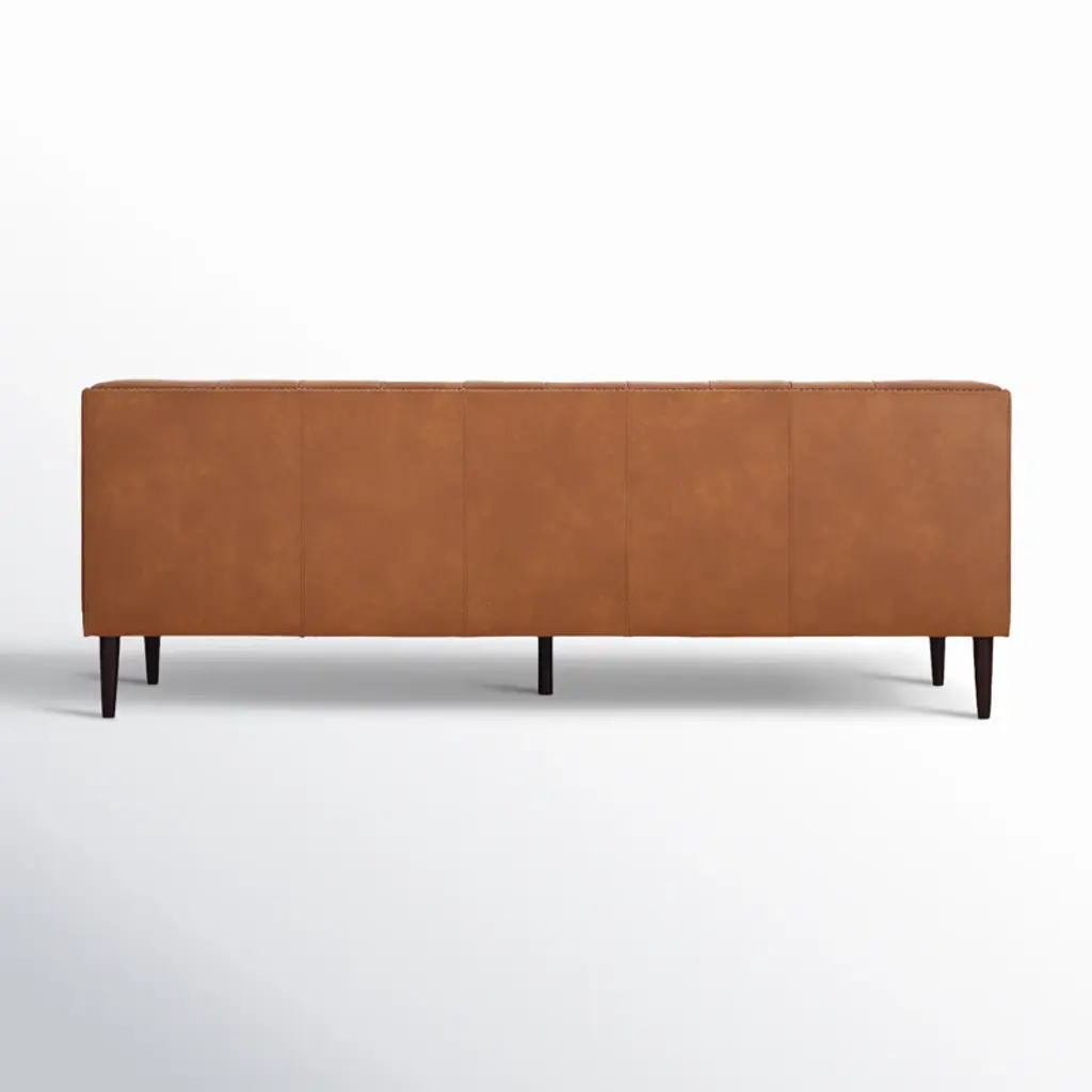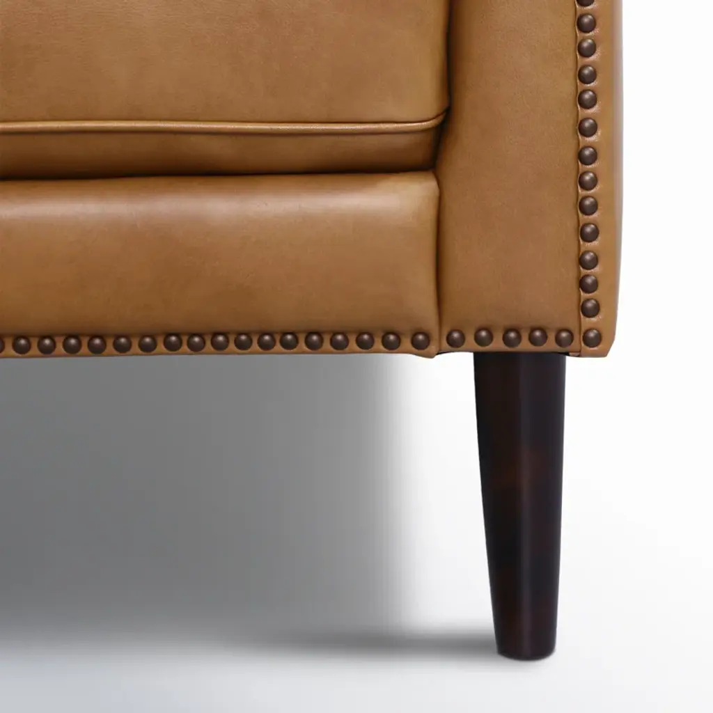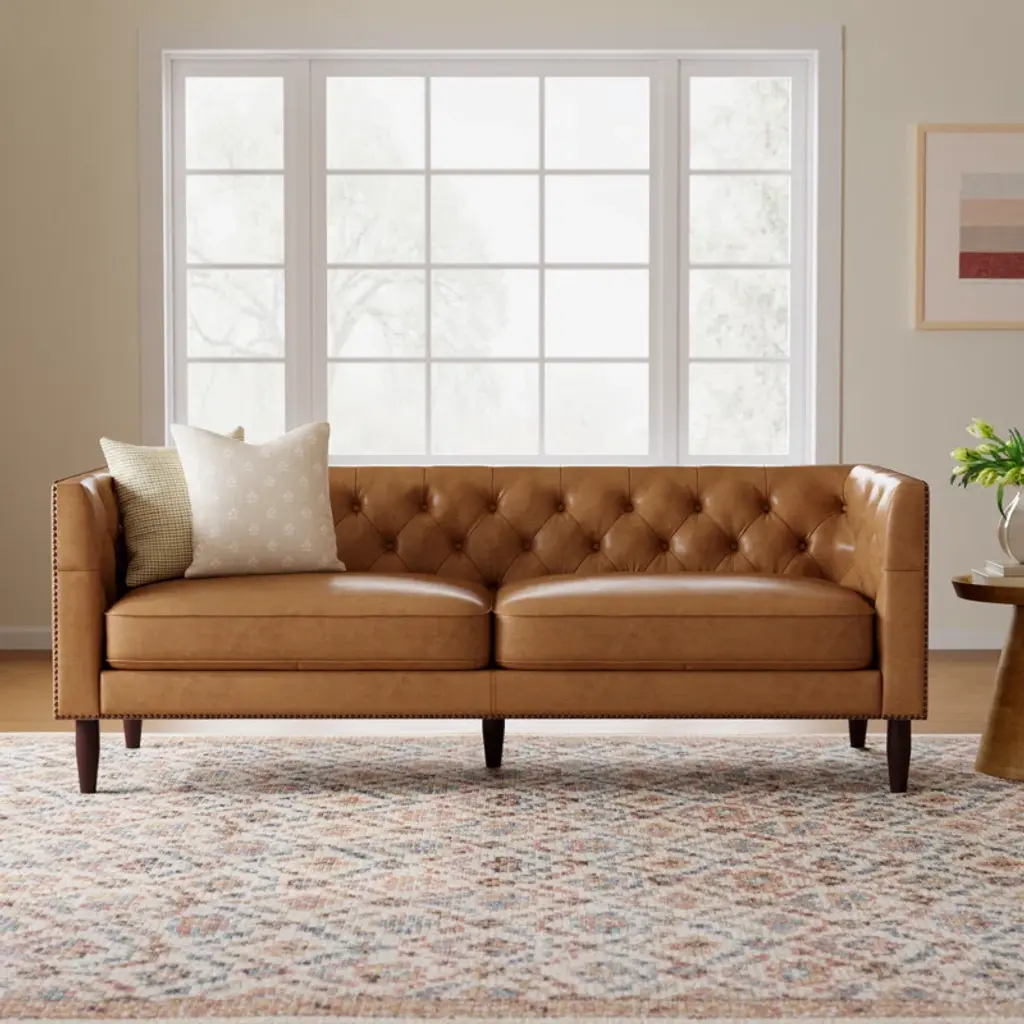 This sofa shows off timeless style, with its tuxedo arms and chesterfield silhouette. The sturdy wooden frame rests on black metal corner legs, and it’s wrapped in buttery genuine leather with button tufting and nailhead trim that both lean heavily into its traditional aesthetic. Drape a cozy throw over the back for an even more inviting look.