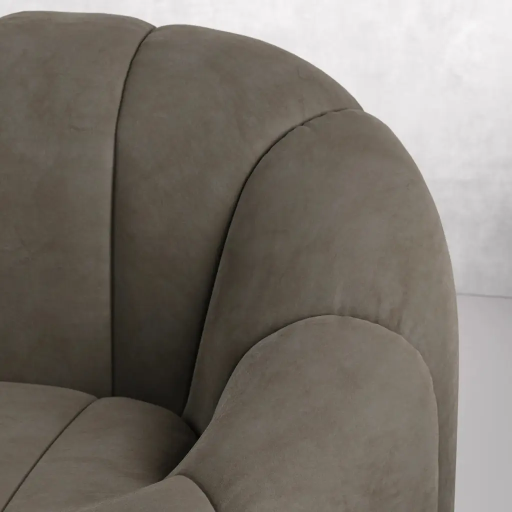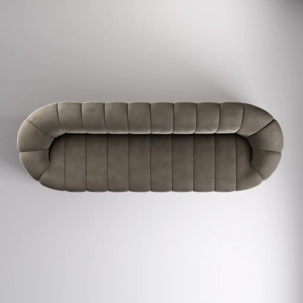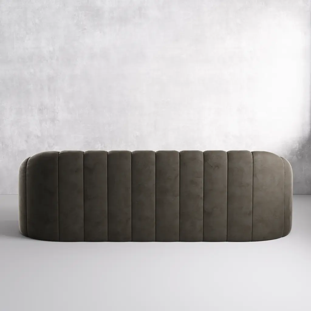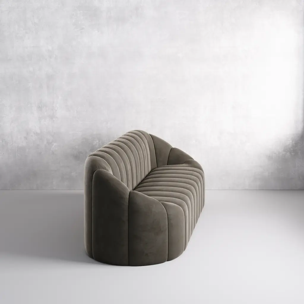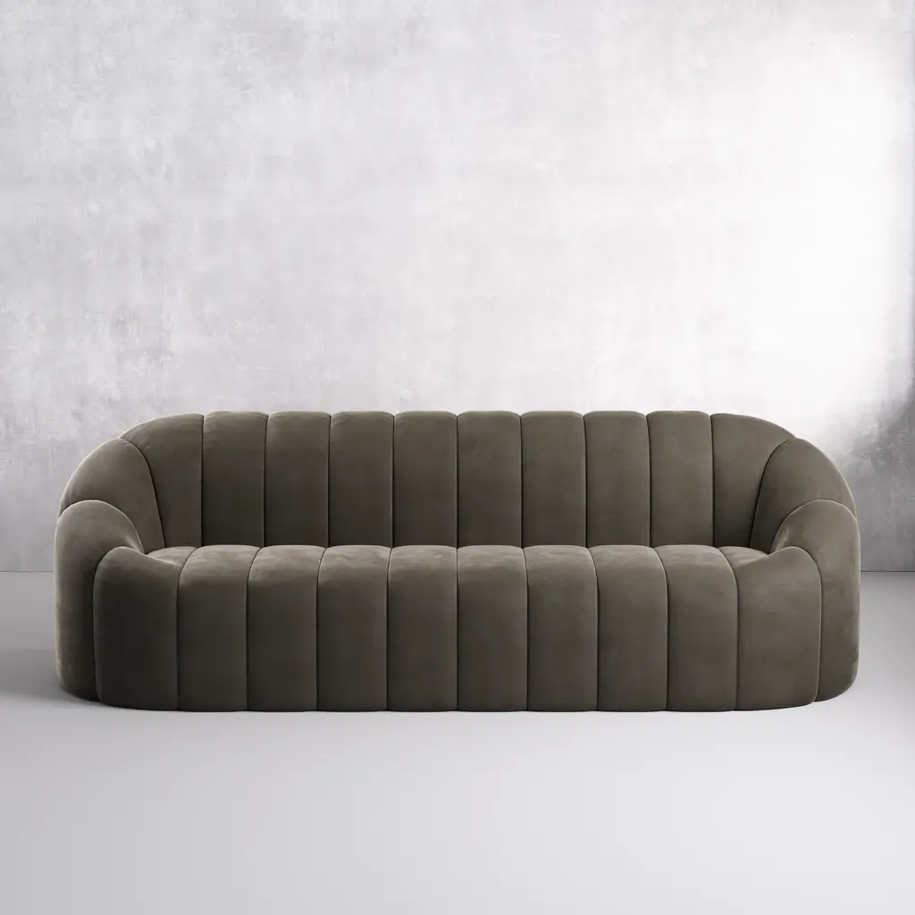 Our light grey, velvet Wrys sofa includes post-modern elements with a trendy twist. The rounded shape will soften your living room without sacrificing style. Add a funky touch to your lounge space with this 8' statement piece. The neutral, grey hue will work with any existing decor. Dimensions: 94.5''W x 32.0''D x 30.0''H Tear Sheet