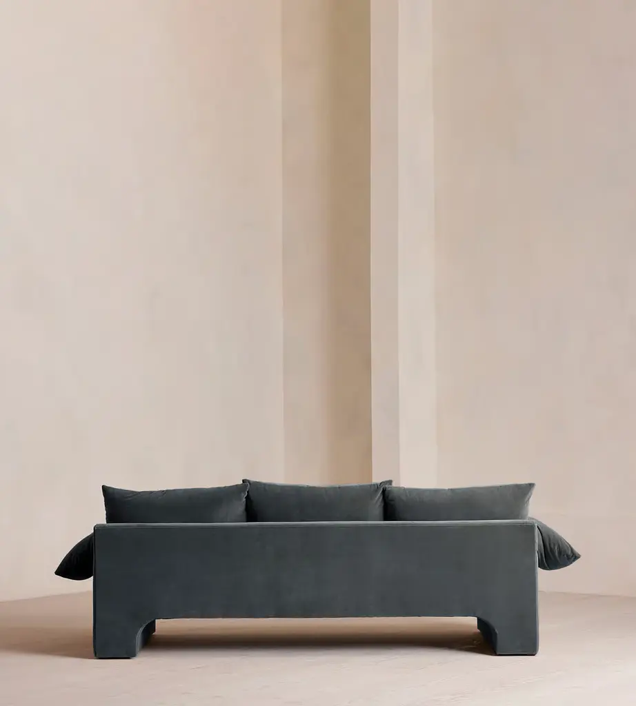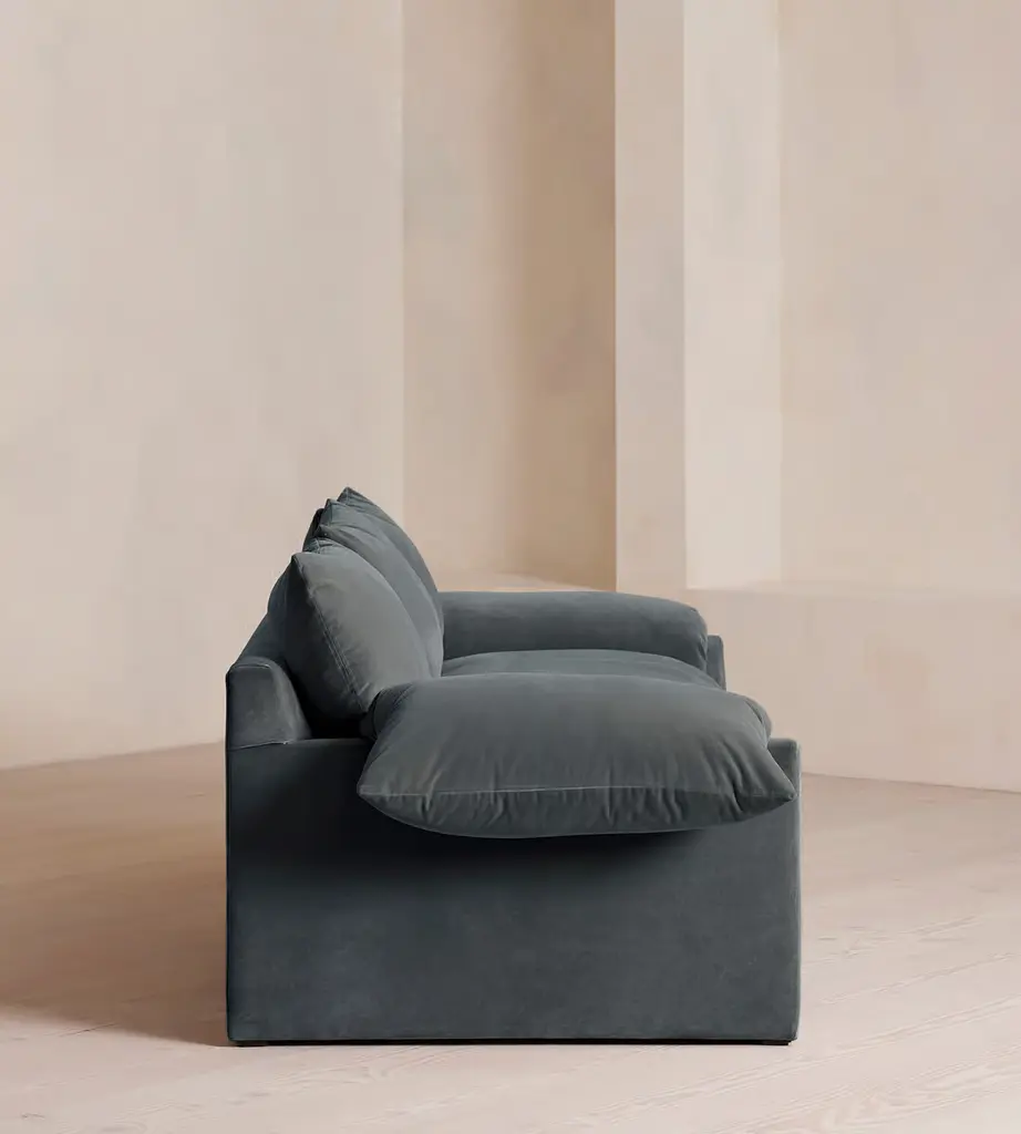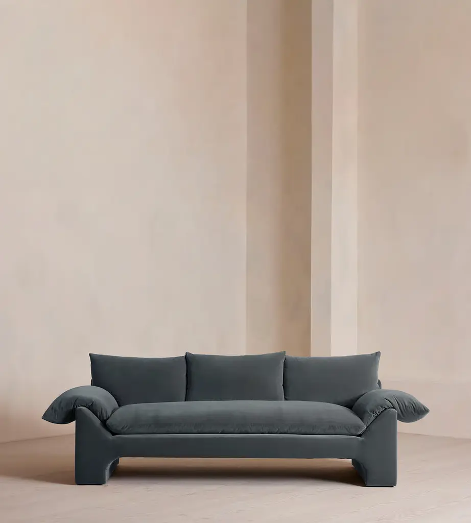 A three-seater style characterised by a floating plinth base and rich velvet upholstery. Inspired by the interiors of Soho Warehouse, the Wyatt sofa is defined by its sloped, cushioned arms and a floating plinth base. With space to sit three, this style still works for both small and larger living spaces.