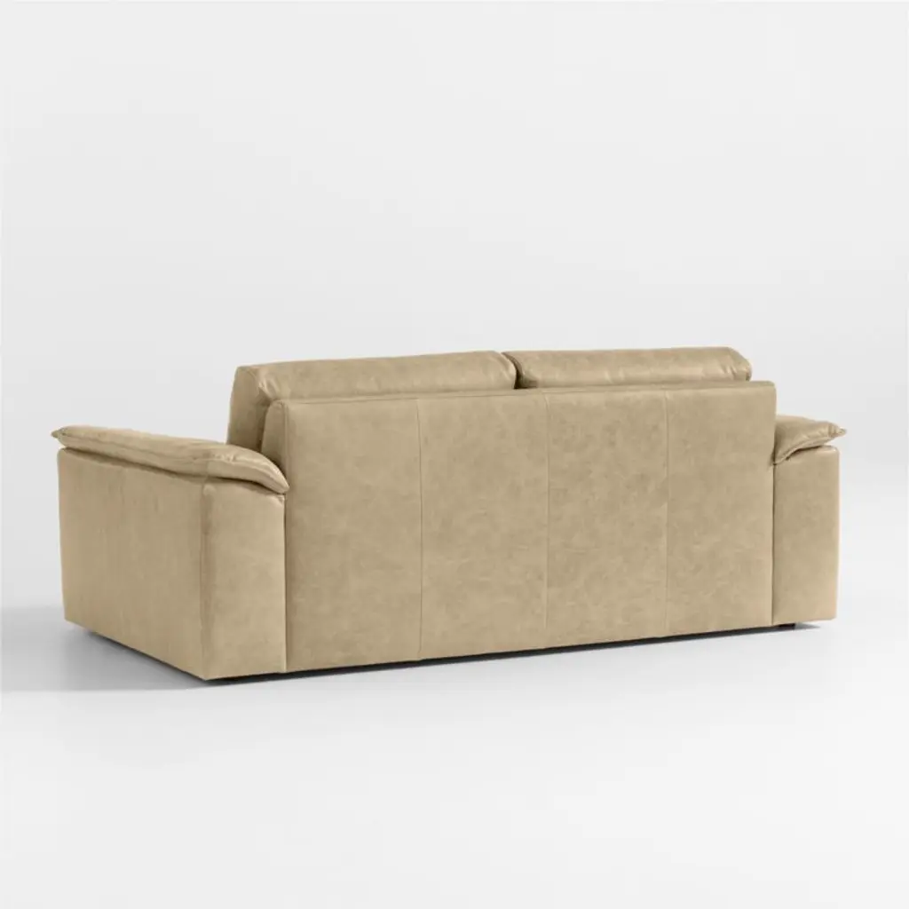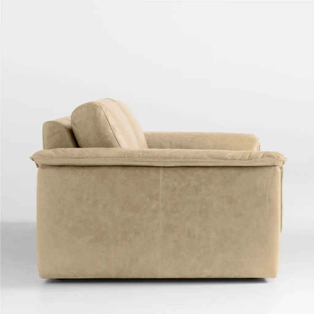 Channeling the glamour of swanky clubs and luxe hotel lobbies, our vintage-inspired Wythe sofa indulges with a sink-in seat and silky leather. Plush cushions and wide armrests draped with duvet-like pillows give the generously proportioned sofa its casual, lived-in feel-an appearance enhanced by the rustic appeal of the leather upholstery. Oil used in the tanning process gives the tan leather rich tonal highlights and a buttery hand. Sophisticated yet familiar, our heirloom-quality Wythe sofa will only get better with time.By choosing FSC®-certified furniture, you are supporting responsible management of the world's forests.