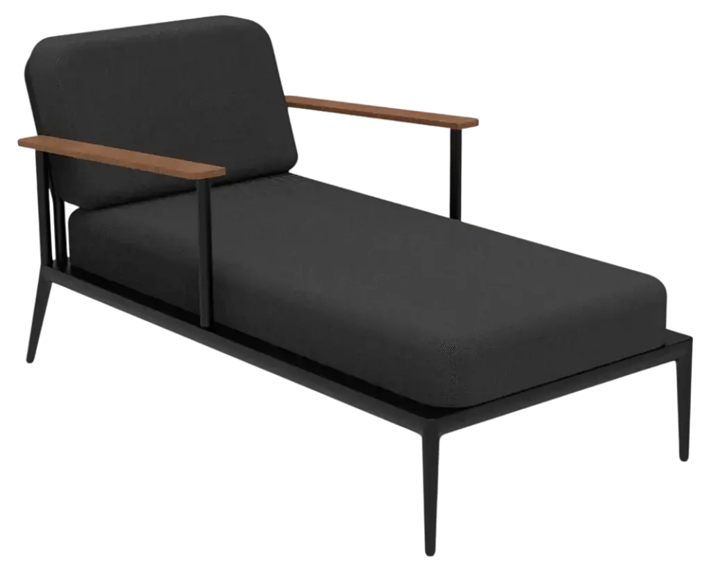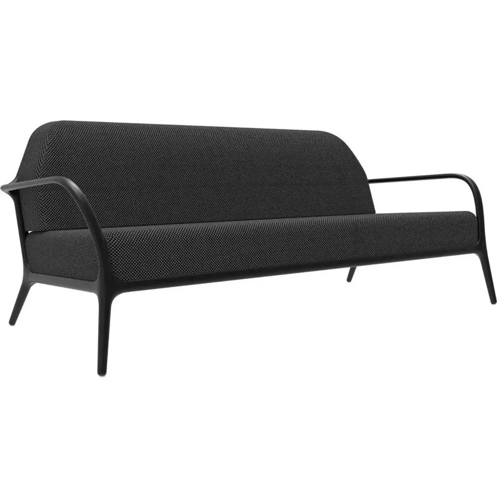 Xaloc black sofa by mowee dimensions: d100 x w200 x h81 cm (seat height 42 cm) material: aluminium, textile weight: 46 kg also available in different colors and finishes. Xaloc synthesizes the lines of interior furniture to extrapolate to the exterior, creating an elegant and versatile collection that can coexist in both contexts. The textile of its elements also want to represent this concern to provide the exterior with the warmth of the interior furniture. The name xaloc comes from the wind with the same name. A strong wind typical of the mediterranean area. A wind capable of eroding the environment it meets. The shapes of the collection represent this wind-induced erosion that generates natural and harmonic forms.