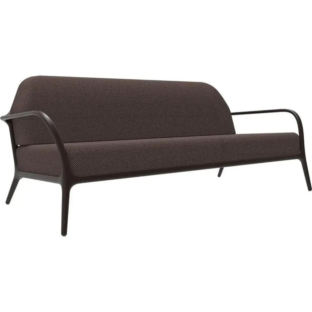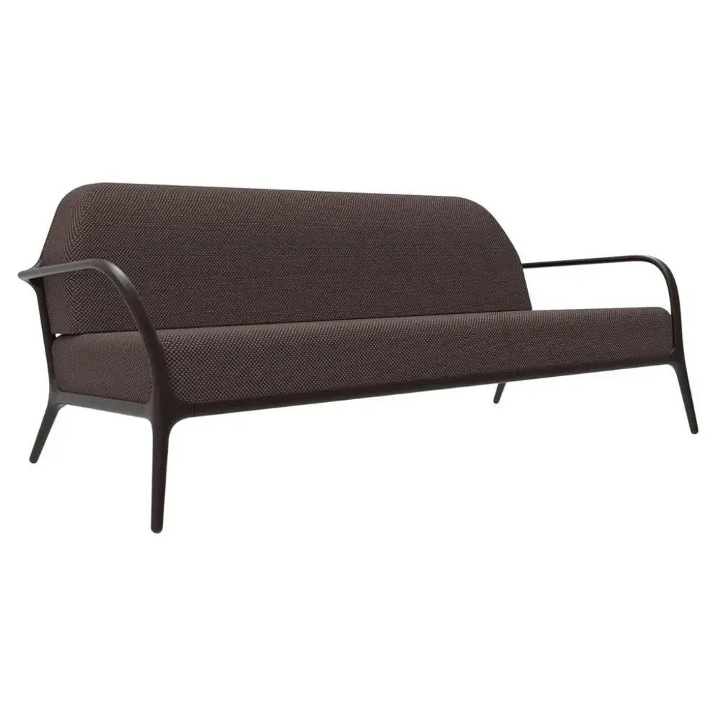 Xaloc chocolate sofa by mowee dimensions: d 100 x w 200 x h 81 cm (seat height 42 cm) material: aluminium, textile weight: 46 kg also available in different colours and finishes. Xaloc synthesizes the lines of interior furniture to extrapolate to the exterior, creating an elegant and versatile collection that can coexist in both contexts. The textile of its elements also want to represent this concern to provide the exterior with the warmth of the interior furniture. The name xaloc comes from the wind with the same name. A strong wind typical of the mediterranean area. A wind capable of eroding the environment it meets. The shapes of the collection represent this wind-induced erosion that generates natural and harmonic forms.