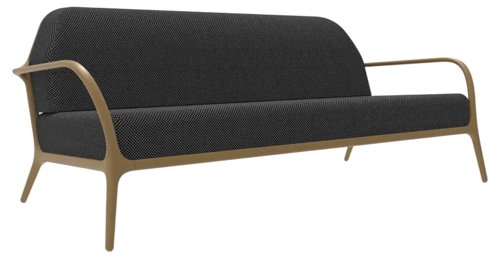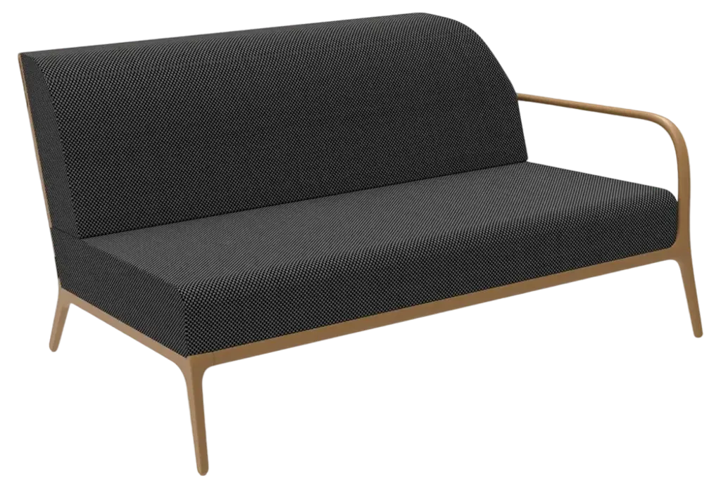 Xaloc gold sofa by MOWEEDimensions: D100 x W200 x H81 cm (Seat Height 42 cm)Material: Aluminum, TextileWeight: 46 kgAlso Available in different colors and finishes. Xaloc synthesizes the lines of interior furniture to extrapolate to the exterior, creating an elegant and versatile collection that can coexist in both contexts. The textile of its elements also want to represent this concern to provide the exterior with the warmth of the interior furniture. The name Xaloc comes from the wind with the same name. A strong wind typical of the Mediterranean area. A wind capable of eroding the environment it meets. The shapes of the collection represent this wind-induced erosion that generates natural and harmonic forms.Möwee is part of the work, effort and commitment of Gaviota, a leading company in the outdoor sector. It was set up as an independent venture to broaden horizons in the outdoor furniture world, with its own distinctive character and way of doing things. Freshness, simplicity, quality and design are at the heart of its DNA.