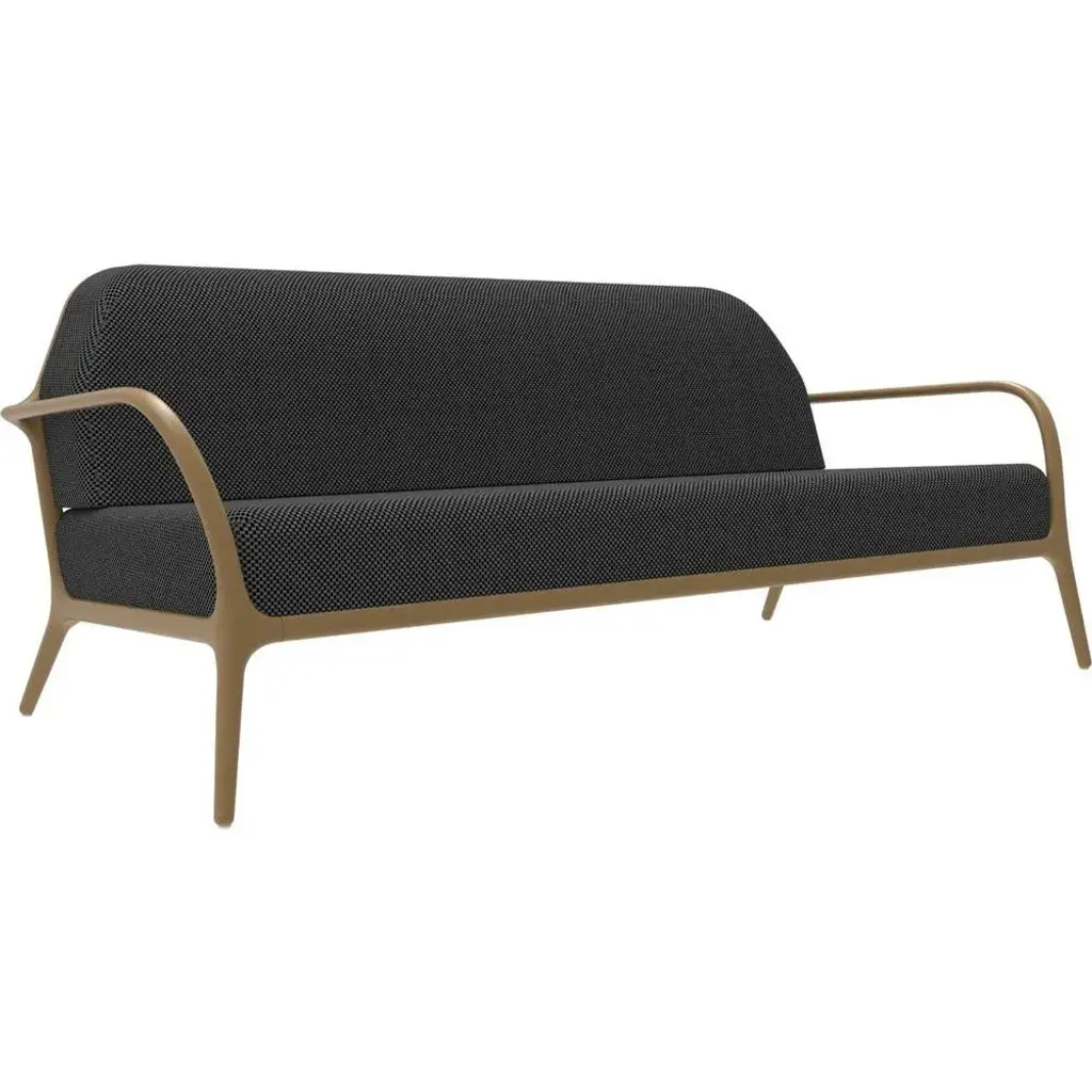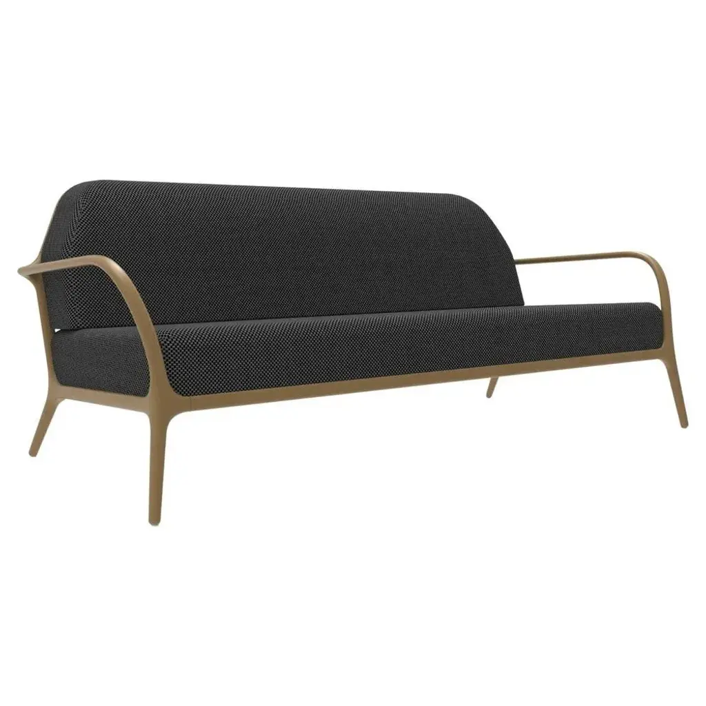 Xaloc gold sofa by mowee dimensions: d100 x w200 x h81 cm (seat height 42 cm) material: aluminum, textile weight: 46 kg also available in different colors and finishes. Xaloc synthesizes the lines of interior furniture to extrapolate to the exterior, creating an elegant and versatile collection that can coexist in both contexts. The textile of its elements also want to represent this concern to provide the exterior with the warmth of the interior furniture. The name xaloc comes from the wind with the same name. A strong wind typical of the mediterranean area. A wind capable of eroding the environment it meets. The shapes of the collection represent this wind-induced erosion that generates natural and harmonic forms.