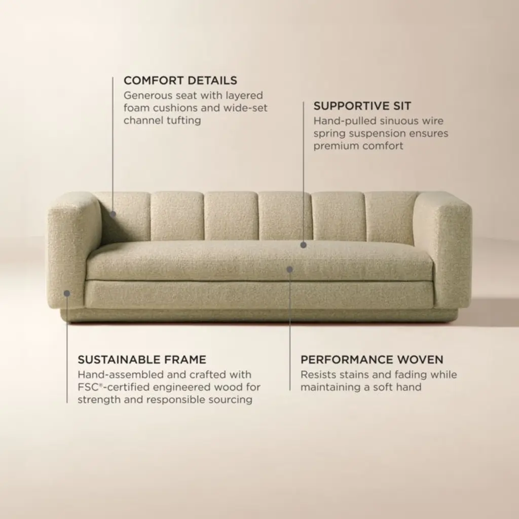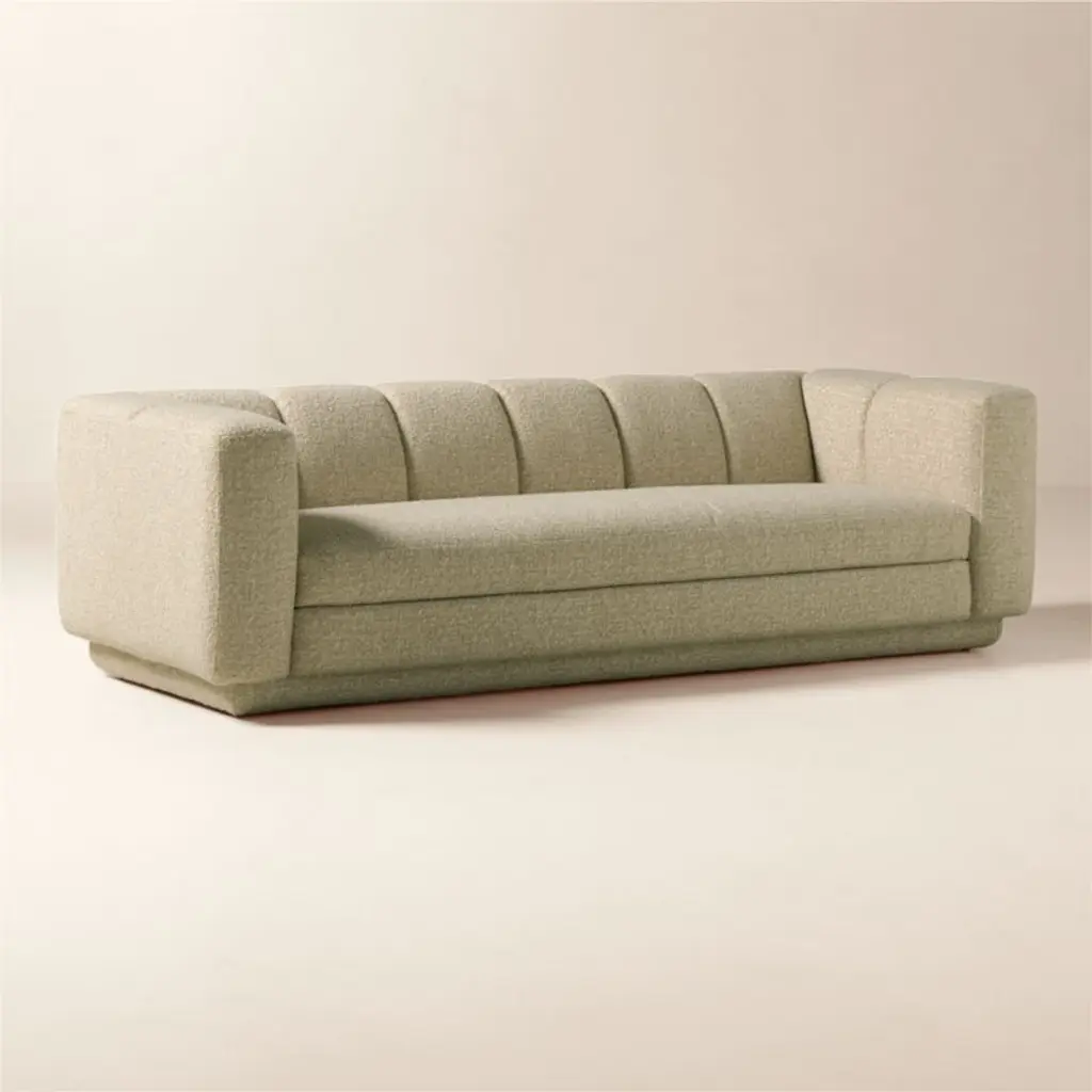 Taking stylistic nods from 1970s Italian design and the designers' own laid-back Southern California aesthetic, the Yarrow sofa by Lawson-Fenning has generous proportions for gathering and relaxing. A deep seat is complemented by a relaxed back with wide-set channel tufting that highlights the rich texture of the easy-care textured woven performance upholstery. Each piece is assembled by hand to ensure a level of quality befitting the design. CB2 exclusive.