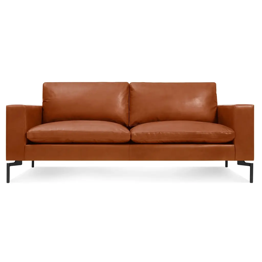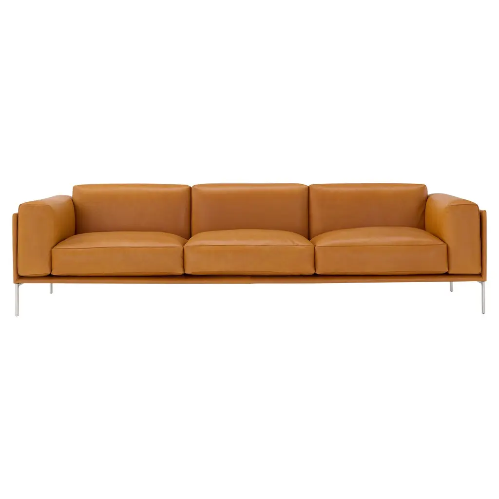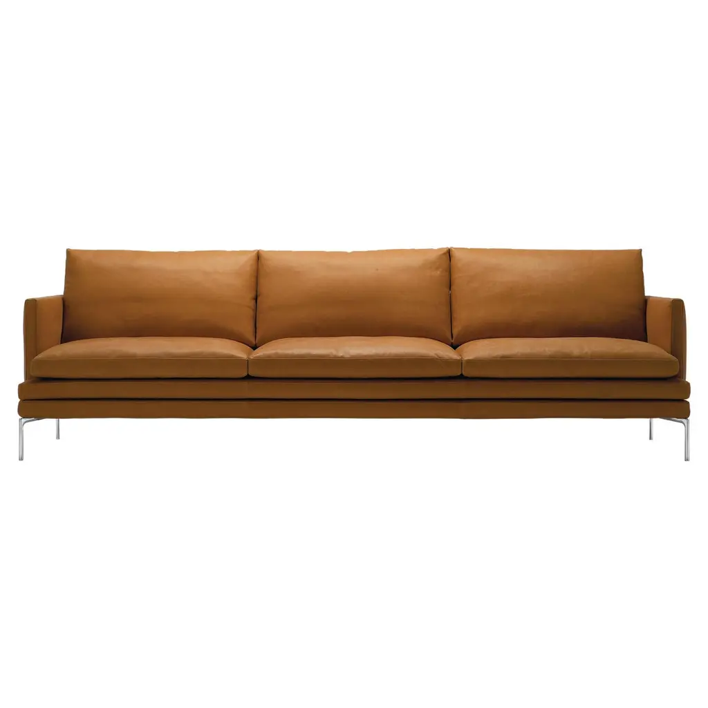 Zanotta William Monobloc Small Sofa in Brown Leather by Damian WilliamsonAluminum alloy feet, either polished or with natural or black nickel-satin finish, or black painted. Steel frame. Elastic strips suspension. Seat upholstered with polyurethane/heat-bound polyester fibre. Upholstery of back and armrest in self-extinguishing polyurethane foam /heat-bound polyester fibre. Seat cushion upholstered with goose down – 100% pure material and polyurethane insert. Back cushion with goose down – 100% pure material. Fixed internal nylon cover and cotton cover for the cushions. Removable external fabric or leather cover. Additional Information:Material: Upholstery, aluminumUpholstery: Pelle naturale extra, cat. 99, 0414Frame finish: Polished aluminumDimensions: 180 W x 90 D x 87 H cmSeat height: 43Available in other upholstery options: Cat. 20, Cat. 30, Cat. 40, Leather 90, Leather 95, Leather 98Available in other frame finish options: Natural, black nickel-satin, black paintedAvailable in other size option: LargeAvailable in other structural options