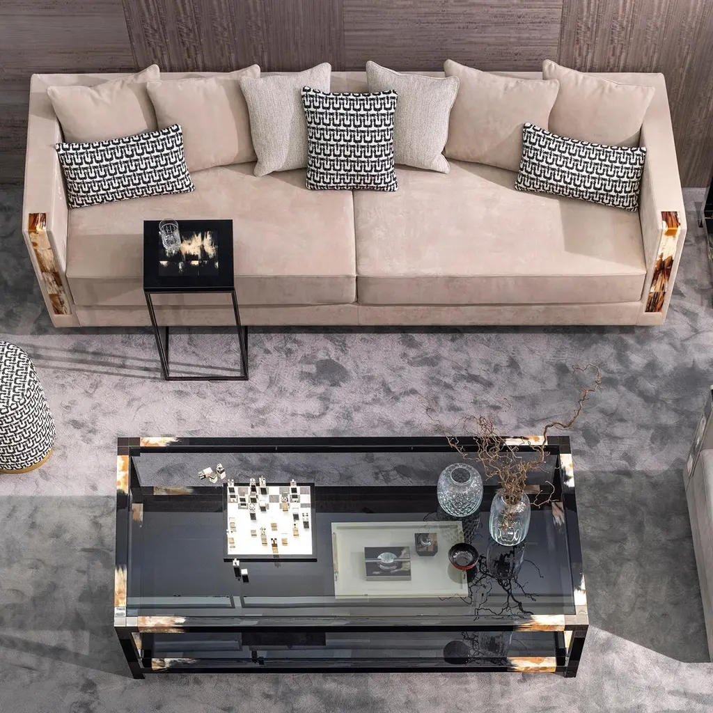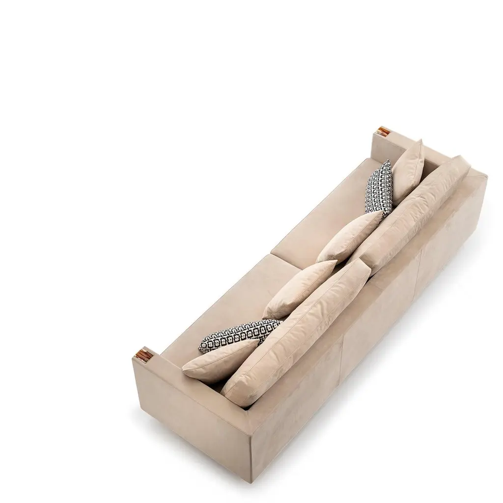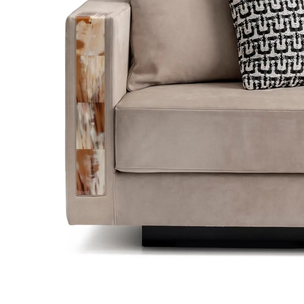 An archetype of timeless elegance and comfort, the Zeus 4-seat sofa effortlessly combines prized materials and expert detailing. Upholstered in premium Carmen nabuk leather (cat. Luxe), Conchiglia colour, the piece is made an ideal statement by unique L-shaped armrests in Corno Italiano with gloss finish, combining the state-of-the-art knowledge with the skills of experienced artisans. A selection of curated fabrics and leathers or COM options are also available and will allow you to adapt this design to your needs and tastes. Sat atop a wooden base with a high-polished black finish, Zeus sofa ensures optimum seating comfort, courtesy of its padding in multi-density expanded polyurethane foam, goose down and memory foam. Notes:- Colors and shades of Corno Italiano processed by our Company are unique and due to the natural origin of raw material. For this reason Corno Italiano tones that can be seen in pictures are indicative and cannot be reproduced in finished products.- Price is referred to sofa and decorative cushions upholstered in the same material and color.