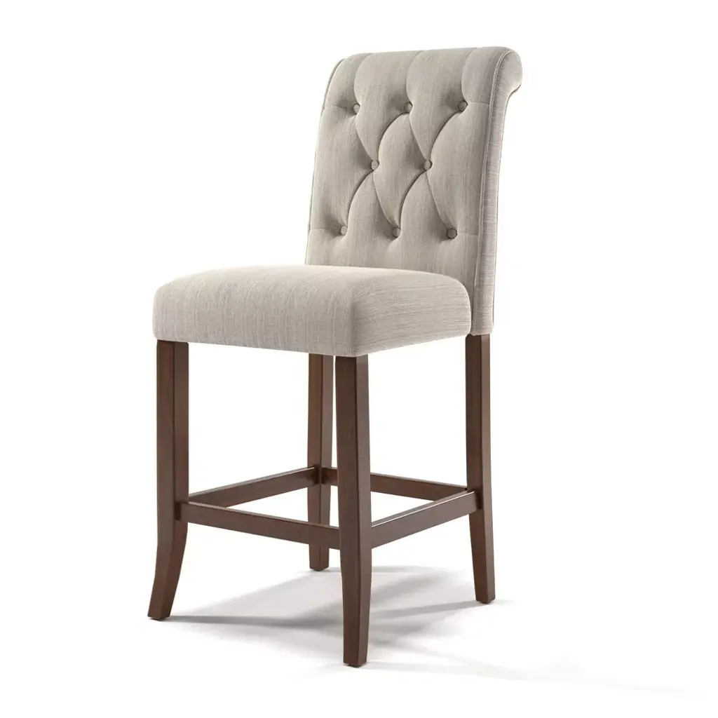 This wood pub chair features an elegant scrolled design with luxurious, button-tufted fabric upholstery and a beige finish. Seat guests on the spacious, foam-filled seats while the sturdy tapered legs provide a solid foundation. The frames are crafted of solid wood and wood veneer for lasting quality and ample support.