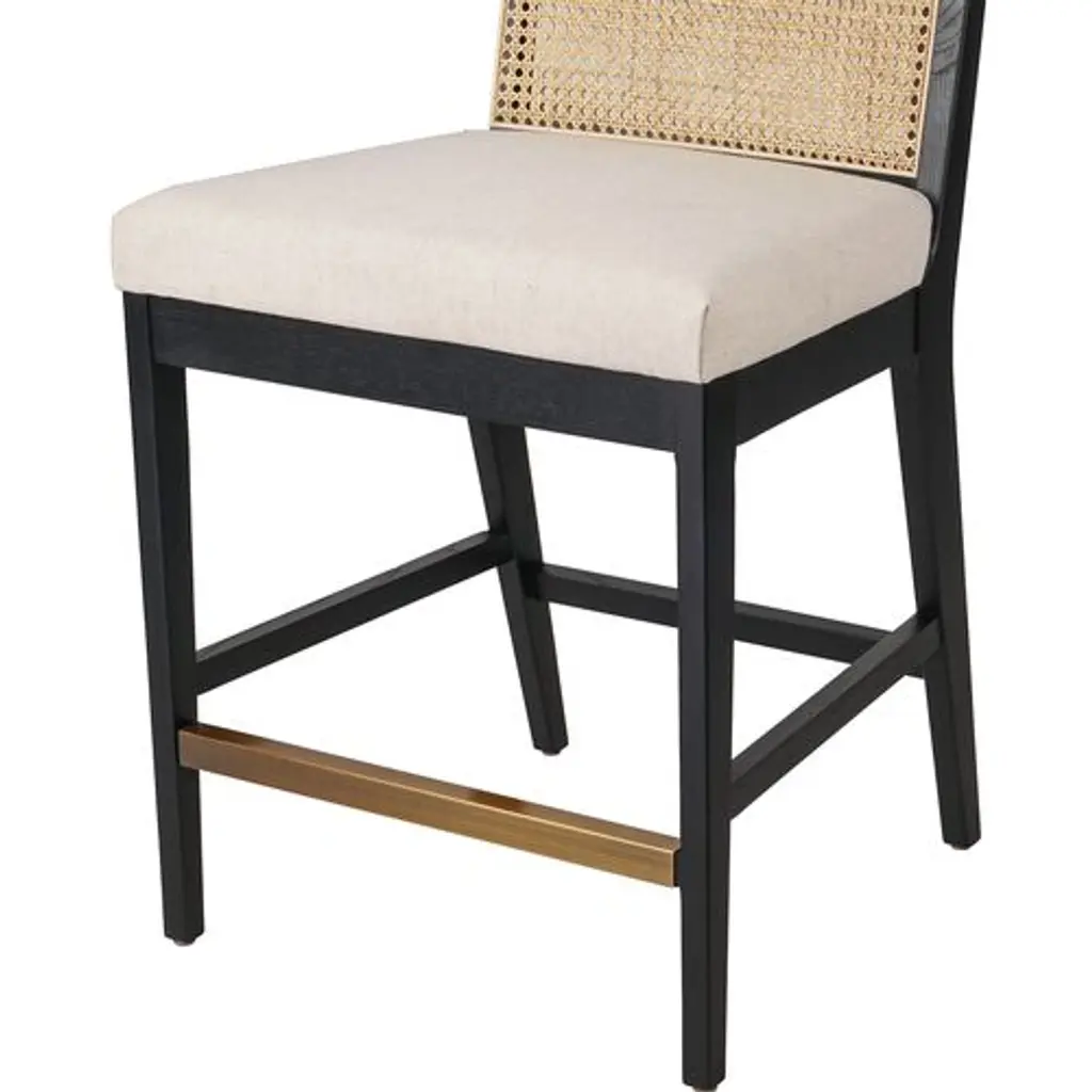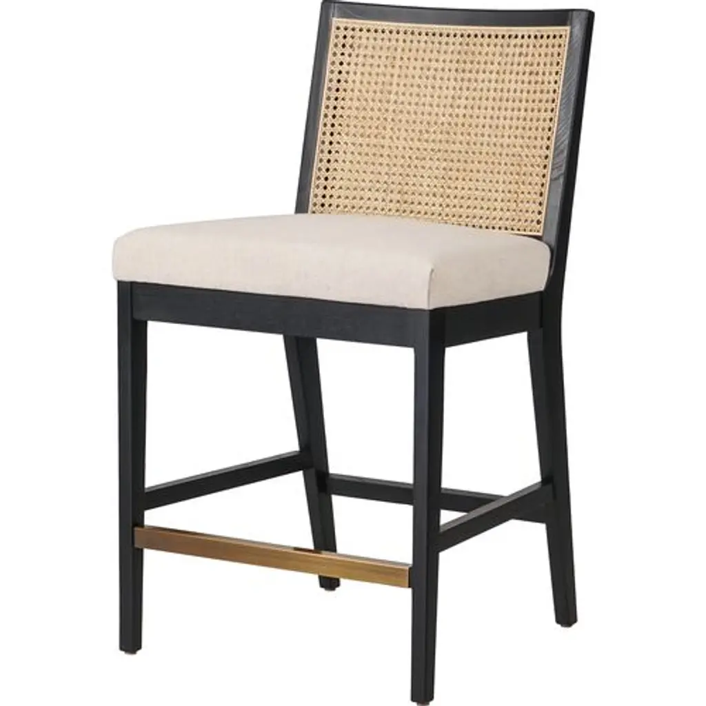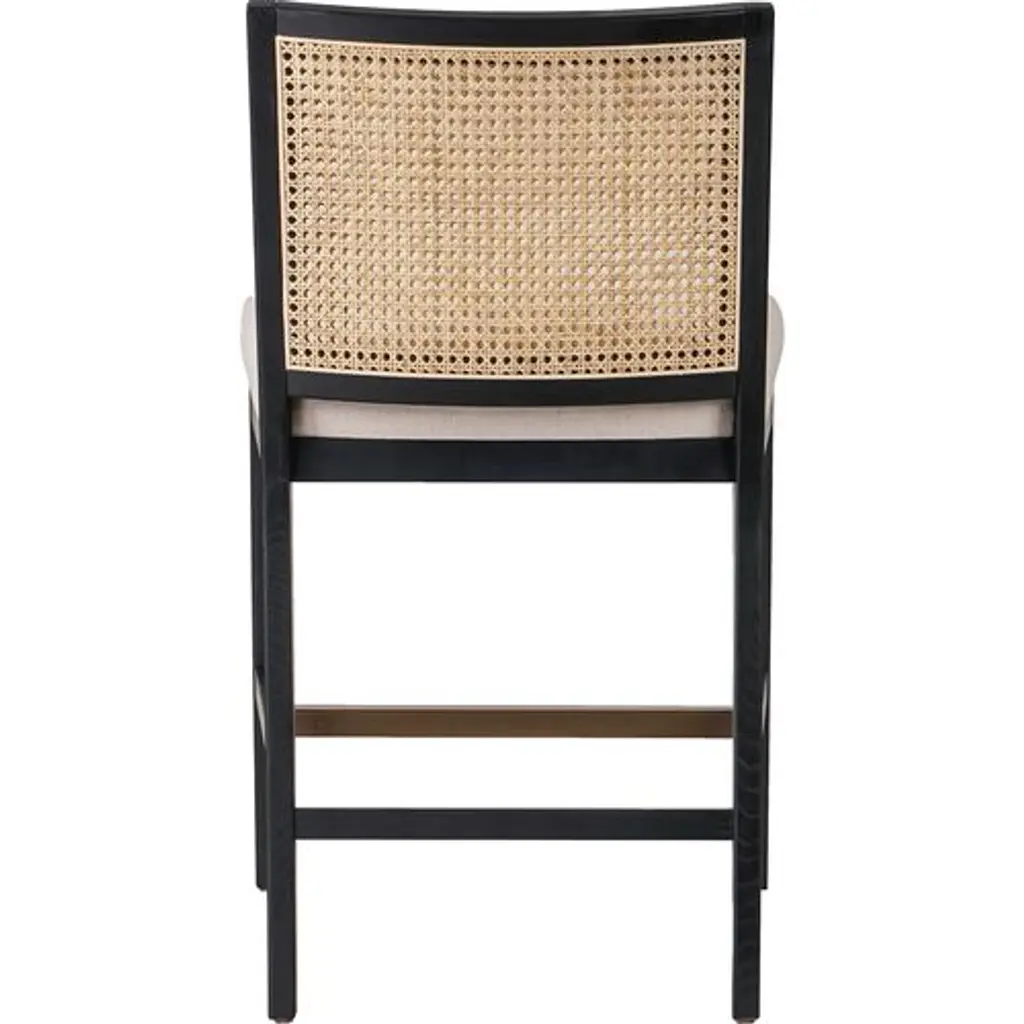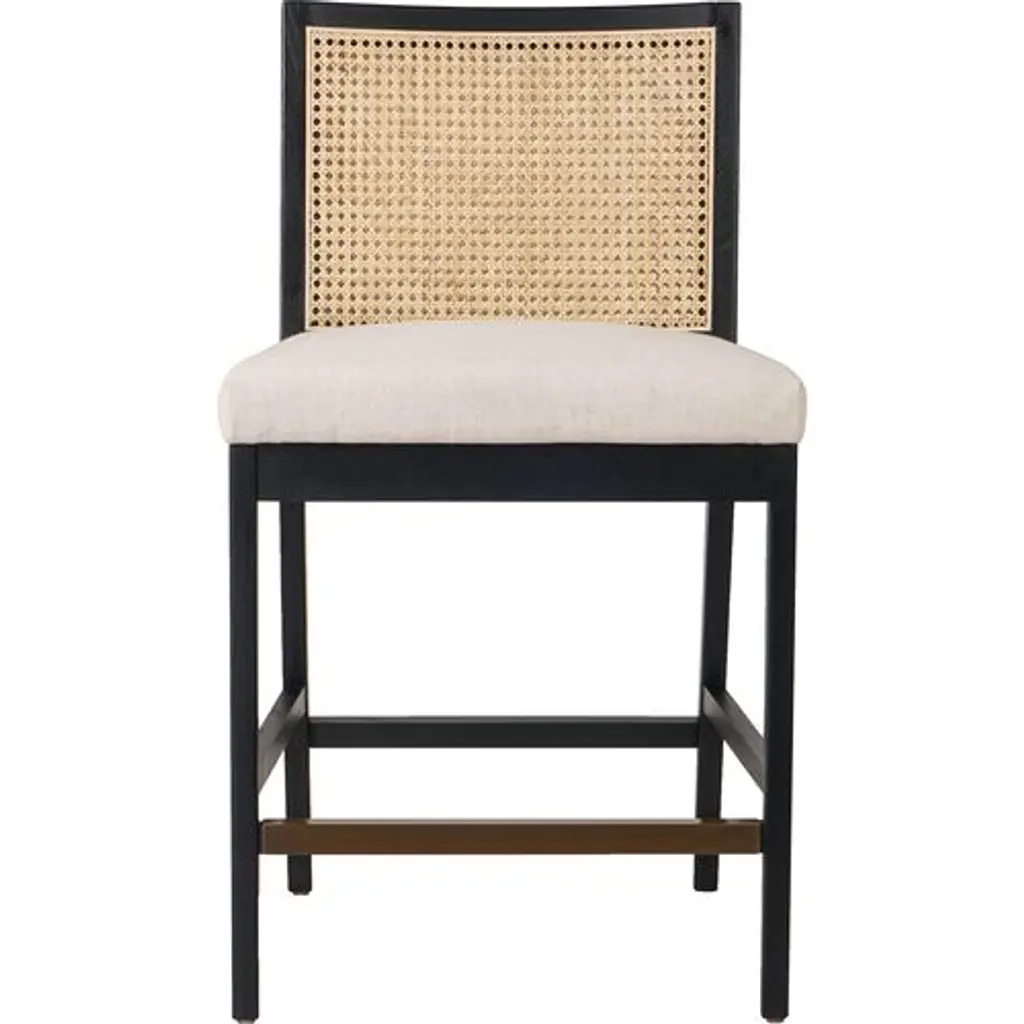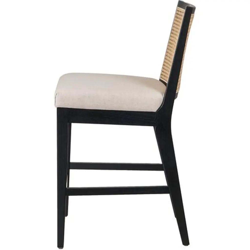 Our popular Aimee Cane Dining Armchair is now an equally chic barstool. The caned back panel is set within a darker wood frame, providing tonal and textural contrast. The well-cushioned seat is upholstered in stain-resistant performance fabric, making this a great choice for households with kids or spill-prone adults.