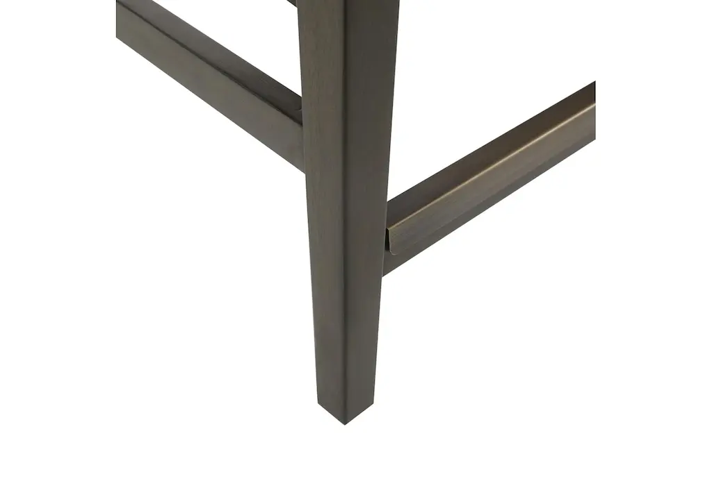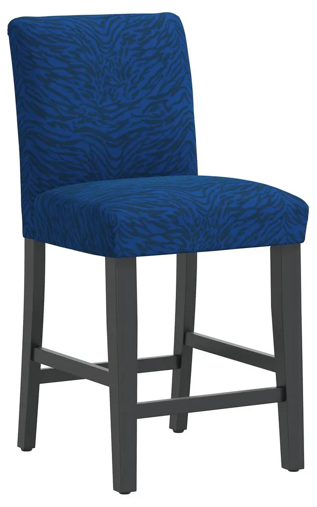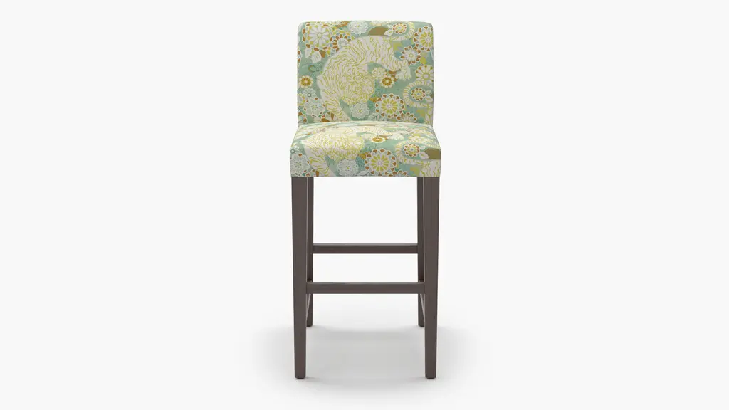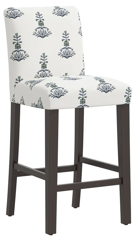 The Antonella Floral 25" Counter Stool with back is a traditional-style stool with a tall back and cushioned seat, made of solid wood and plywood with a 100% polyester upholstery in a blue multi-color design. Assembly is required and the stool features a dark coffee wood finish with a bronze kickplate and web suspension seat construction.