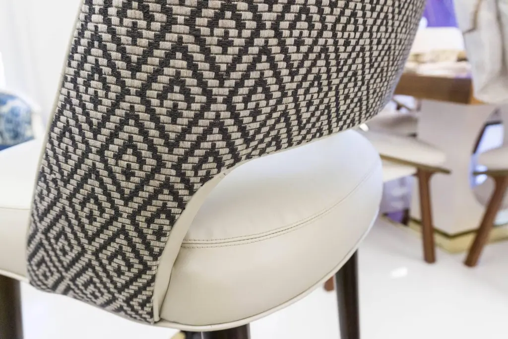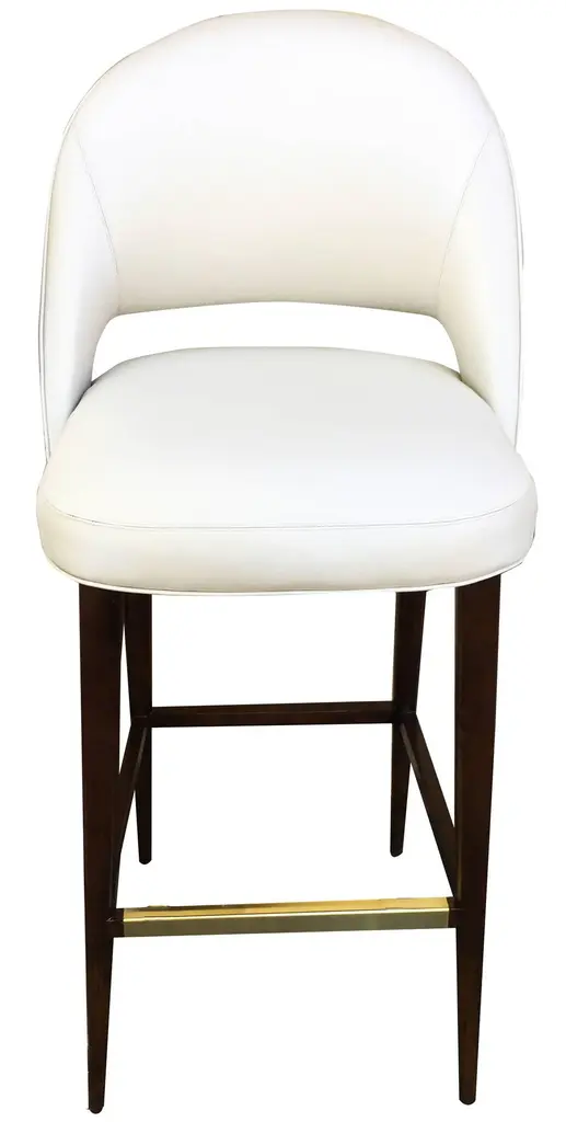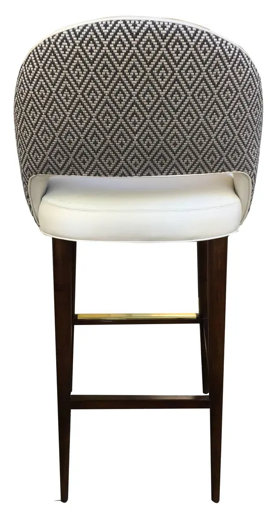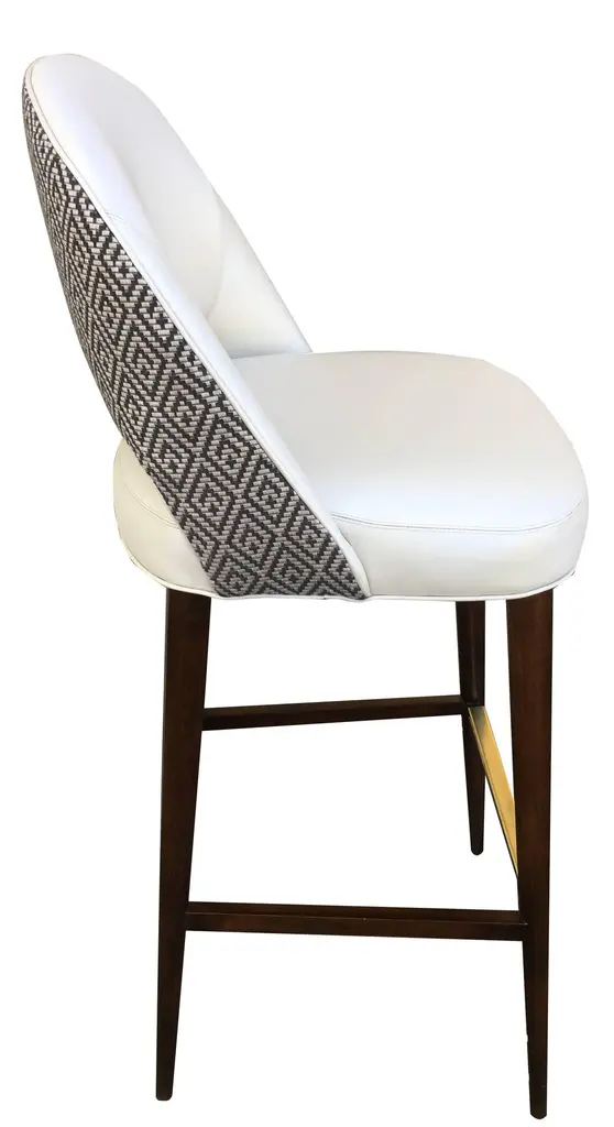 Named La Pez, this original design by us is made to order at it's own workroom in Norwalk, CT. Features tapered peg legs in dark walnut, a brass foot plate, high quality vinyl on the inside of the seat and a contrasting woven fabric on the back.This seat was designed to be compact for projects where there's not quite enough room to fit "one more" stool at a bar or counter.Wood stain, foot plate metal, vinyl and fabric colors are modifiable (see photos). Seat height and foot rest height are modifiable. Popular choice for folks with specific height requirements.Must order a minimum of 3 at this price. For fewer than three please ask us.Outside measurements:43" H x 19 1/4" W x 20" DInside measurements:29 1/2" H seat x 18" W x 16" DFoot rest at 11"