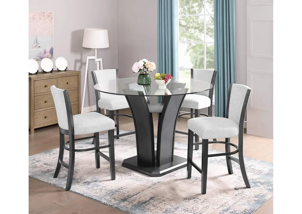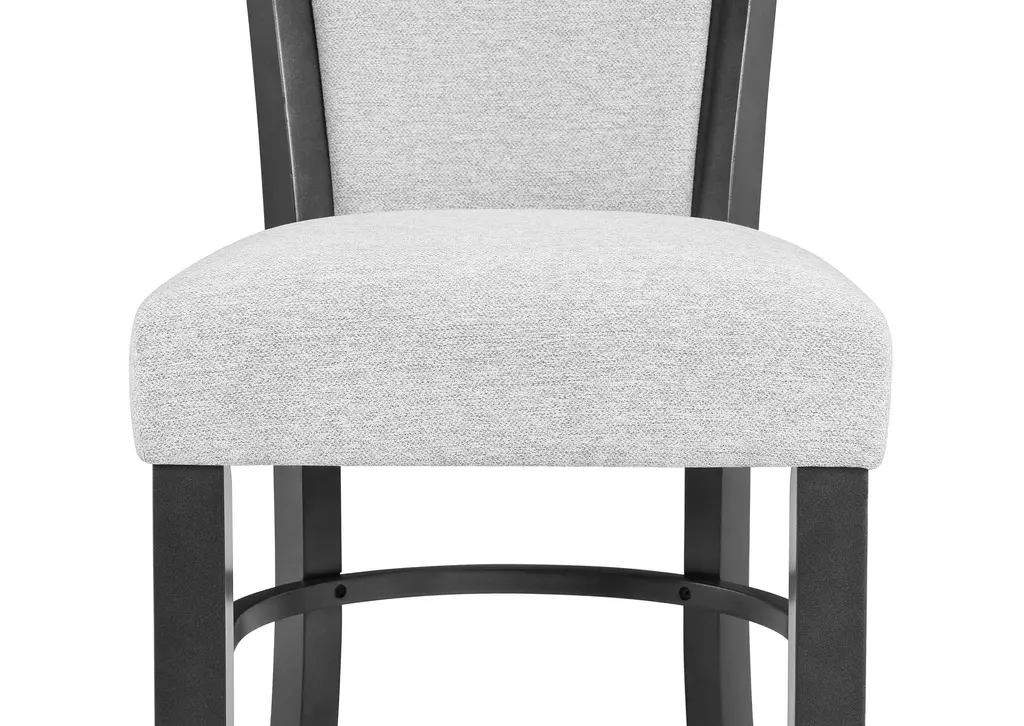 This sleek and modern counter height dining group bridges form and function. The sculptural dining table has a sturdy base and the glass top allows views of the upholstered open shelf. Streamlined chairs feature pewter finished wood and dove gray upholstery for contrast. Weight 42.300 lbs. (19.04kgs.)