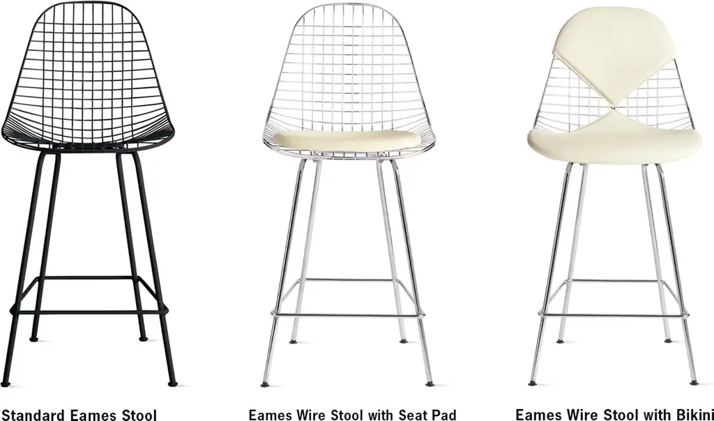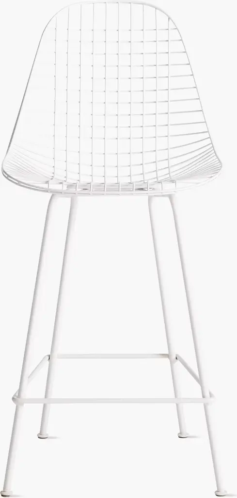 While refining the design of their molded shell chairs, Charles and Ray Eames began experimenting with bent and welded wire. The resulting Wire Stool (1951) borrows the shell shape but reimagines the form in strands of steel. Each seat features two gauges of the material, a mixture that adds strength but keeps manufacturing costs low. This is an authentic Eames Wire Stool by Herman Miller.