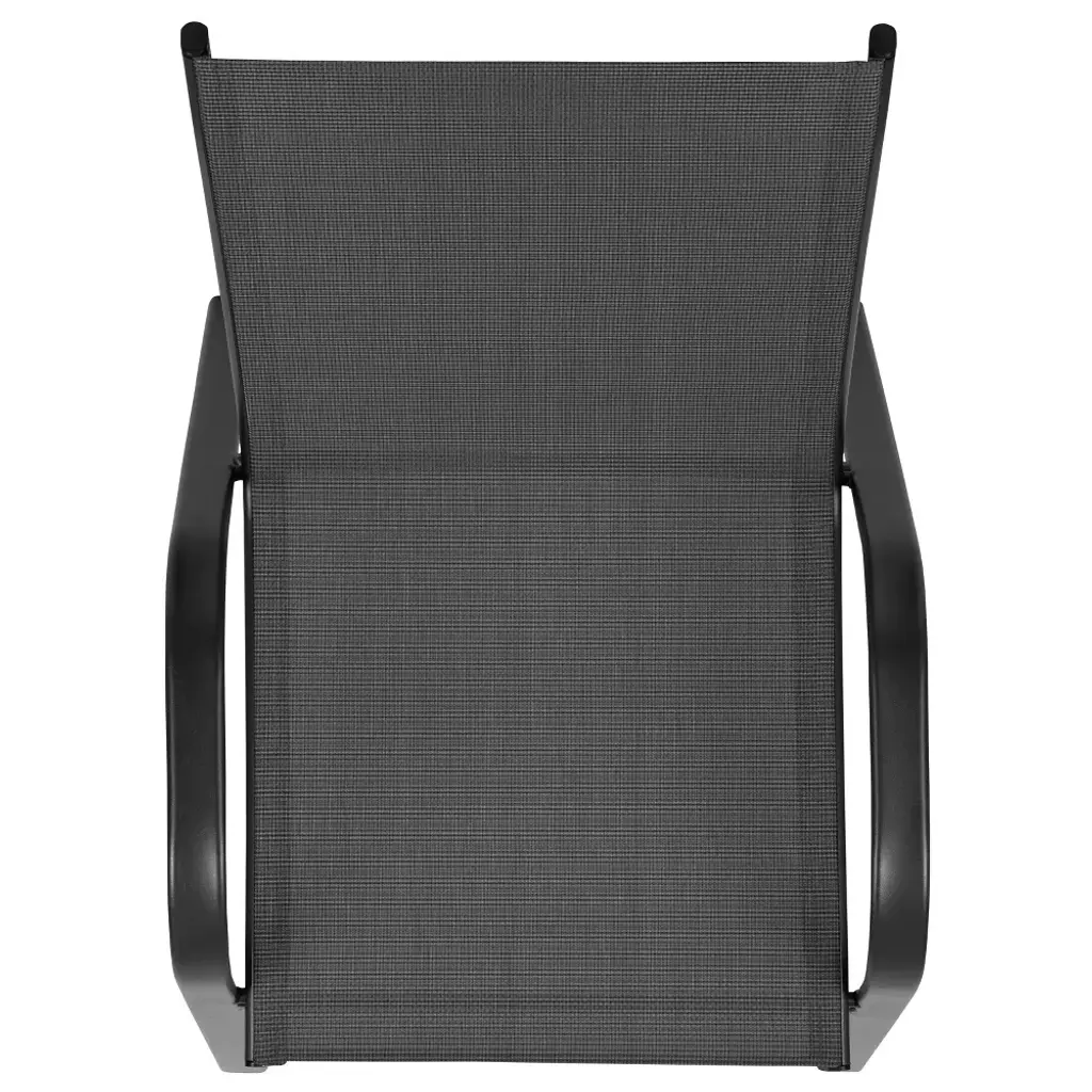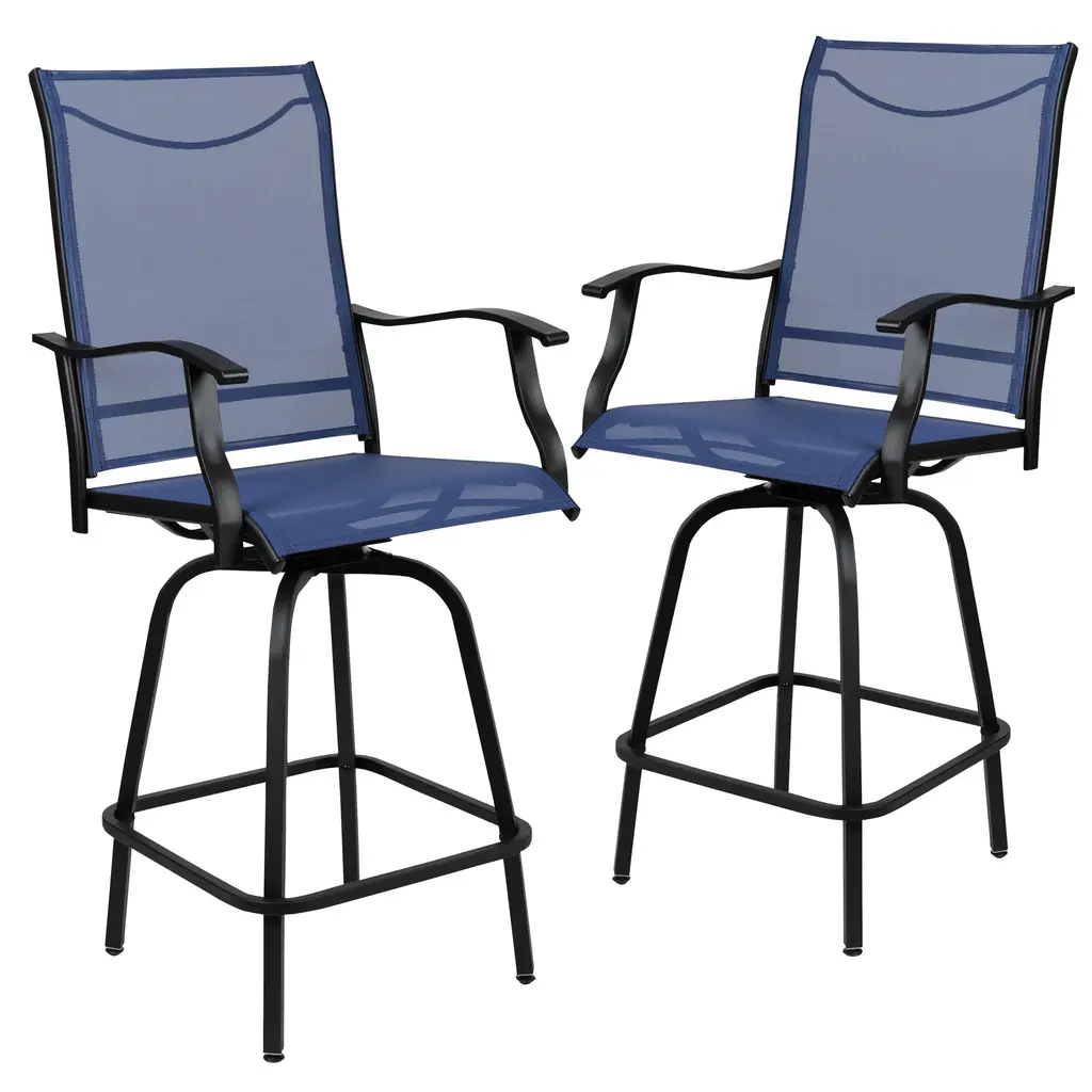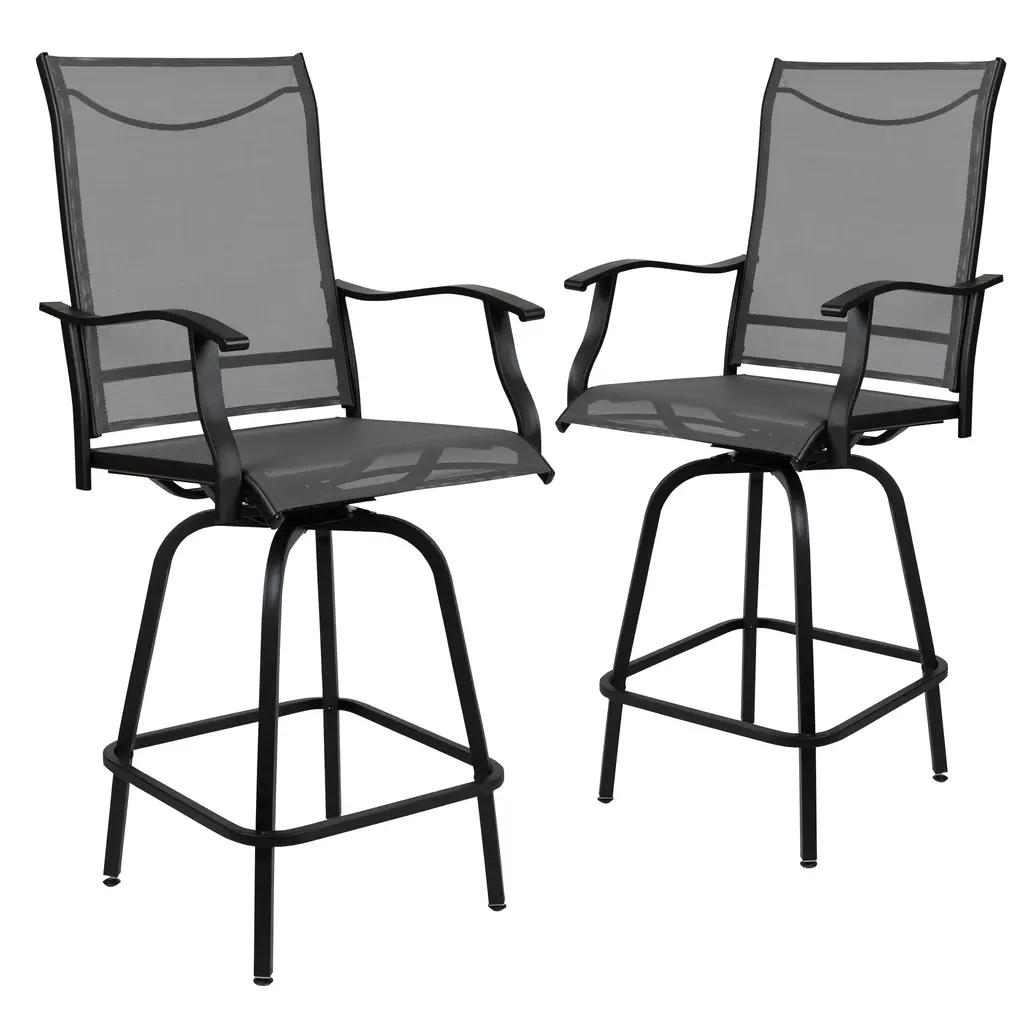 Furnish your outdoor space with this patio bar stool that coordinates well with our glass bar height metal patio bar table. Use this barstool with back as additional outdoor seating around your deck and patio when you have gatherings. As an added bonus these patio stools blend in almost any decor. The patio dining stool is very comfortable in a textilene upholstery that is breathable to keep you cool during the hot summer months. The sling style stool with footrest provides a comfortable resting place for your feet, while the arms relieve pressure from your upper body. Place these patio stools around your outdoor bar while you wait for a drink or the food to come off the grill. Whether you have a backyard with a pool or green space these outdoor barstools will add attractive seating for your family and guests to enjoy. Additional Features: Plastic Floor Glides protect floors when used indoors, Patio stool for sunroom, garden, porch, deck, or poolside seating, Pair with our Glass Bar Height Metal Patio Bar Table