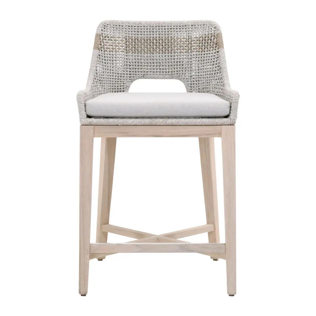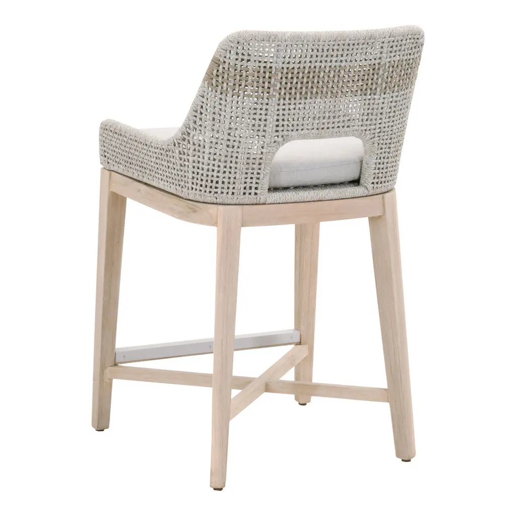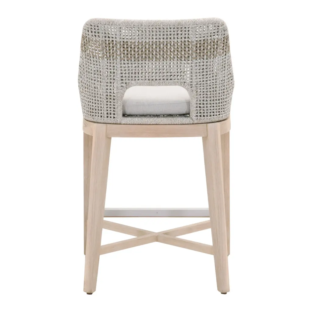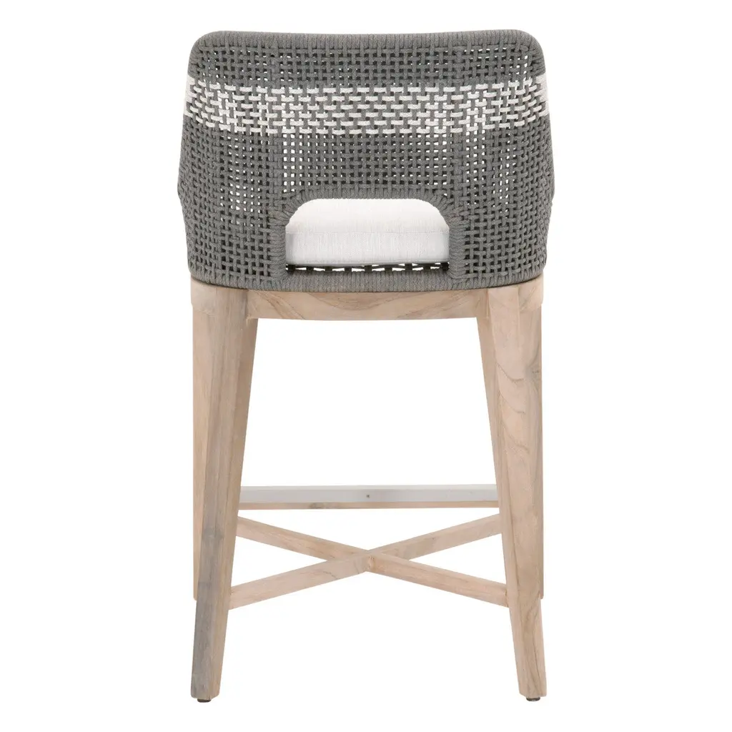 This woven outdoor counter stool will add a touch of coastal style to your backyard or patio. Constructed with a stainless steel frame and solid gray teak legs, this stool is not only sturdy, but durable for outdoor use. A rich dove or taupe colored rope is tightly woven with an eye-catching solid white speckle stripe