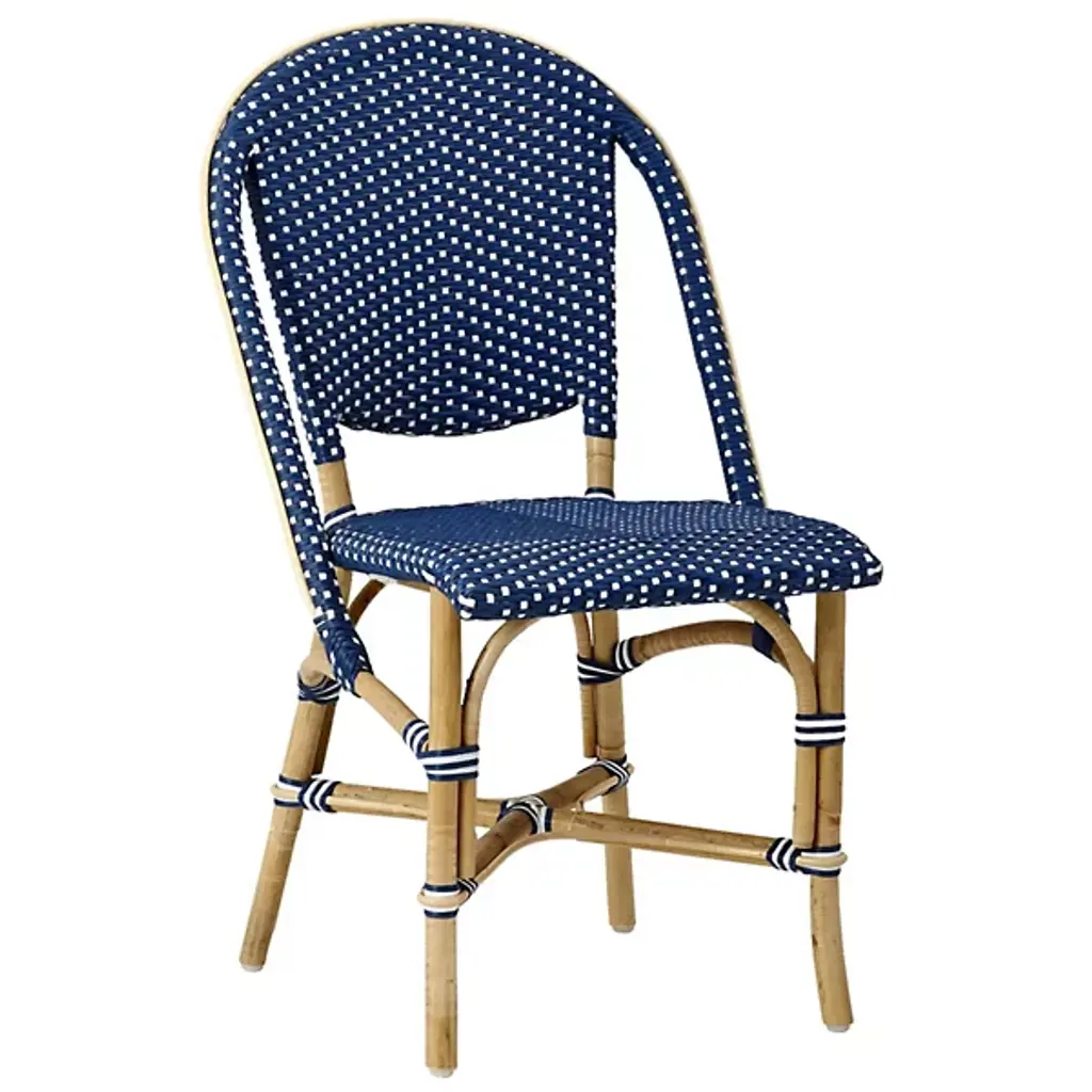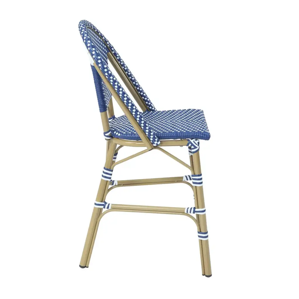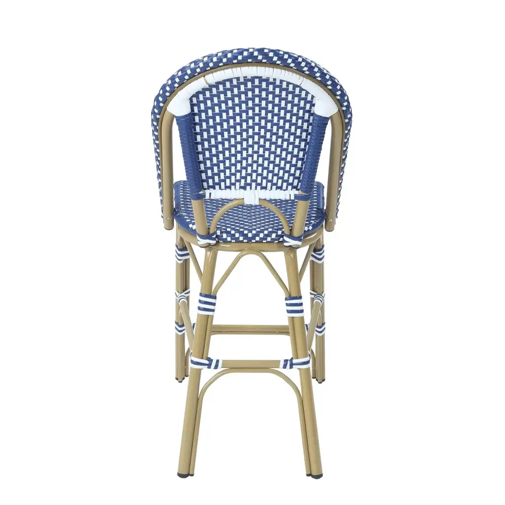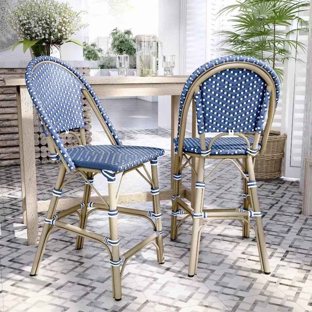 Create an outdoor bar getaway with this set of counter-height chairs. These ocean blue and white wicker seats on natural tone aluminum frames are weather resilient, withstanding UV rays and water. Their arched back design with strapped assembly takes French style bistro to bohemian bar. The 2 luxury styles meet on these beach-vibe chairs.