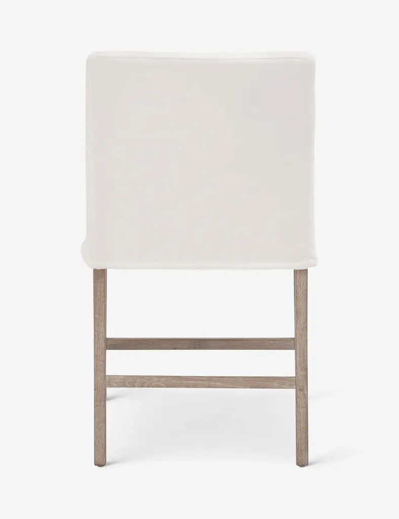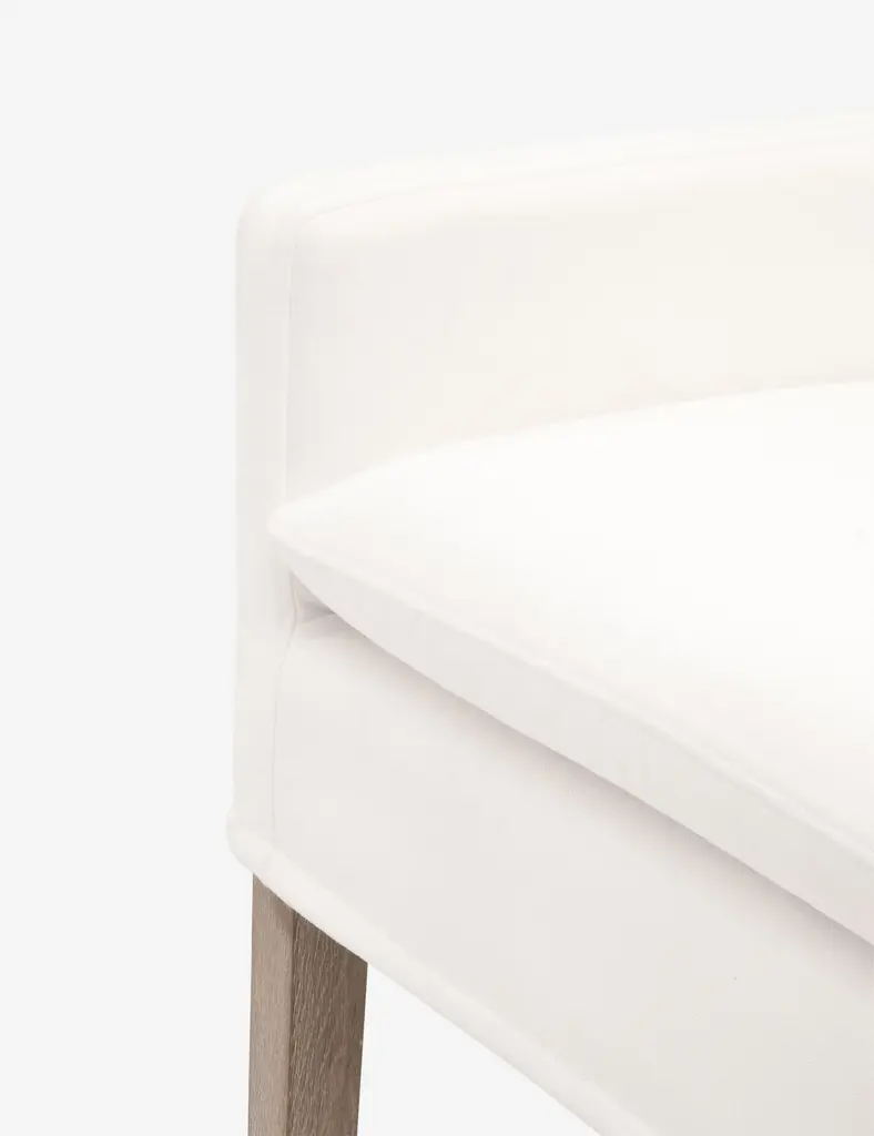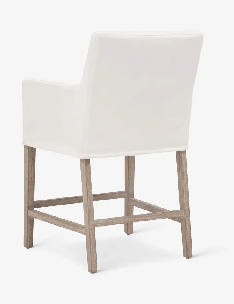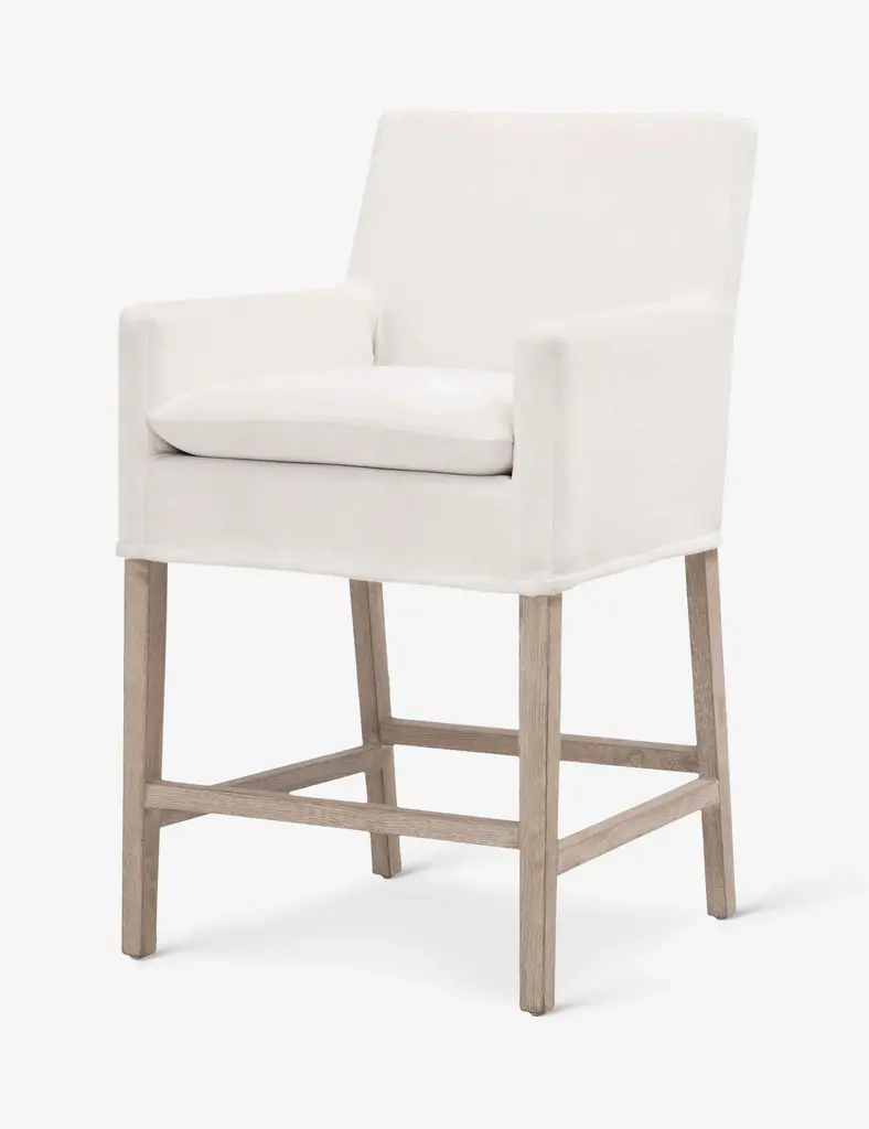 In a crisp white shade, this slipcovered counter stool is a clean-lined and comfortable addition to your dining space. Its performance fabric upholstery wraps around a solid oak base and then finished with arm rests and a cozy seat cushion. Style this stool with a marble-topped kitchen island or glossy white-finished breakfast counter.