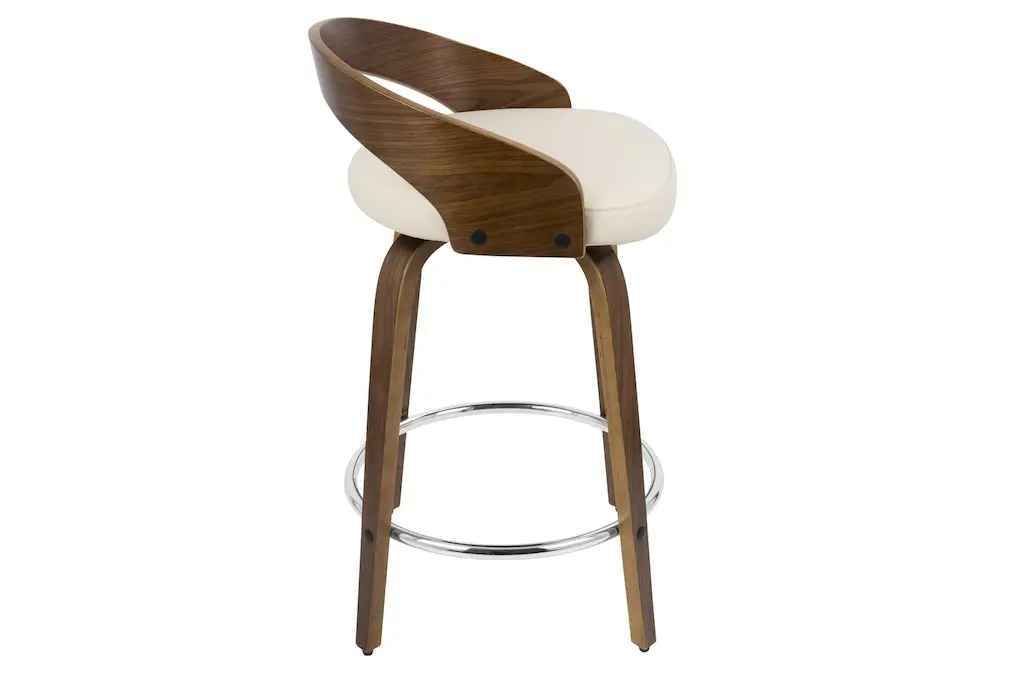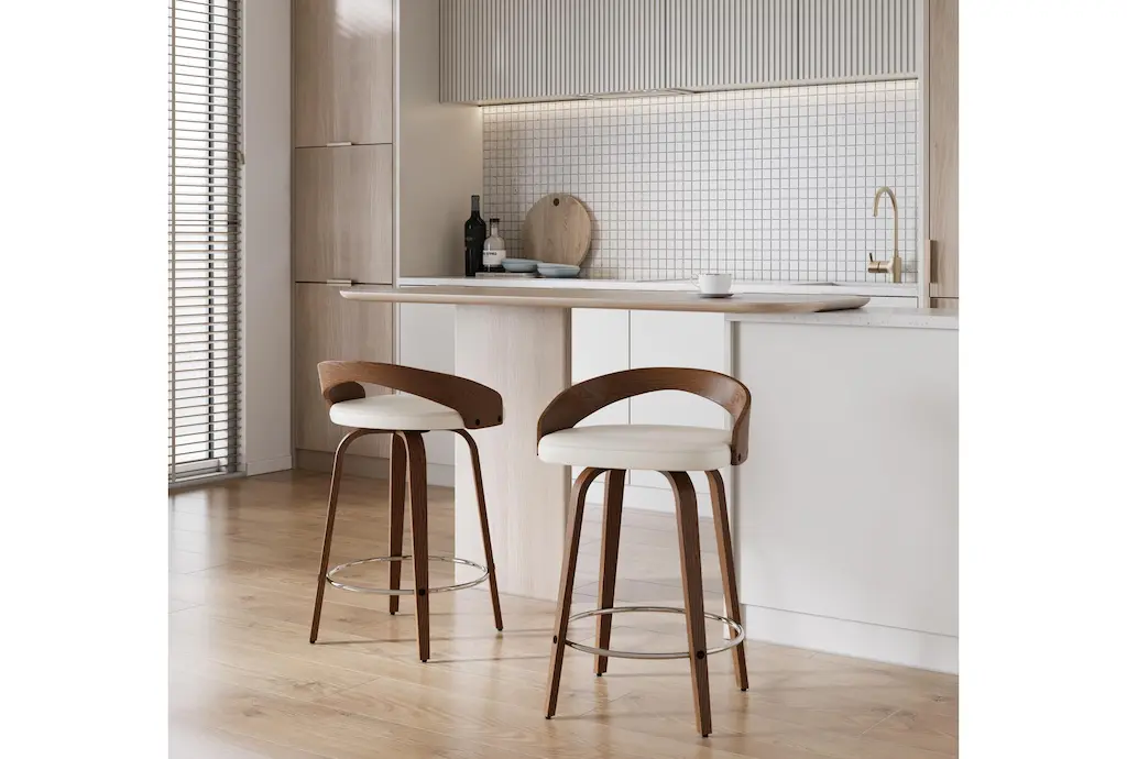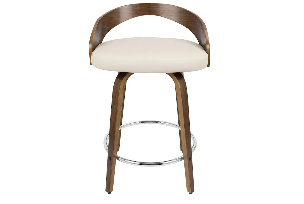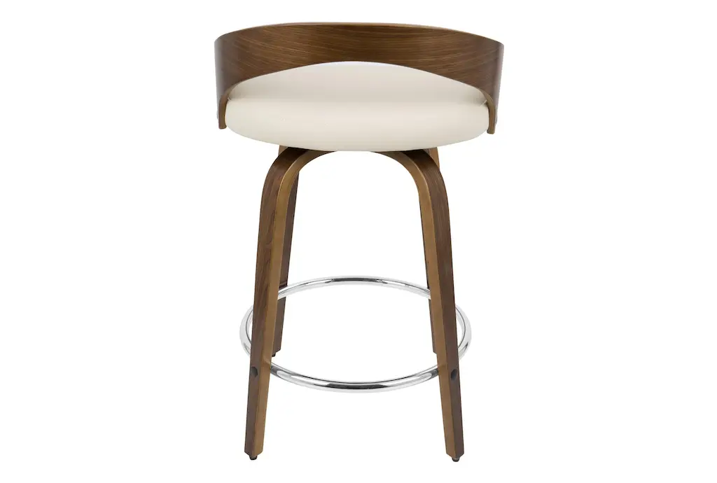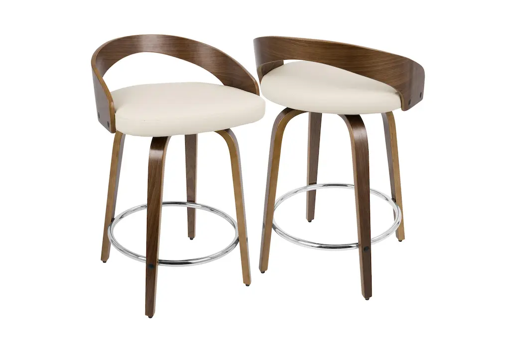 Enhance your dining area with the Gregg Cream Faux Leather Metal 24" Counter Height Stool Set of 2. These modern stools feature a stylish combination of walnut wood and cream faux leather, complemented by chrome accents that add a contemporary touch to any space. The armless design and curved shape offer both comfort and a sleek look, making them perfect for your kitchen or dining room.