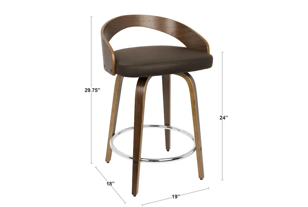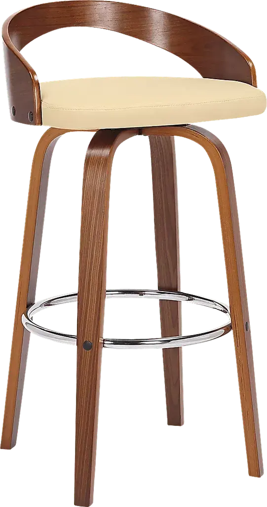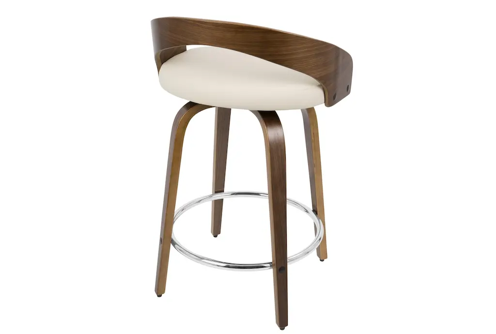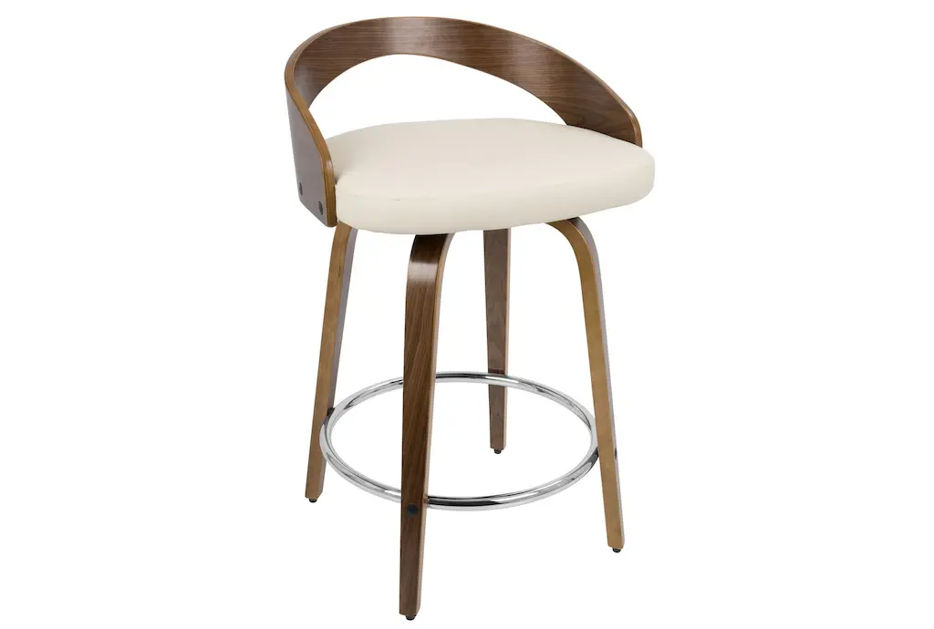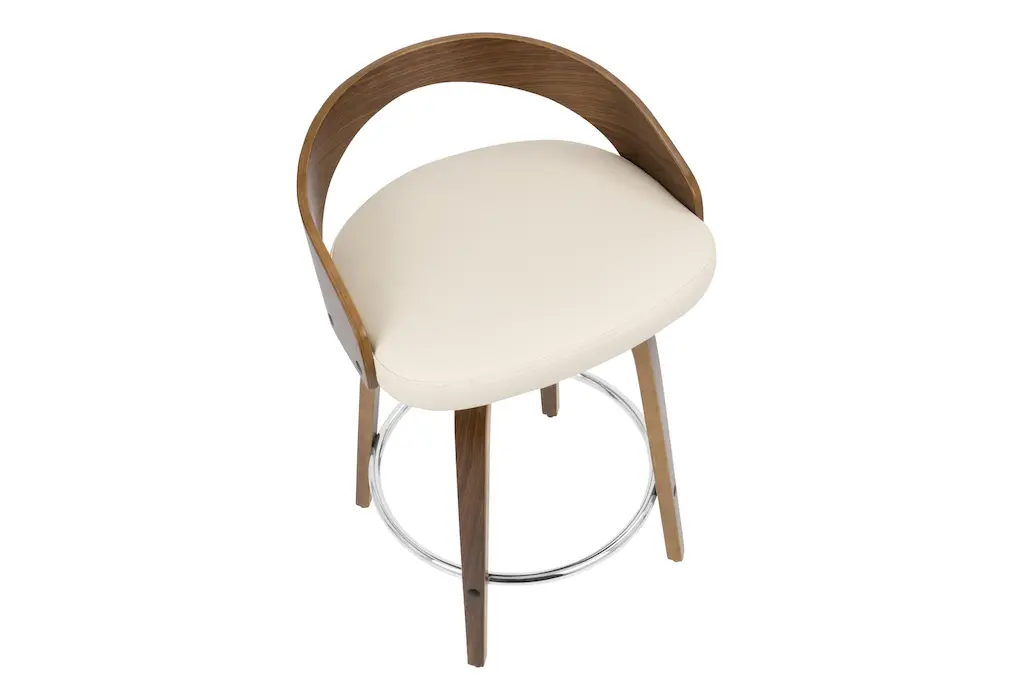 Enhance your dining area with the Gregg Cream Faux Leather Metal 24" Counter Height Stool Set of 2. These modern stools feature a stylish combination of walnut wood and cream faux leather, complemented by chrome accents that add a contemporary touch to any space. The armless design and curved shape offer both comfort and a sleek look, making them perfect for your kitchen or dining room.