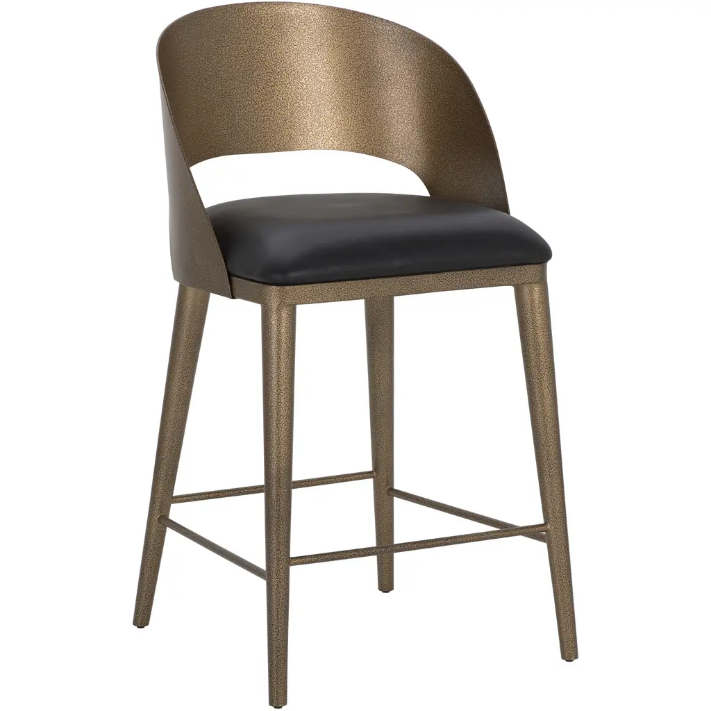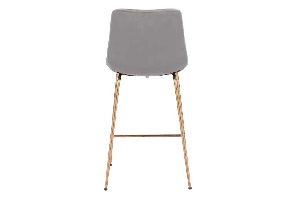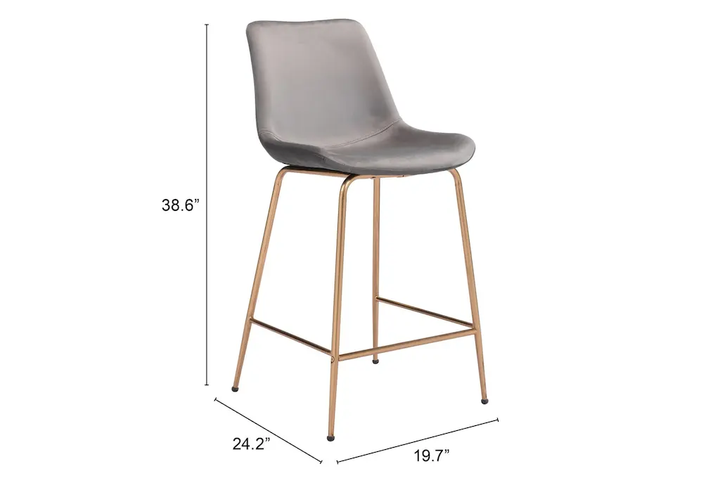 The Grey Velvet Bucket Counter Stool is a modern, armless stool with a tall back, made of metal and upholstered in soft gray velvet. Assembly is required, and the stool features a gray and gold color scheme, with steel construction and foam and 100% polyester fabric.