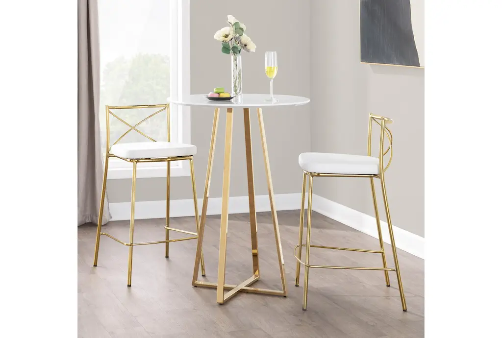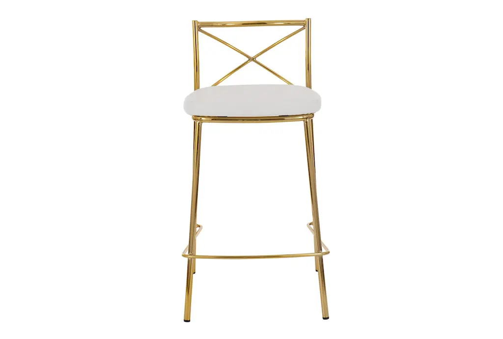 The Charlie 25" Gold and White Counter Stool Set of 2 is a modern, tall set of stools perfect for your dining room. Made from faux leather and metal, these stools are white with gold accents, offering a chic, industrial look.