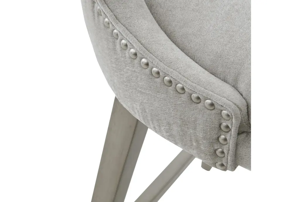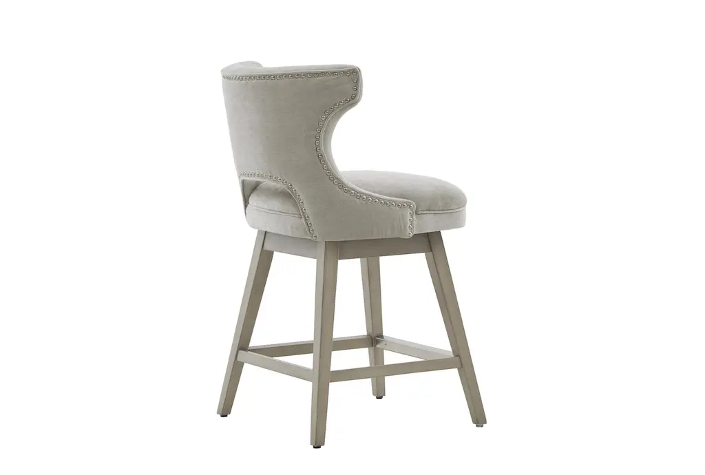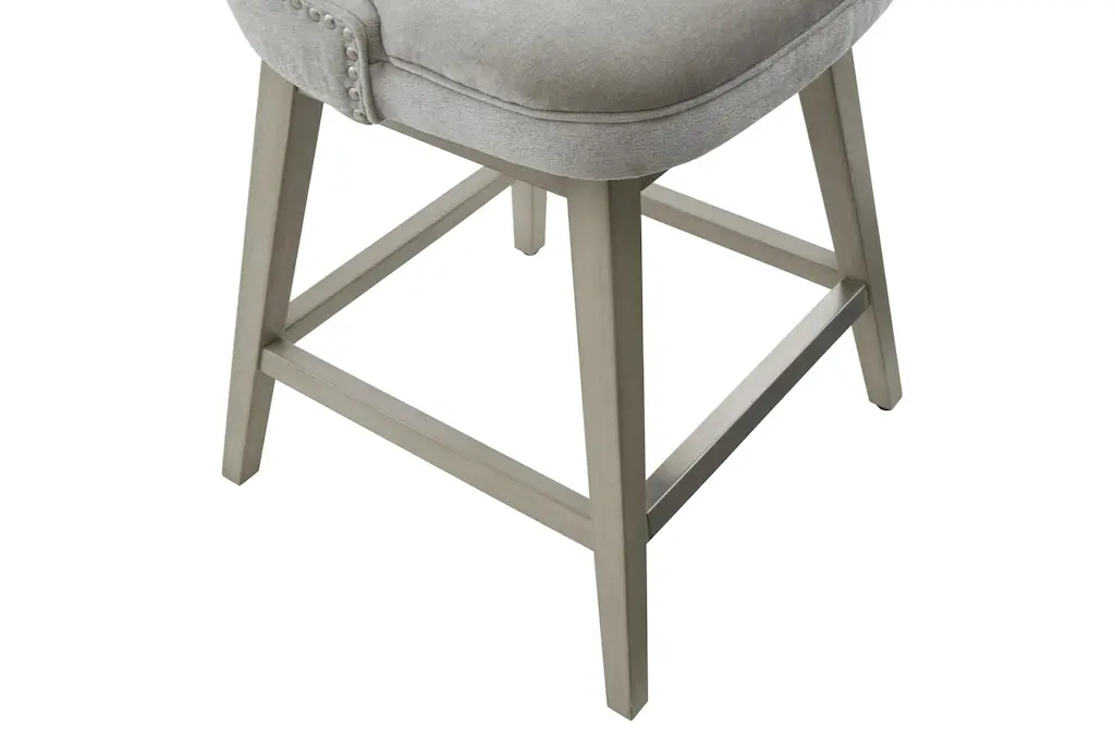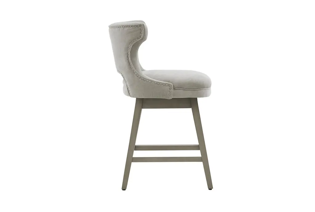 The Julian 26" Swivel Counter Height Stool brings a touch of casual charm to any dining room or kitchen. Its light grey polyester upholstery complements a variety of decor styles, while the sturdy solid wood and plywood frame provide lasting durability. The added nailhead trim and tapered legs offer a subtle yet stylish finish.